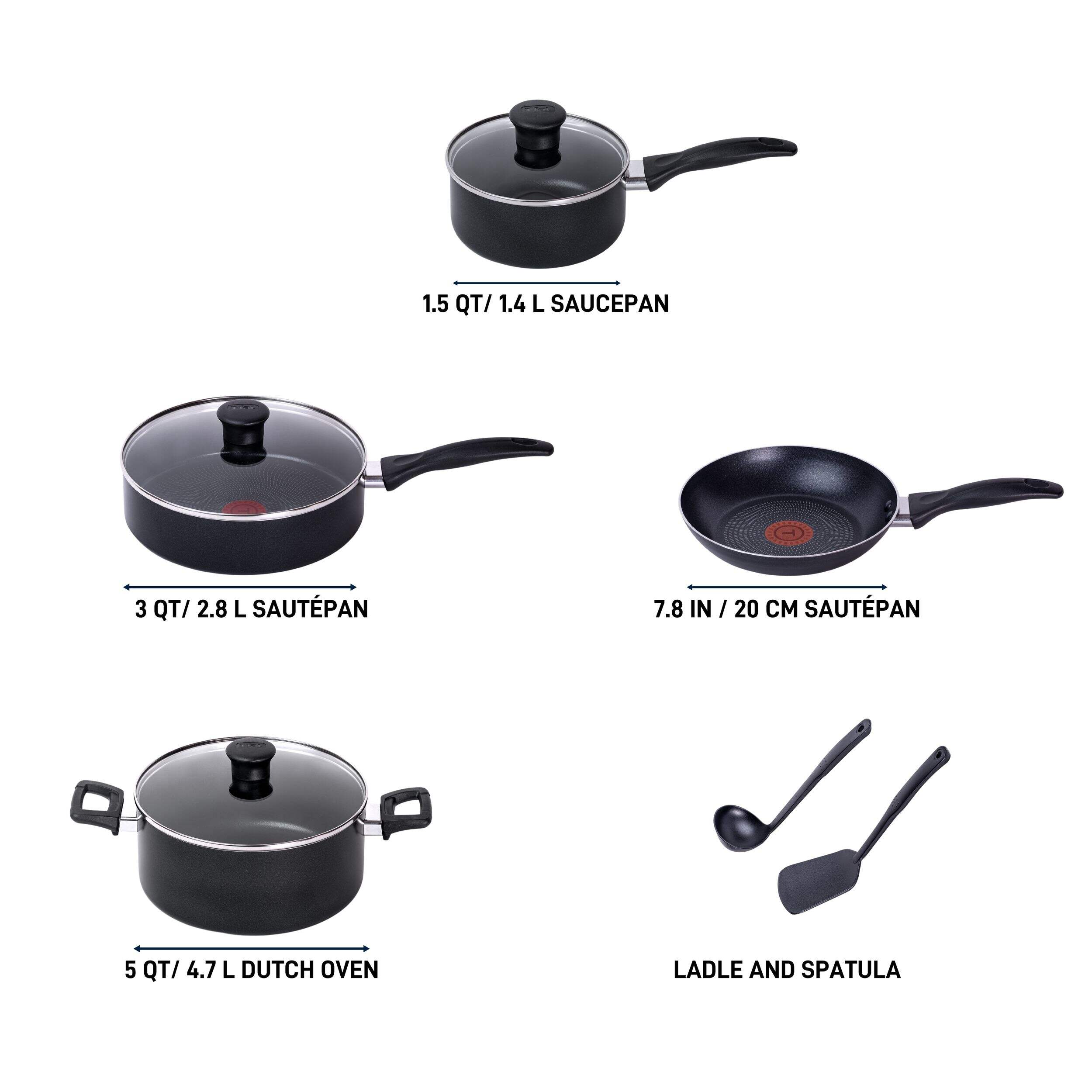 9-piece set includes: 20 cm Frypan, 16 cm Saucepan with Lid, 3 qt Sauté Pan with Lid, 5 qt Dutch Oven, Turner, and Spoon