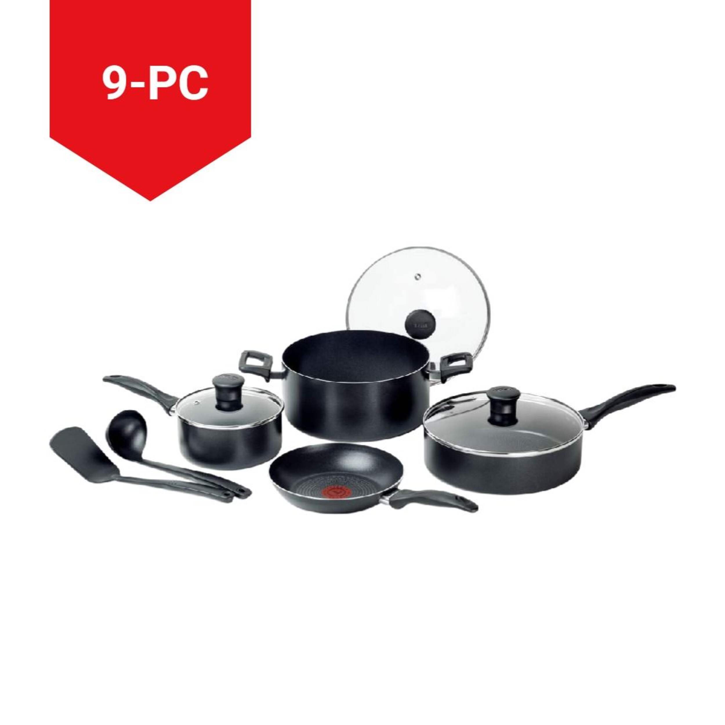 The T-fal Viva Non-Stick Cookware Set offers 9 essential pieces for your kitchen. Its durable non-stick coating allows for easy cooking and cleaning. The Thermo-Spot® technology indicates the ideal temperature to start cooking for better results. With ergonomic Bakelite riveted handles for a steady grip, this oven-safe (up to 350°F/175°C) and dishwasher-safe set is compatible with all cooktops except induction.
