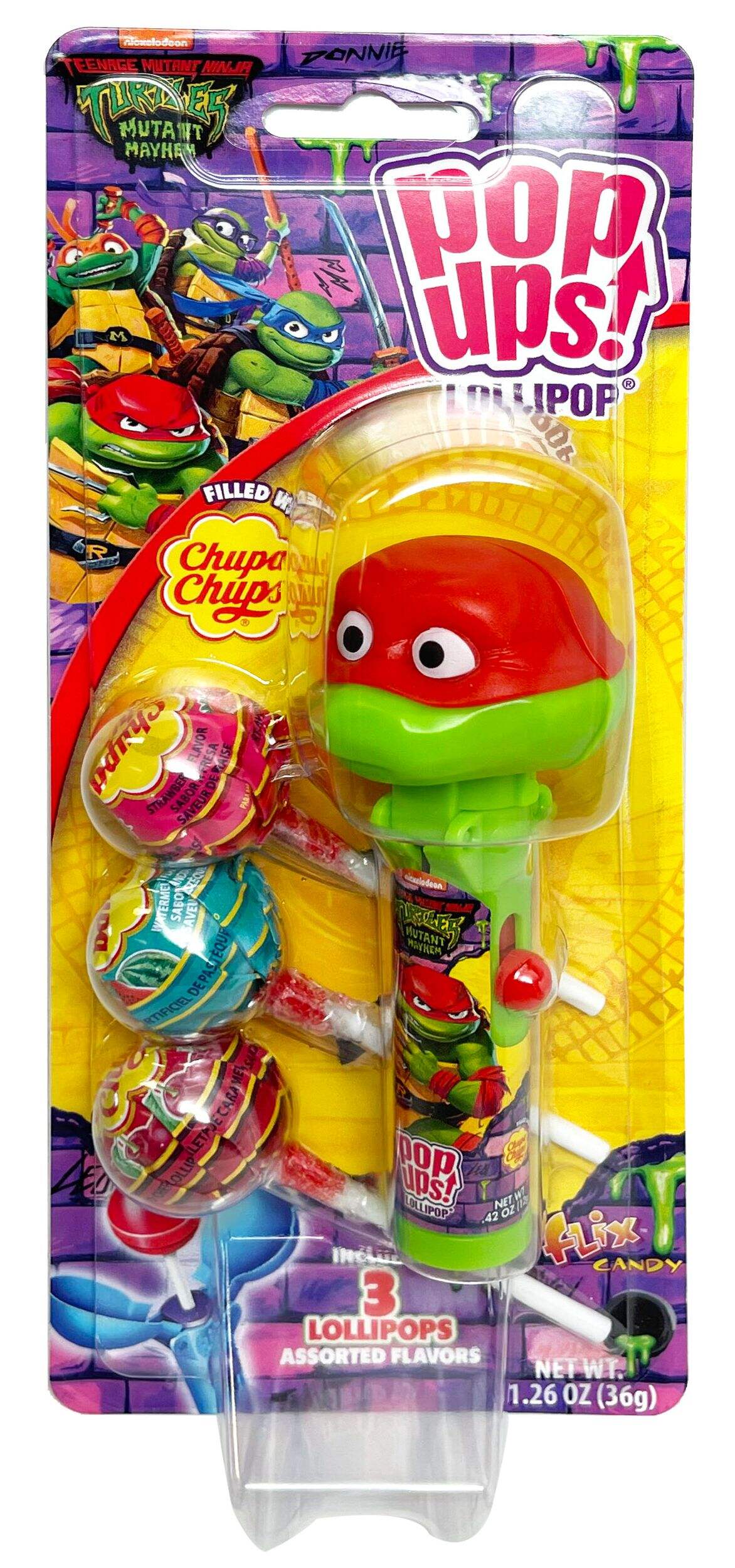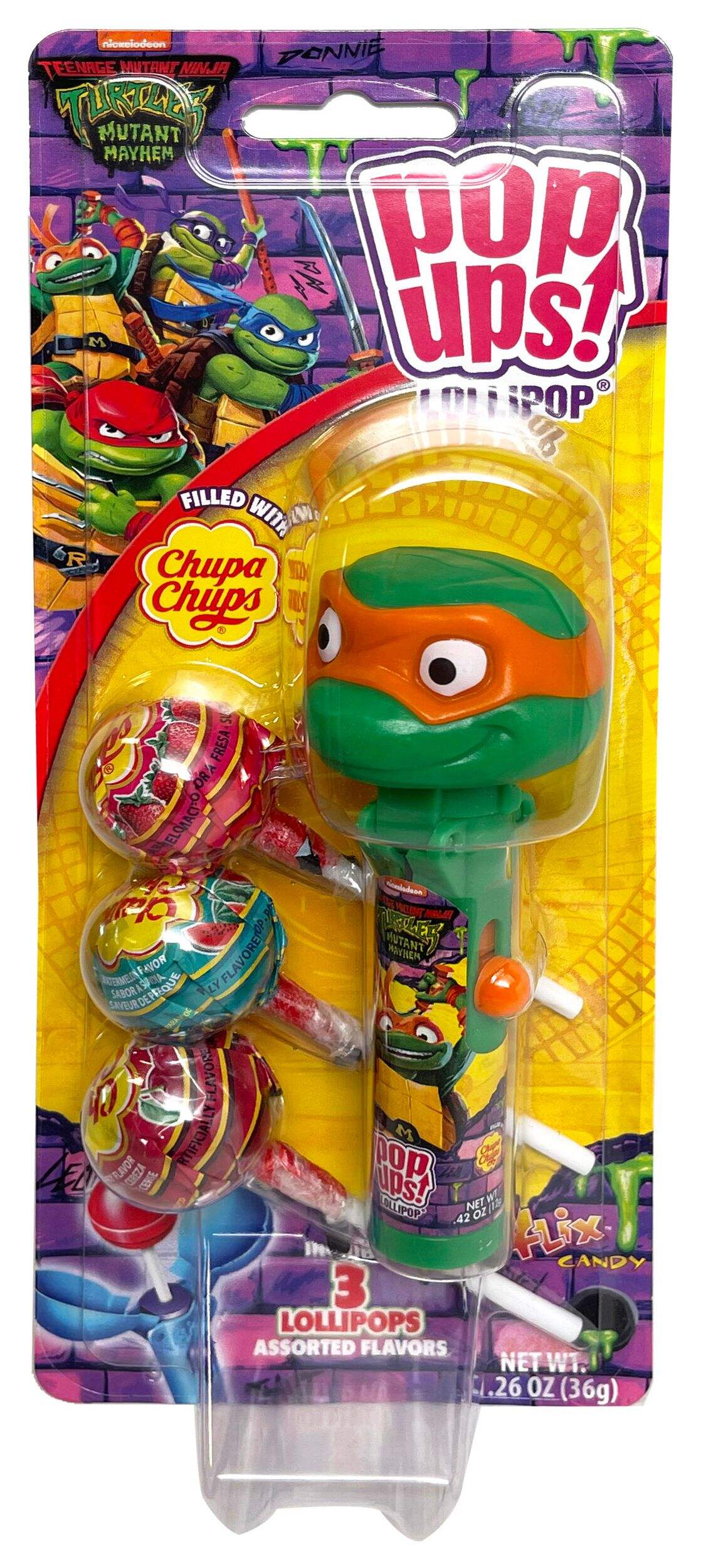 Enjoy a fun and tasty treat with the Teenage Mutant Ninja Turtles Chupa Chups Pop Up Lollipop. Each collectible character comes with three delicious lollipops in grape, strawberry, and watermelon flavours. Perfect for fans of all ages, these lollipops offer a delightful way to enjoy your favourite characters.