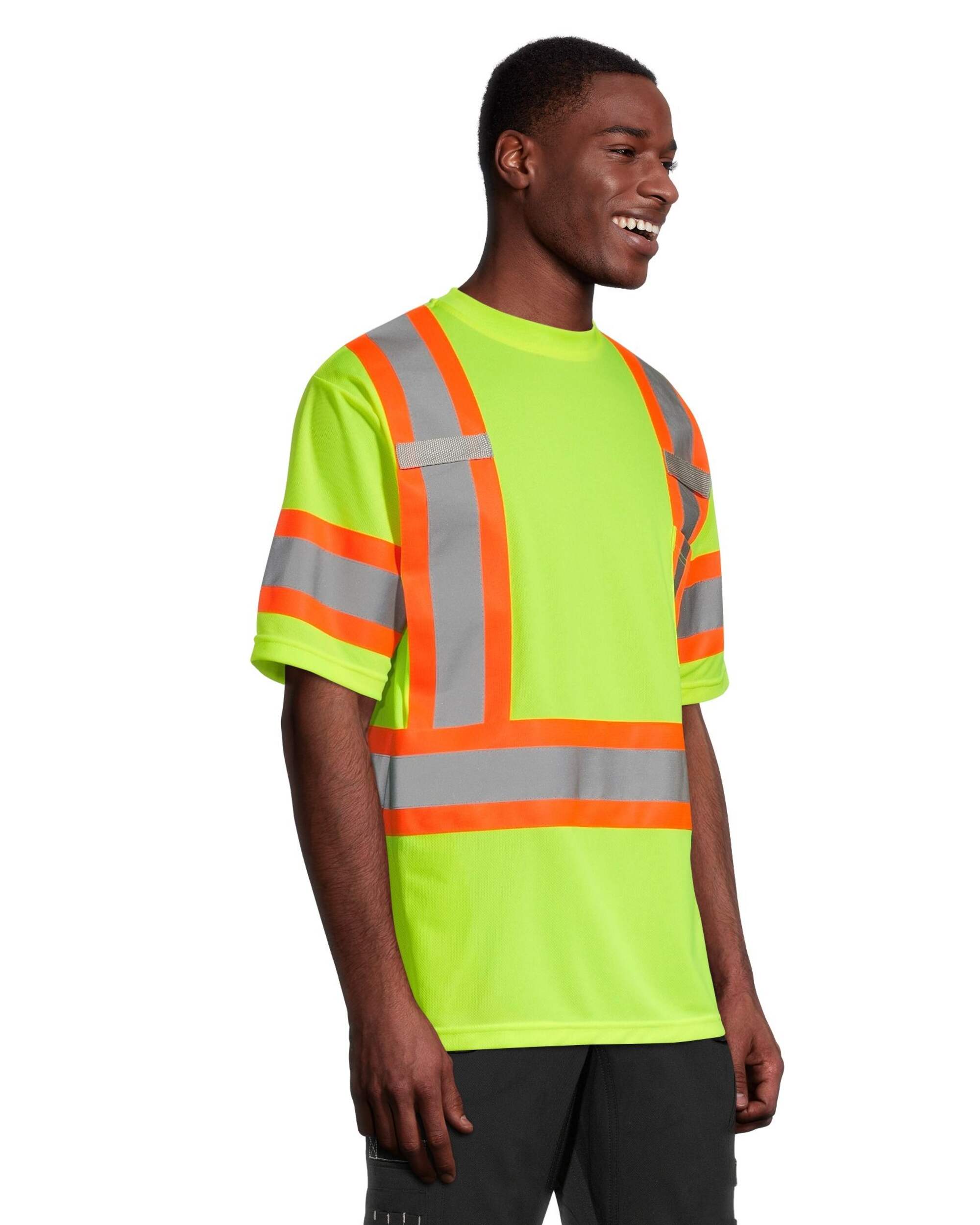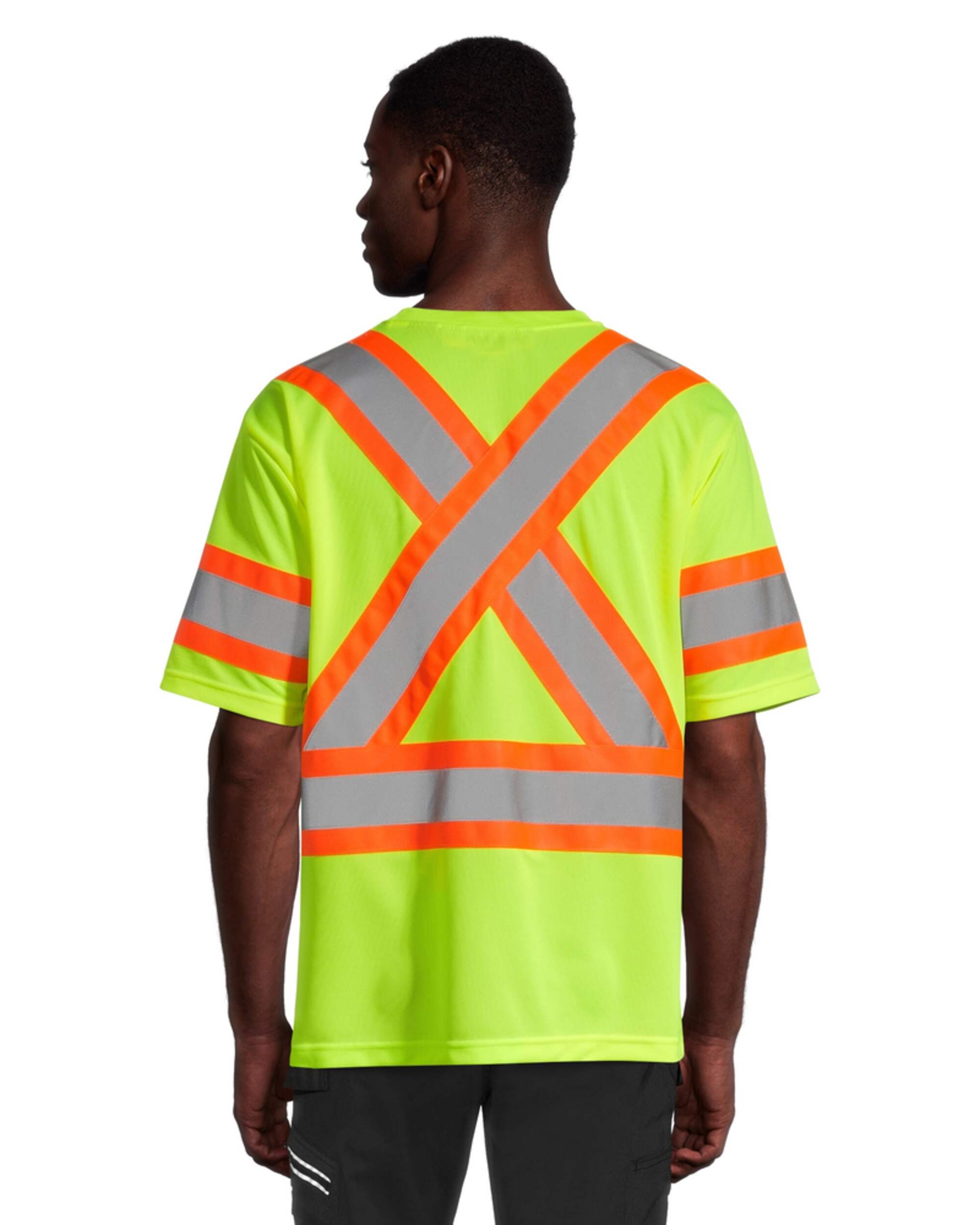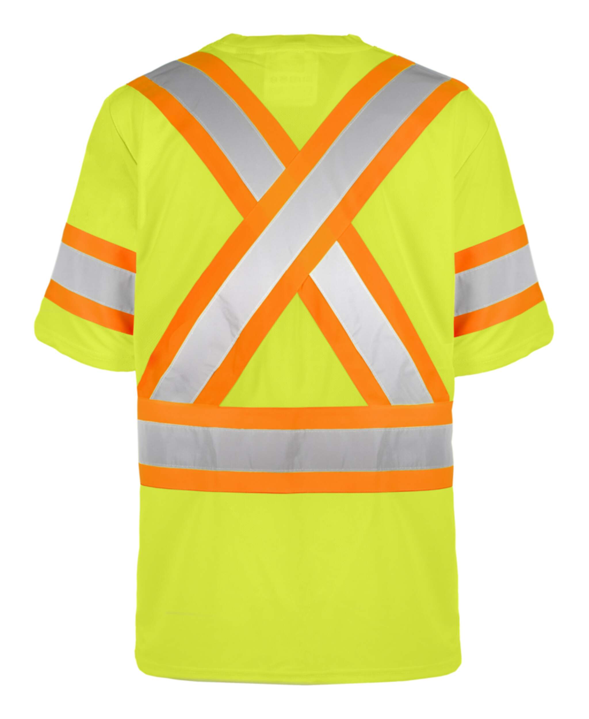 Made from polyester bird’s-eye mesh, this high-visibility short-sleeved T-shirt is equipped with reflective tape over contrast stripes on the front, back, and sleeves for greater visibility. Its sweat wicking system helps keep the garment dry and cool during your most intense work. It is also equipped with a chest pocket and two microphone loops for added convenience.