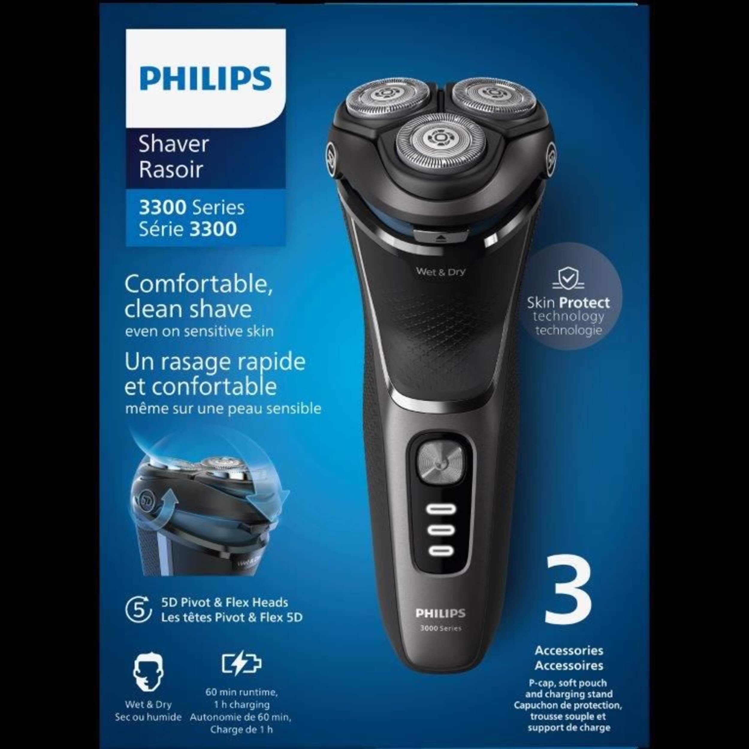 60 minutes of cordless shaving from a full 1-hour charge, ideal for travel or busy mornings
