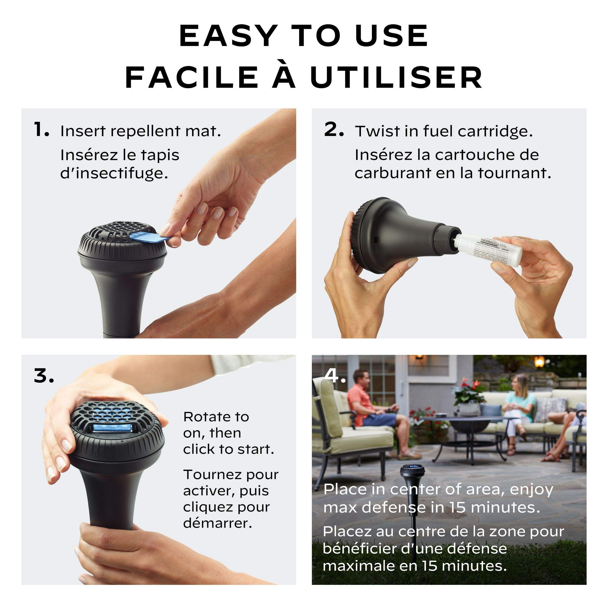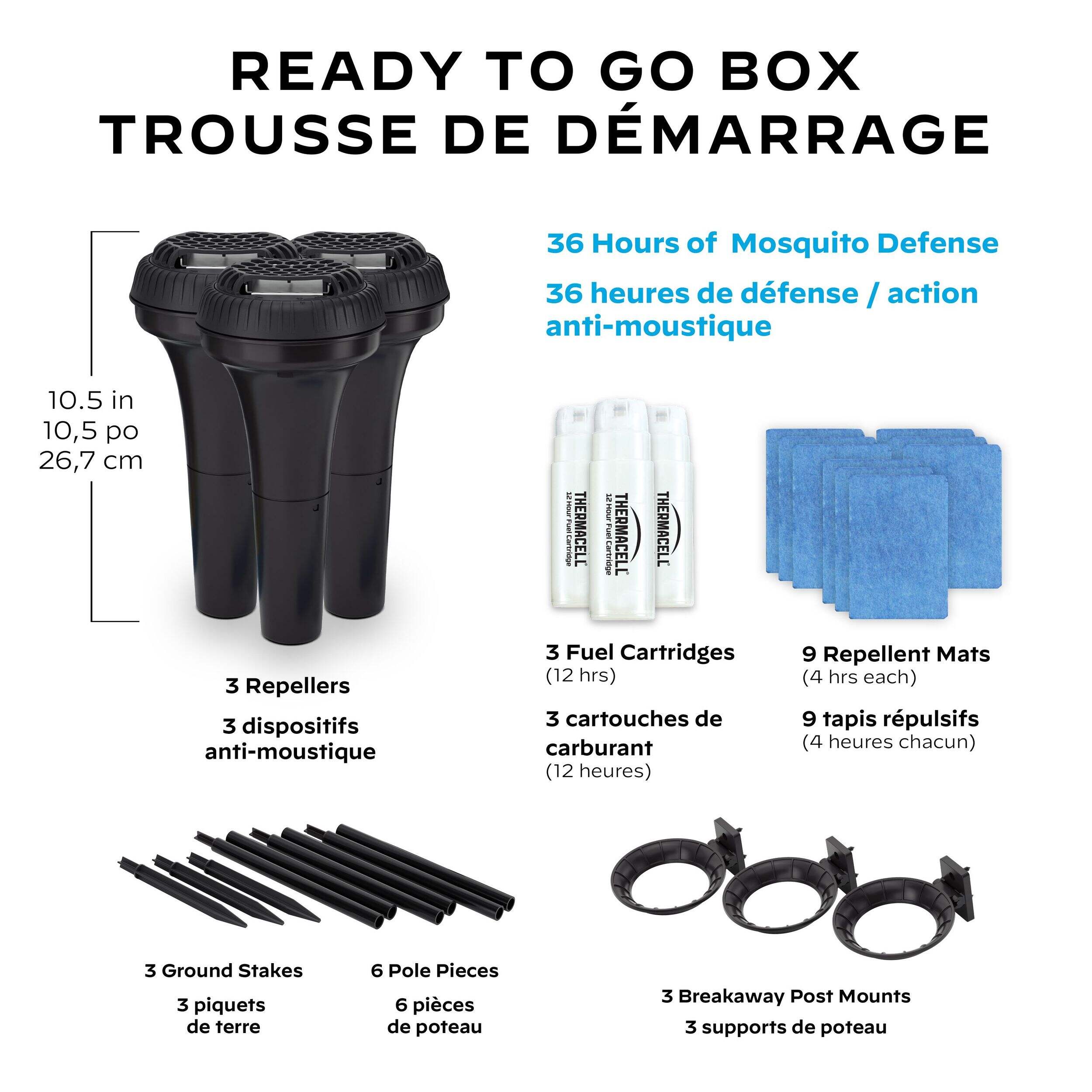 Includes three repellers, three ground stakes, three breakaway post mounts, six pole pieces, three 12-hour fuel cartridges and nine 4-hour repellent mats