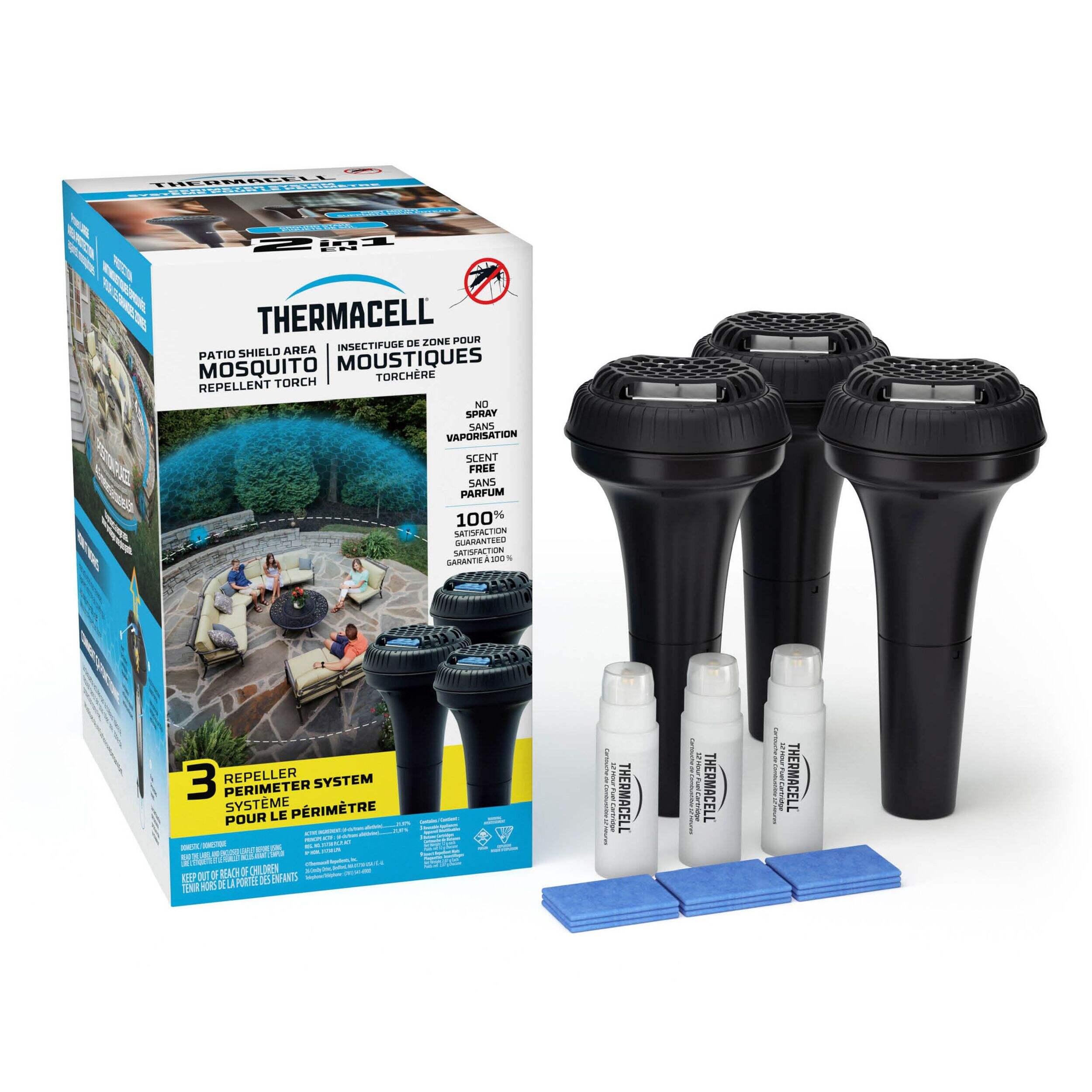 For the backyard and beyond, the Thermacell Perimeter System is easy to install, and the 3-pack provides 675 sq. ft (62,7 sq. m) of advanced mosquito defense. Scent-free and mess-free; the Perimeter System is ideal to surround your backyard, patio, or pool with discreet mosquito defense. Simply plan out the Perimeter around your entertaining area, insert a fresh cartridge and mat, and enjoy hours of distraction-free fun. Dual and flexible mounting options for landscape or deck applications using the included stakes or mounts. Place a repeller every 15 ft (4,5 m) to create your continuous defense area. Simply add additional systems to defend even larger areas.