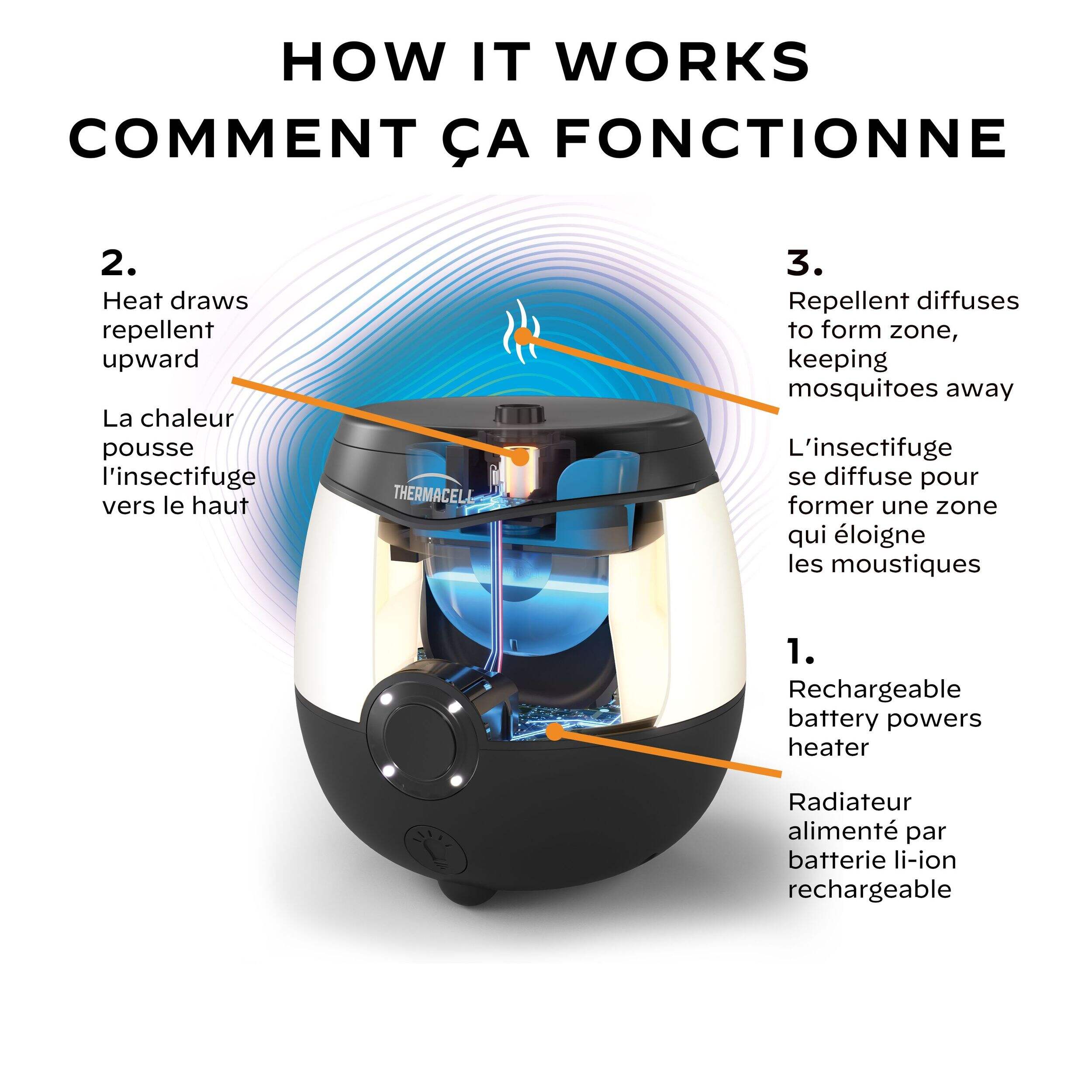 Mosquitoes ruin everything. Thermacell’s award-winning technology keeps mosquitoes away by creating a 20FT/6M defense zone around you. Our proprietary formula precisely targets mosquito sensors, driving them away. With consistent defense that doesn't weaken over time, Thermacell helps you live your best outside life without the use of bug sprays or lotions on your skin. Features a 9-hour rechargeable battery. Provides ambient dimmable light from 50-200 lumens. Allowed to bring on Airplanes. 12 hours of mosquito repellent included.