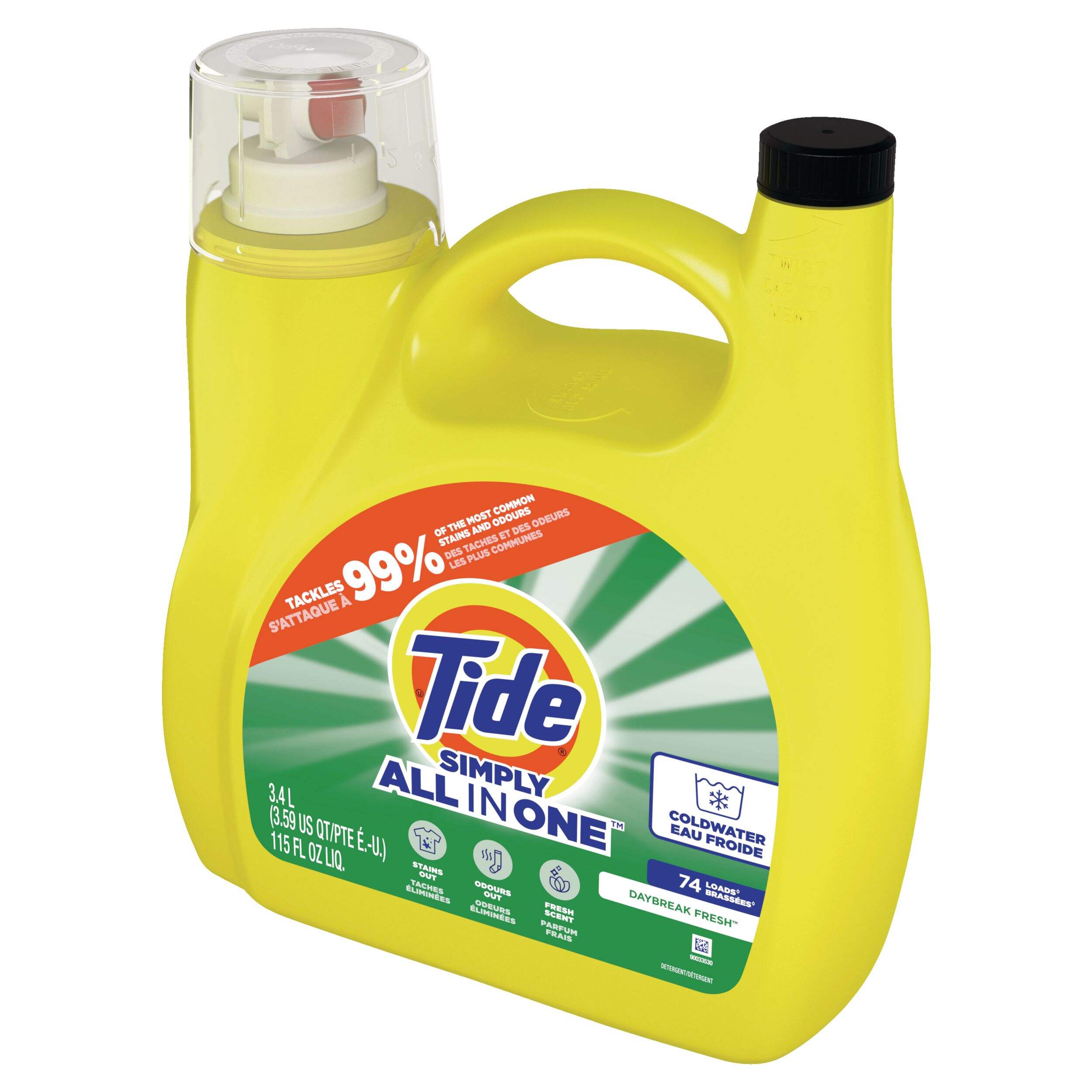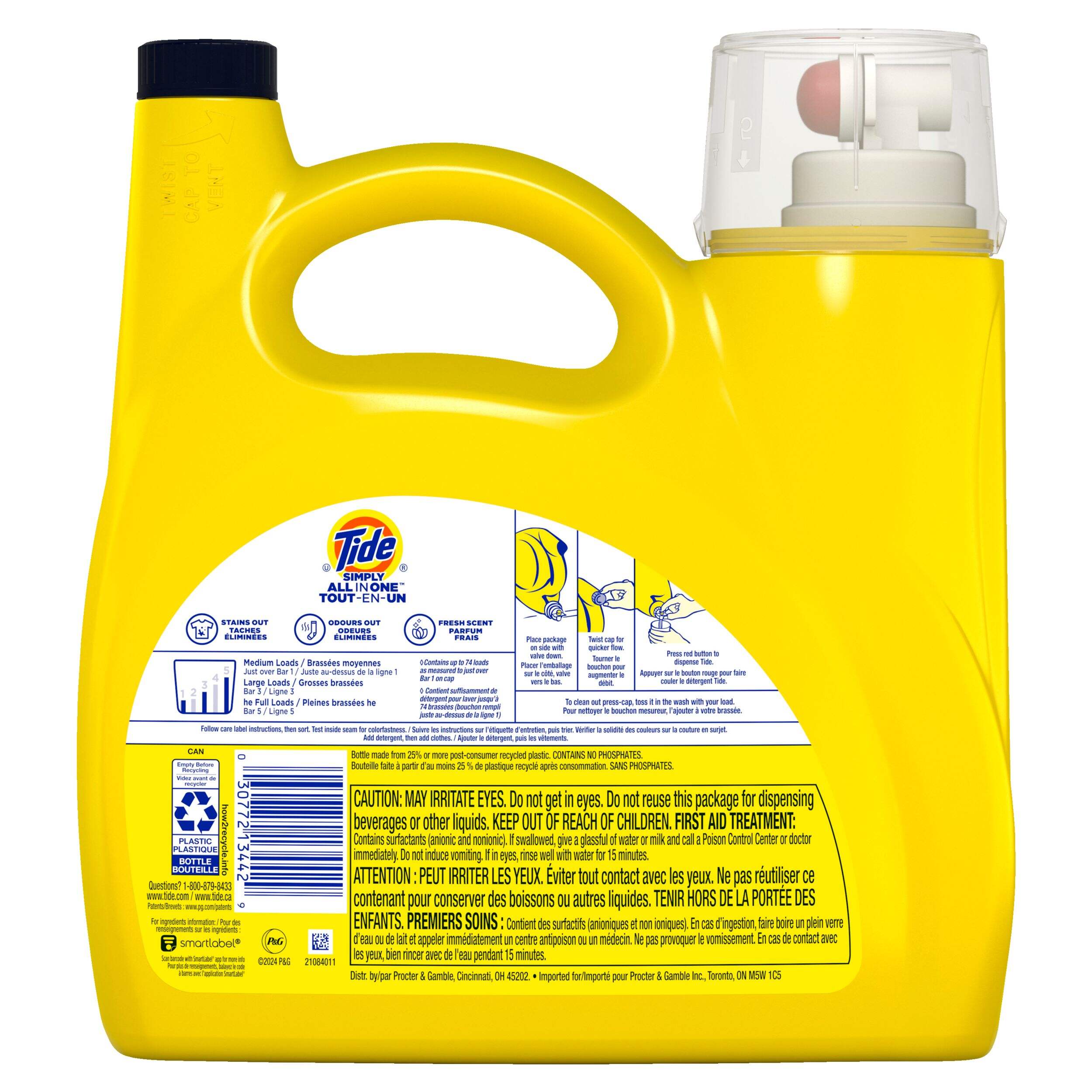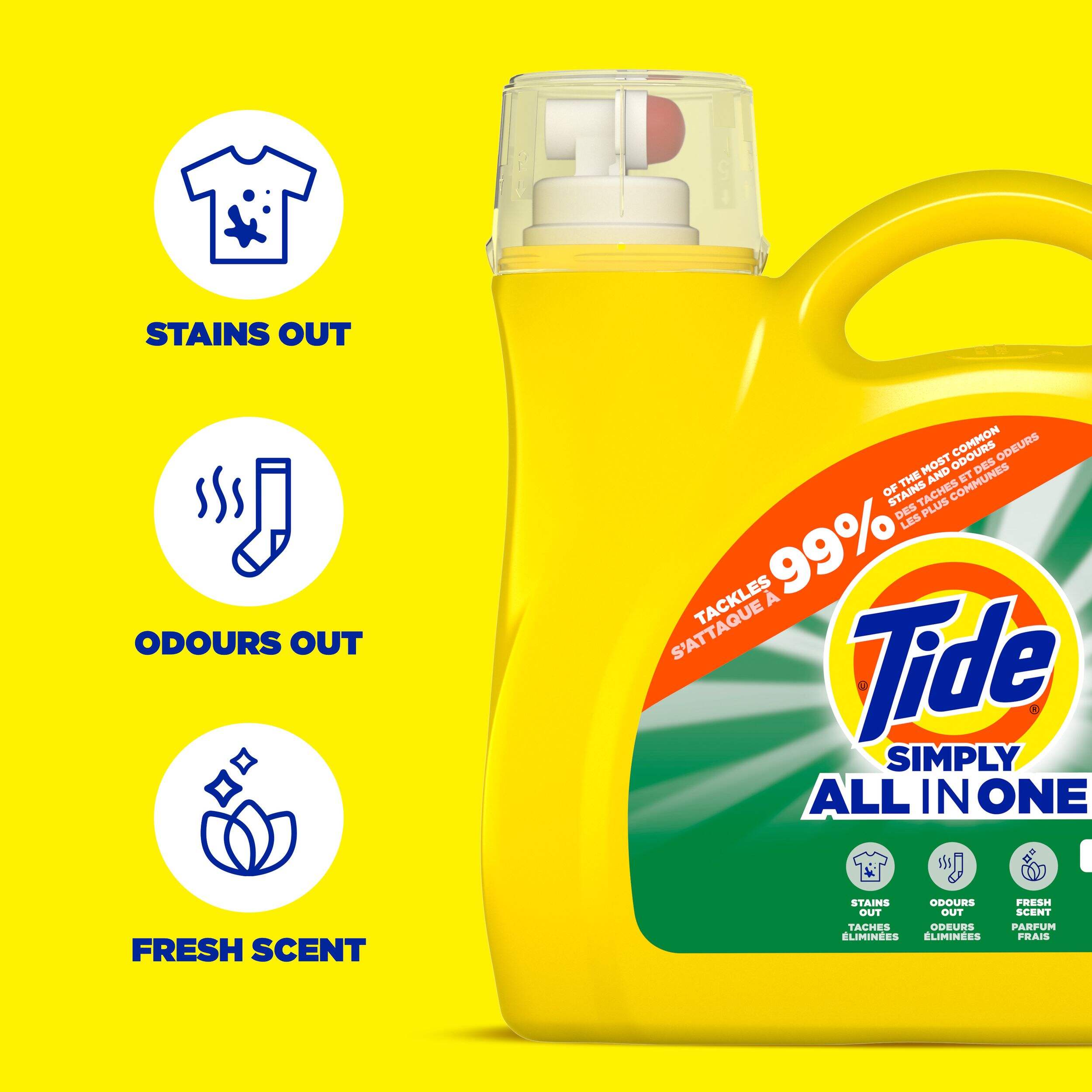 Experience the right clean at just the right price with Tide Simply All-In-One. Tide Simply All-In-One Liquid Laundry Detergent fights dirt and tough odours deep in the fibres of your clothes. That means you only need one wash to get the job done. No pretreating necessary! And because it's part of the Tide family, you can expect a consistent, quality clean every time you throw a load in the wash. Tough on odours and easy on your wallet, Tide Simply All-In-One Liquid Detergent gives you the clean and fresh results you’re looking for every time you do laundry.