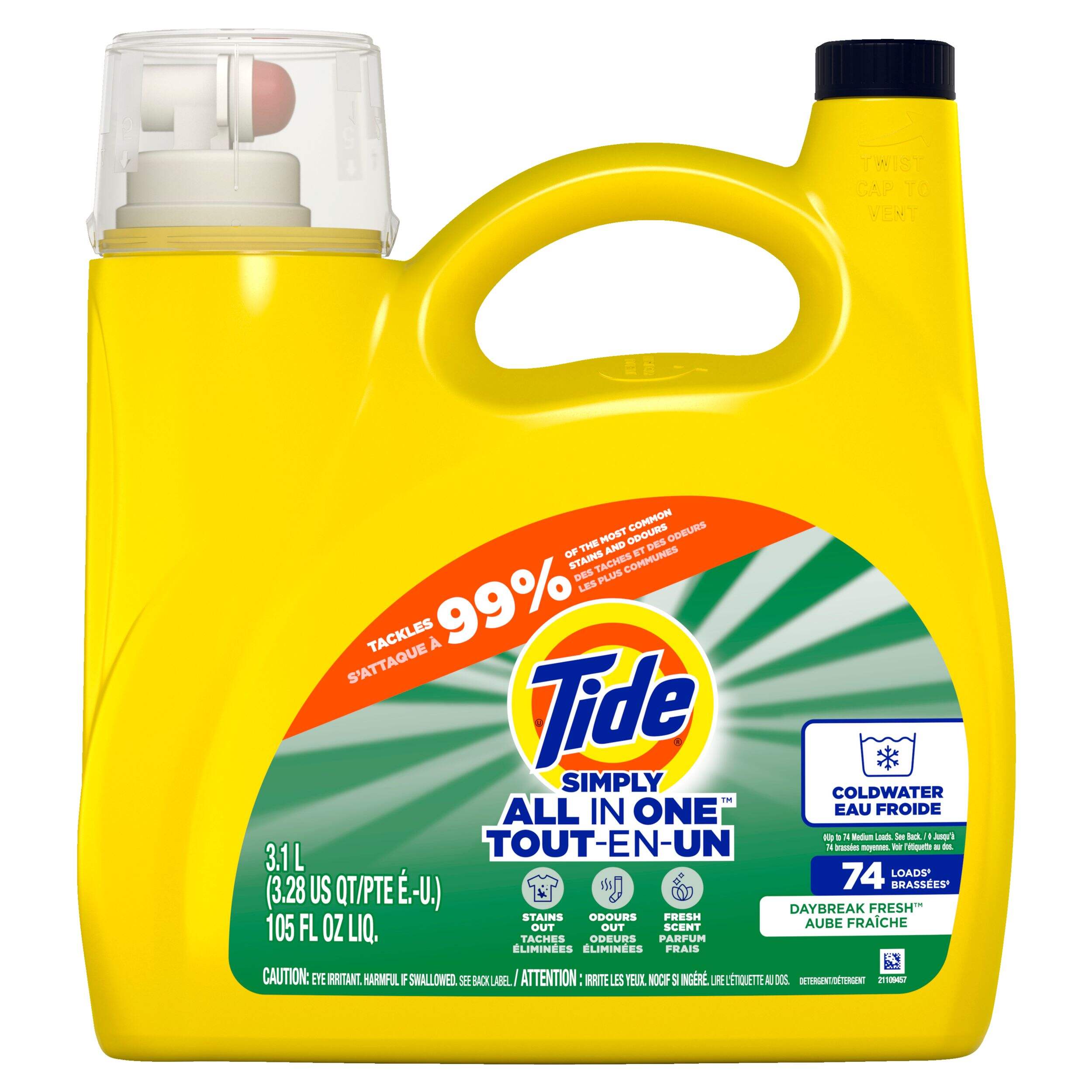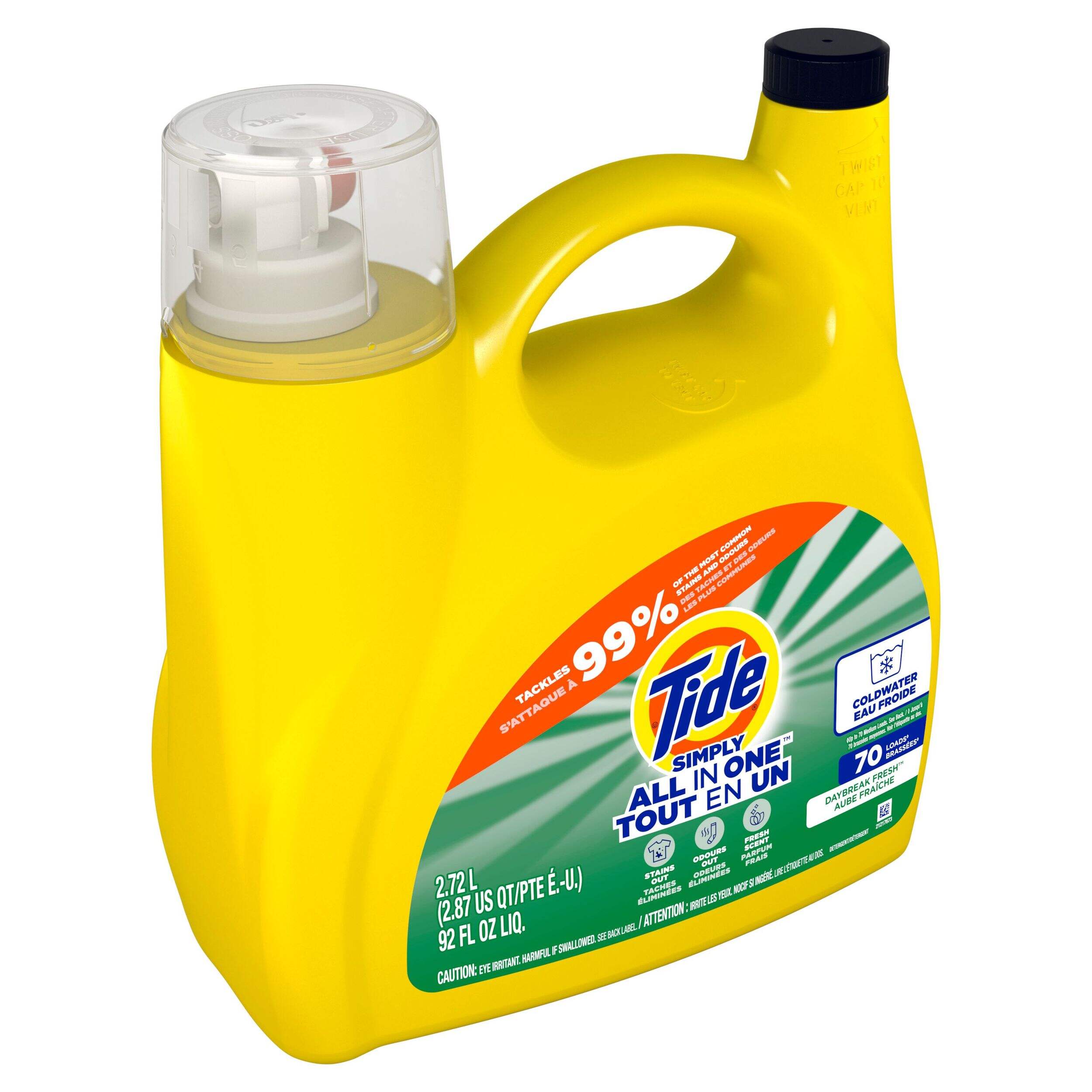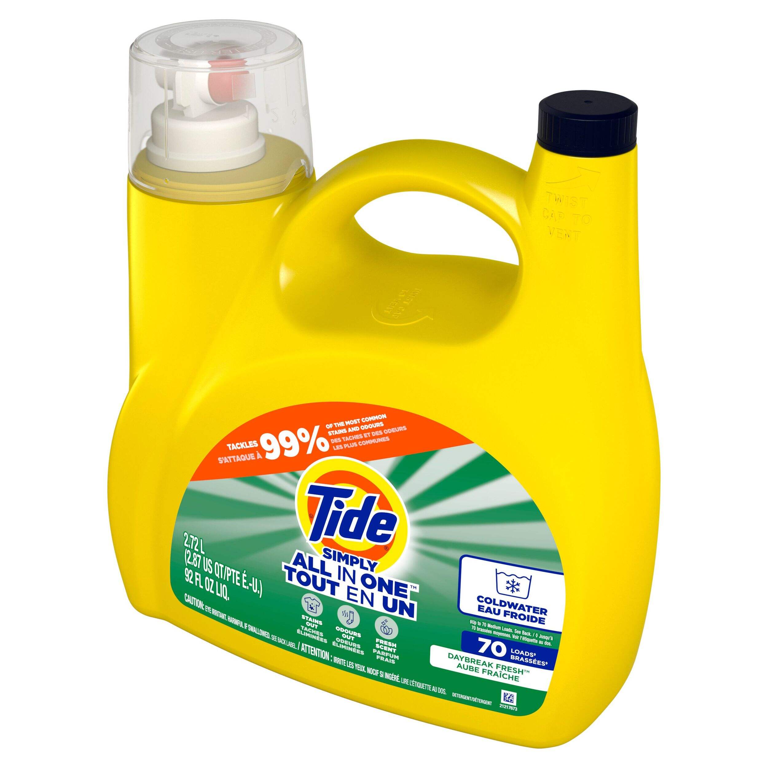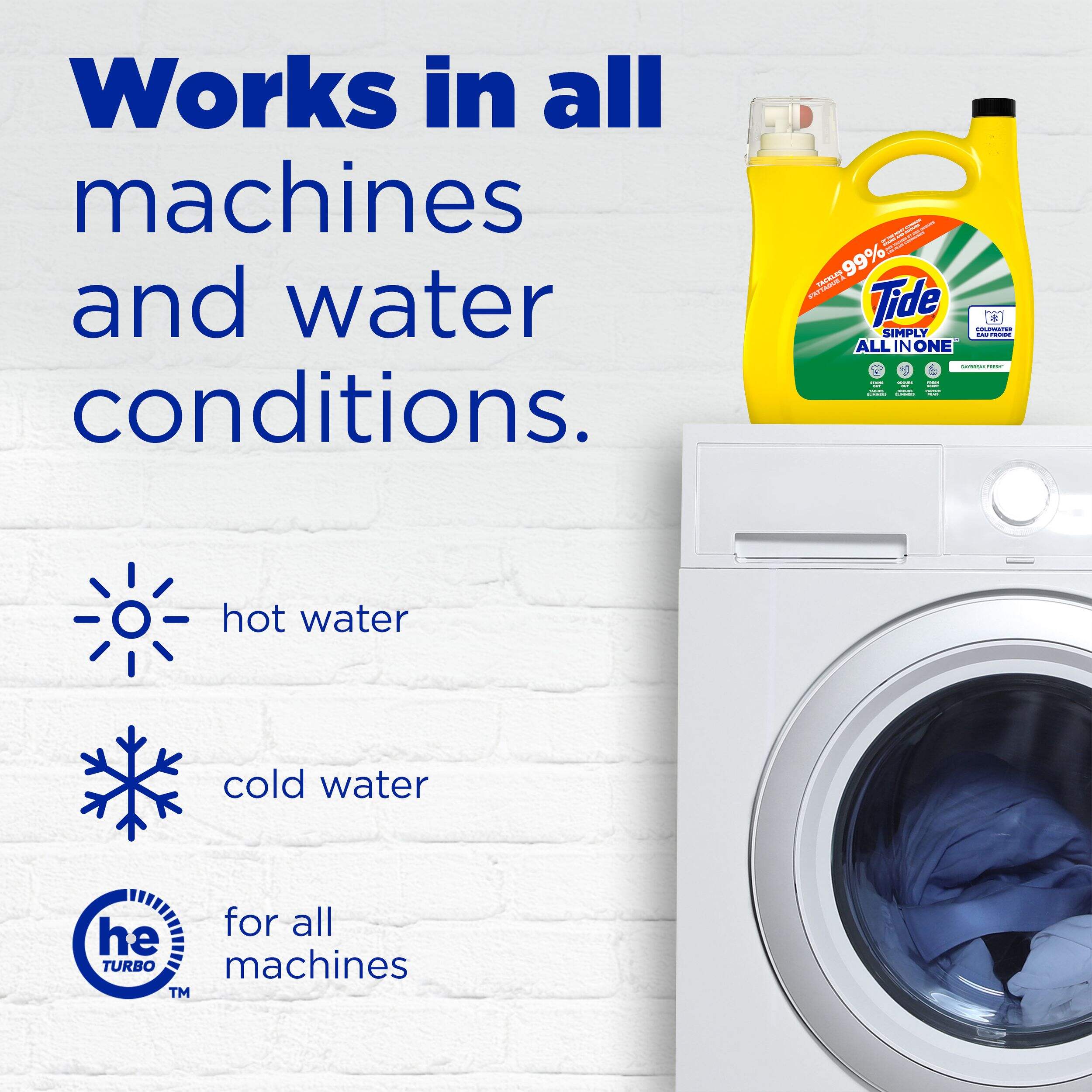 Experience the right clean at just the right price with Tide Simply All-In-One. Tide Simply All-In-One Liquid Laundry Detergent fights dirt and tough odours deep in the fibres of your clothes. That means you only need one wash to get the job done. No pretreating necessary! And because it's part of the Tide family, you can expect a consistent, quality clean every time you throw a load in the wash. Tough on odours and easy on your wallet, Tide Simply All-In-One Liquid Detergent gives you the clean and fresh results you’re looking for every time you do laundry.