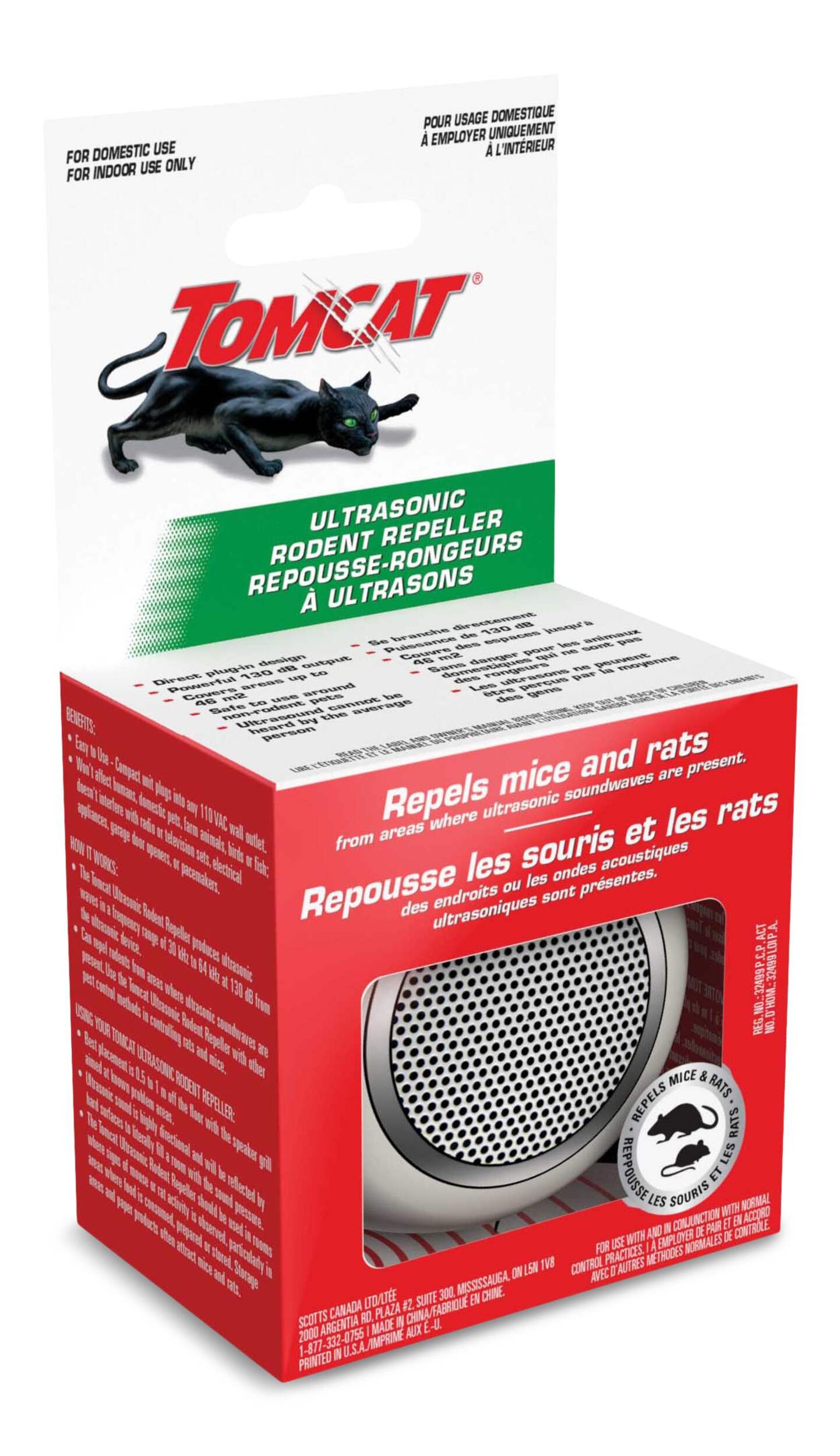 It’s only natural to eek, shriek, or make some noise at the sight of a mouse or rat. Return the favour by creating an acoustically hostile environment for rodents with Tomcat® Ultrasonic Rodent Repeller. This plug-in device provides ultrasonic waves in a frequency range of 30 kHz to 64 kHz at 130 dB that cannot be heard by the average person. Can repel mice and rats wherever ultrasonic waves are present. Won’t affect you or your pets. Doesn’t interfere with everyday appliances and devices, including TVs, garage door openers, or pacemakers. Plugs into any 120 VAC wall outlet, too. Ideal for homes, apartments, boats, RVs, domestic kennels, stables, and even in areas where food is stored, prepared, or eaten.