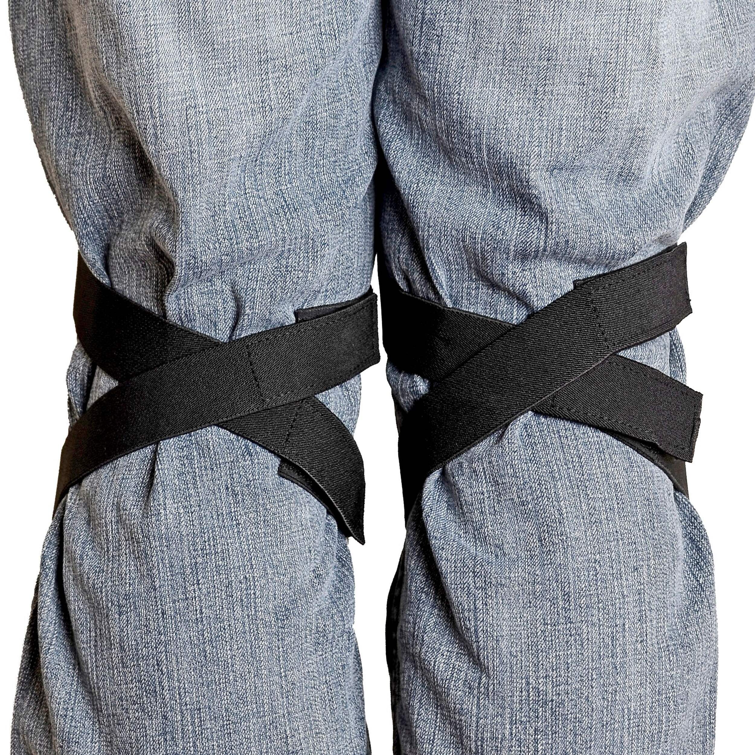 Criss cross elastic straps with hook and loop fasteners to secure kneepads in place without binding behind the knee
