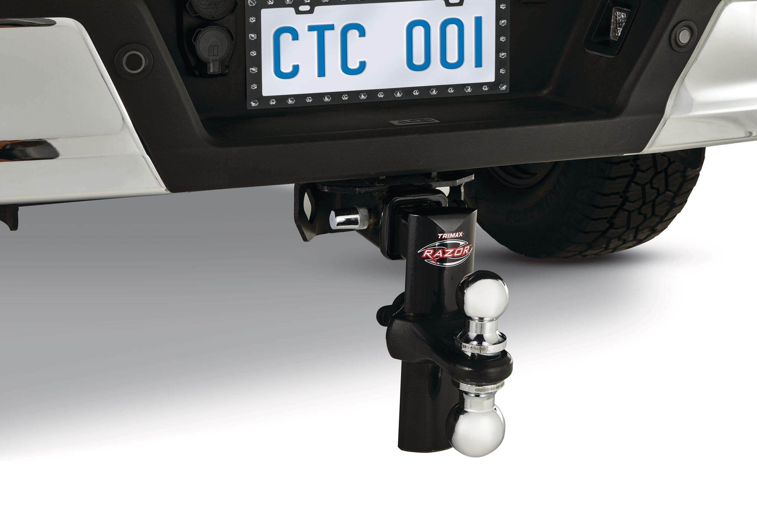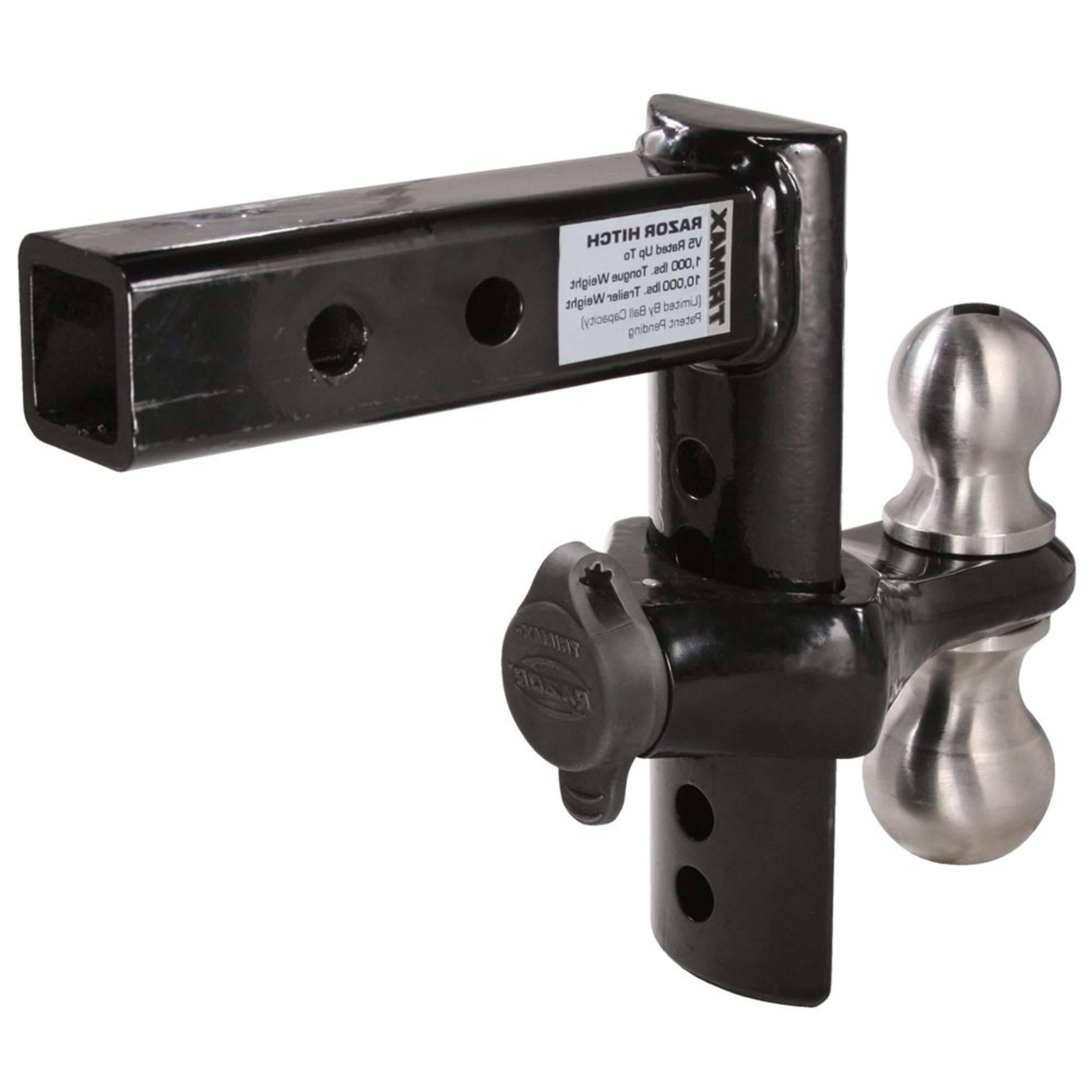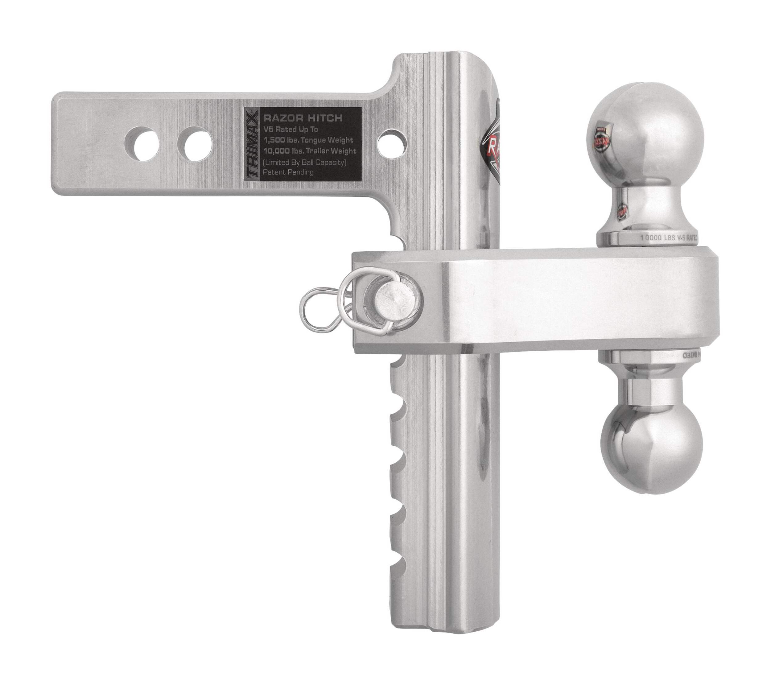 The Trimax Razor Adjustable Tow Hitch is engineered for versatile towing with a durable forged steel construction, offering a 10,000 lb tow rating and 1,500 lb tongue weight capacity. Its 8-in drop adjusts in 1-in increments, optimizing towing angle and clearance. The included receiver lock enhances trailer security, while the heavy-duty design supports tasks from boat launching to equipment transport. Perfect for anyone needing reliable, adaptable towing performance in demanding conditions.