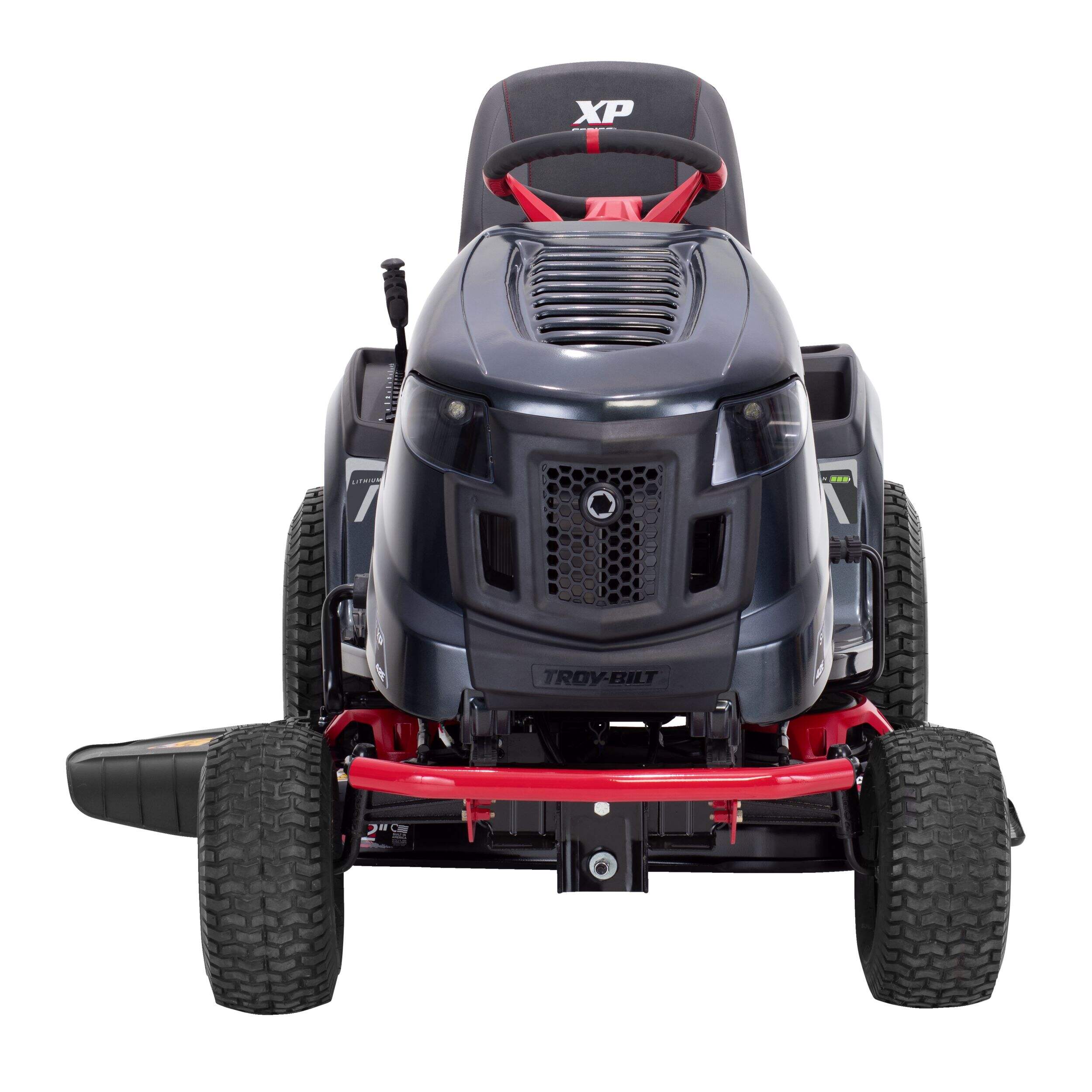 The Troy-Bilt 56V Lithium-Ion Electric Riding Lawn Tractor, 42-in, gets the job done with its powerful battery operated brushless motor, allowing you to mow up to 3.5 acres on a single charge of up to 1.5 hours. The large step-through frame makes getting on and off simple, while the adjustable high back seat provides comfort. The rear hitch allows for quick attachment of tow-behind accessories like dump carts, spreaders or aerators, sold separately. Best of all, the battery power means a noise reduction of up to 65% quieter than gas powered mowers,so you can mow anytime of day.