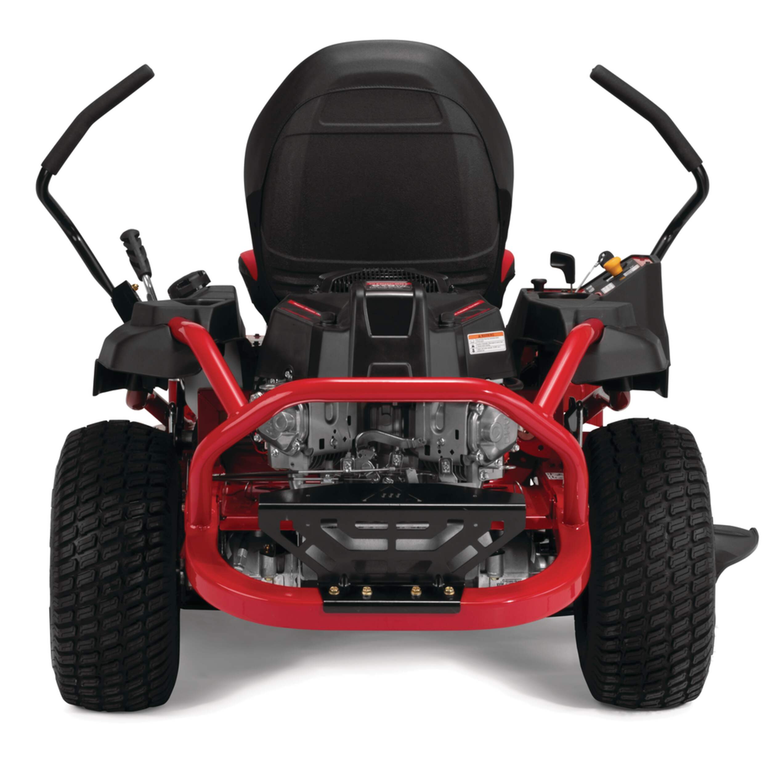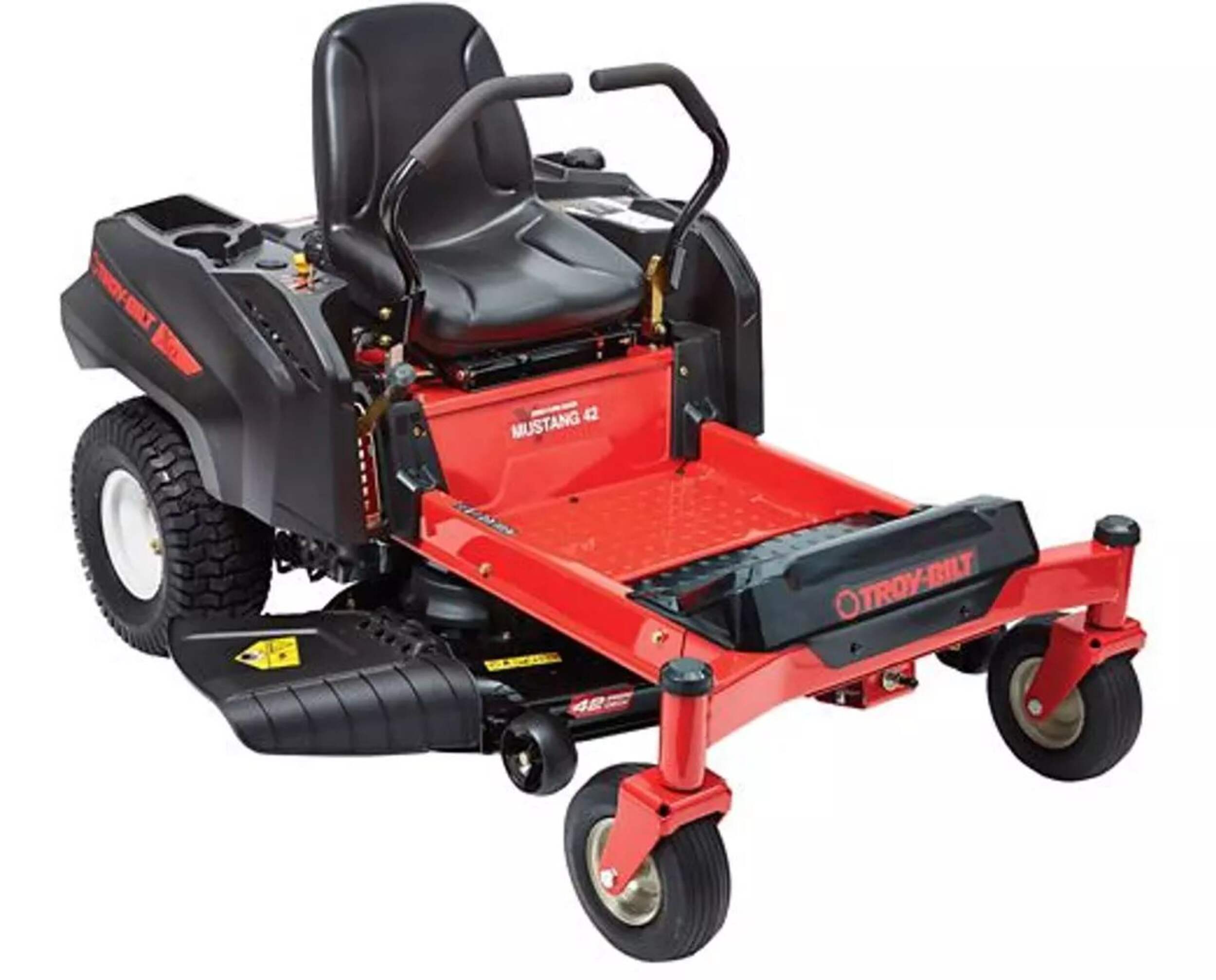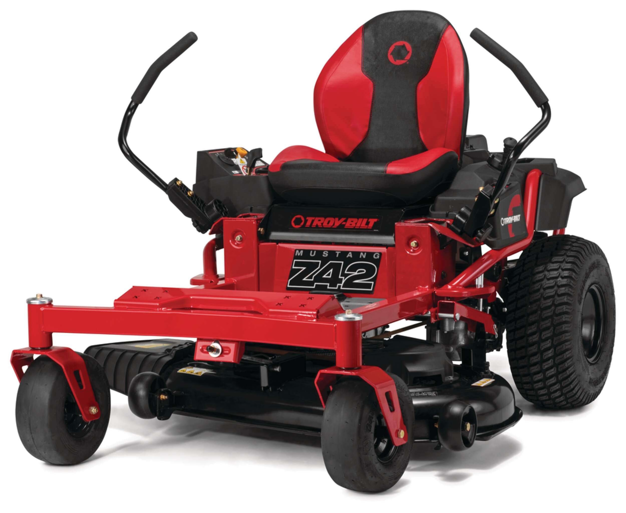 The Mustang Z42 features a 679cc Troy-Bilt twin cylinder engine that provides plenty of power to mow larger lots or for extended periods of time. This residential-use zero-turn rider is ideal for larger, flat to slightly hilly yards and is designed to reduce mowing time by turning on a dime with the dual hydrostatic transmission and lap bar steering controls. Reduce lawn turfing with the added support of 2 deck wheels and make clean up easier with the integrated deck wash adaptor.