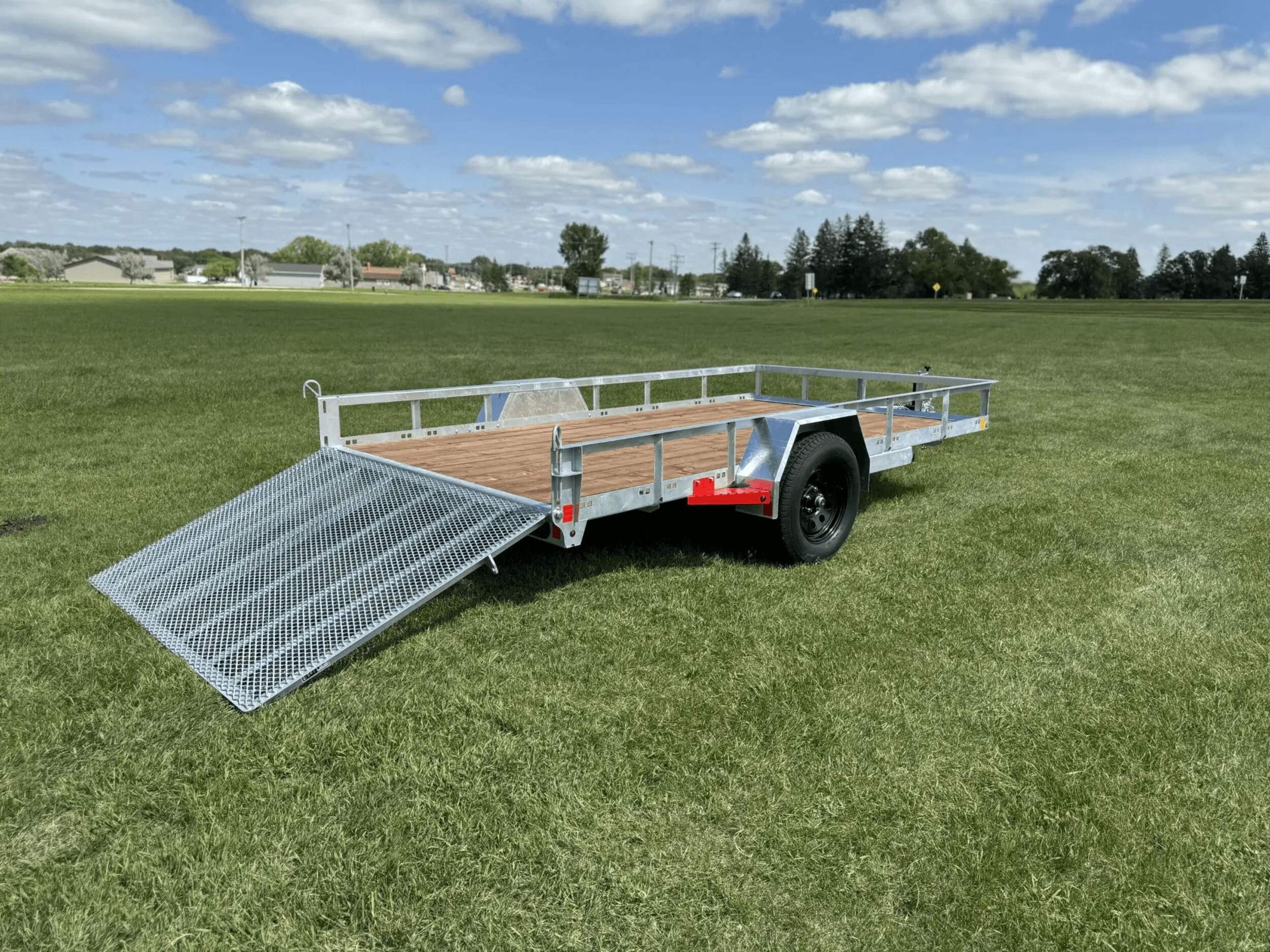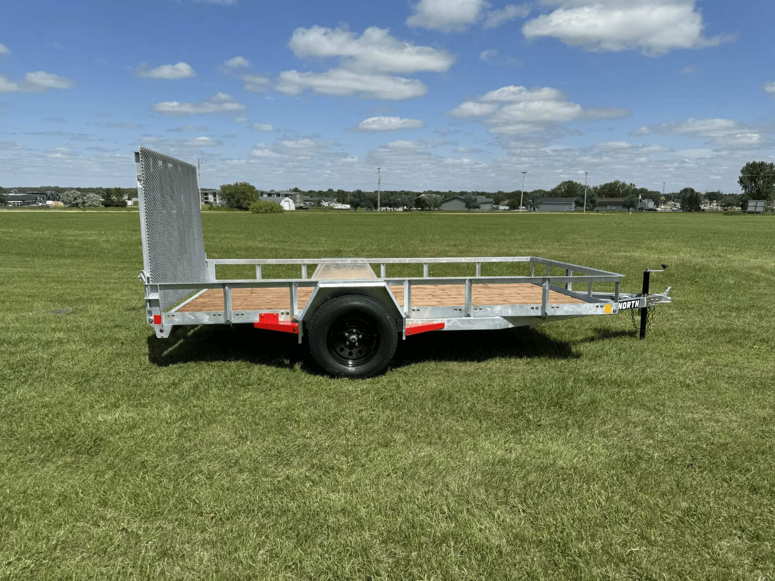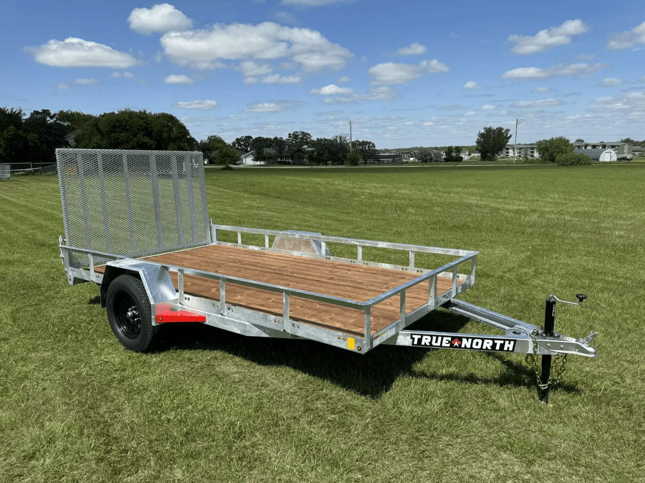 Transport your largest loads safely and securely with the True North 77-in x 12-ft Utility Trailer With Gate. This generously sized trailer is constructed from durable, rust-resistant steel with a treated wood floor to provide superior strength for heavy loads. The utility trailer is ideal for transporting a variety of materials or equipment and provides a robust, practical solution for your transportation needs.