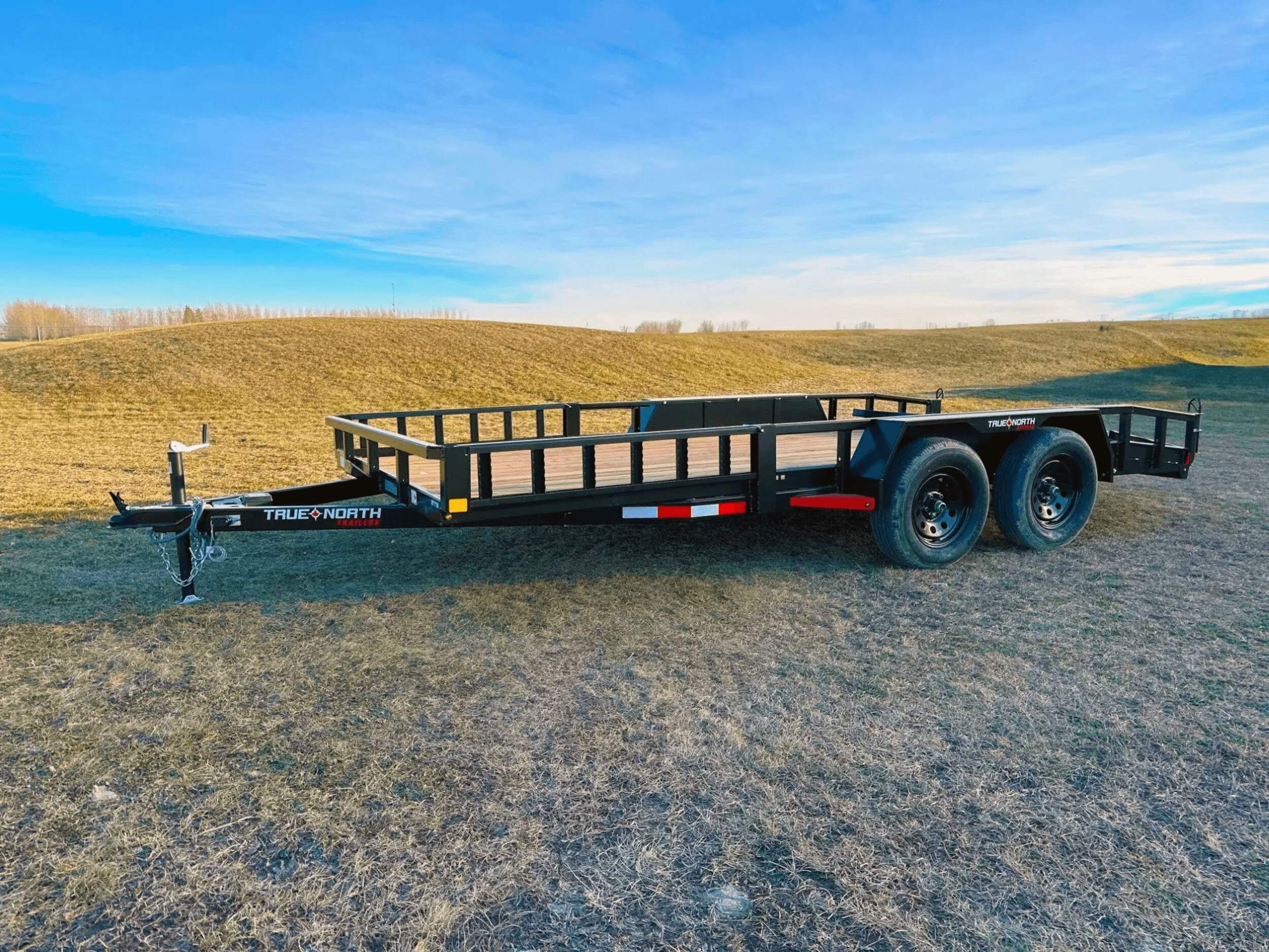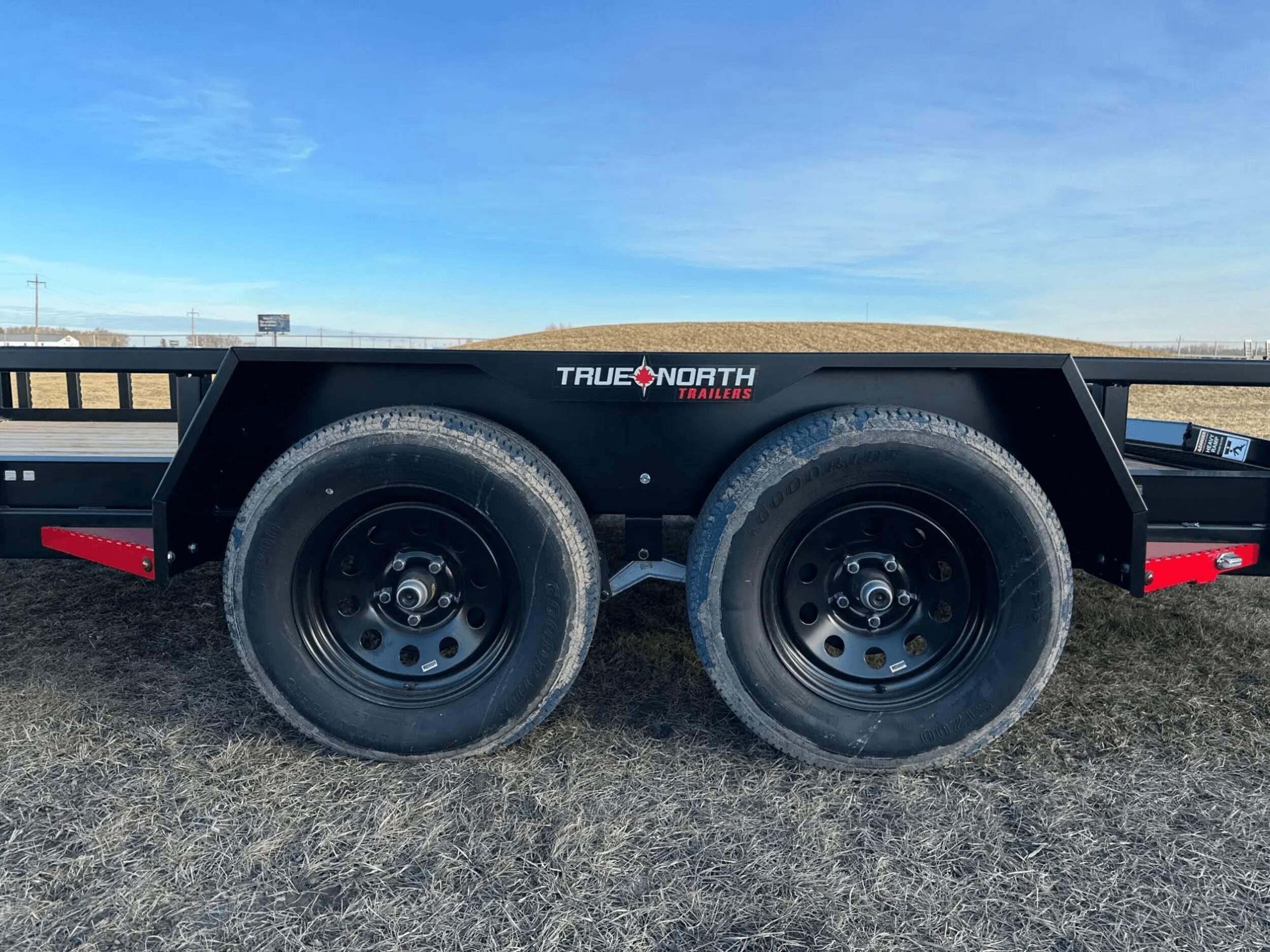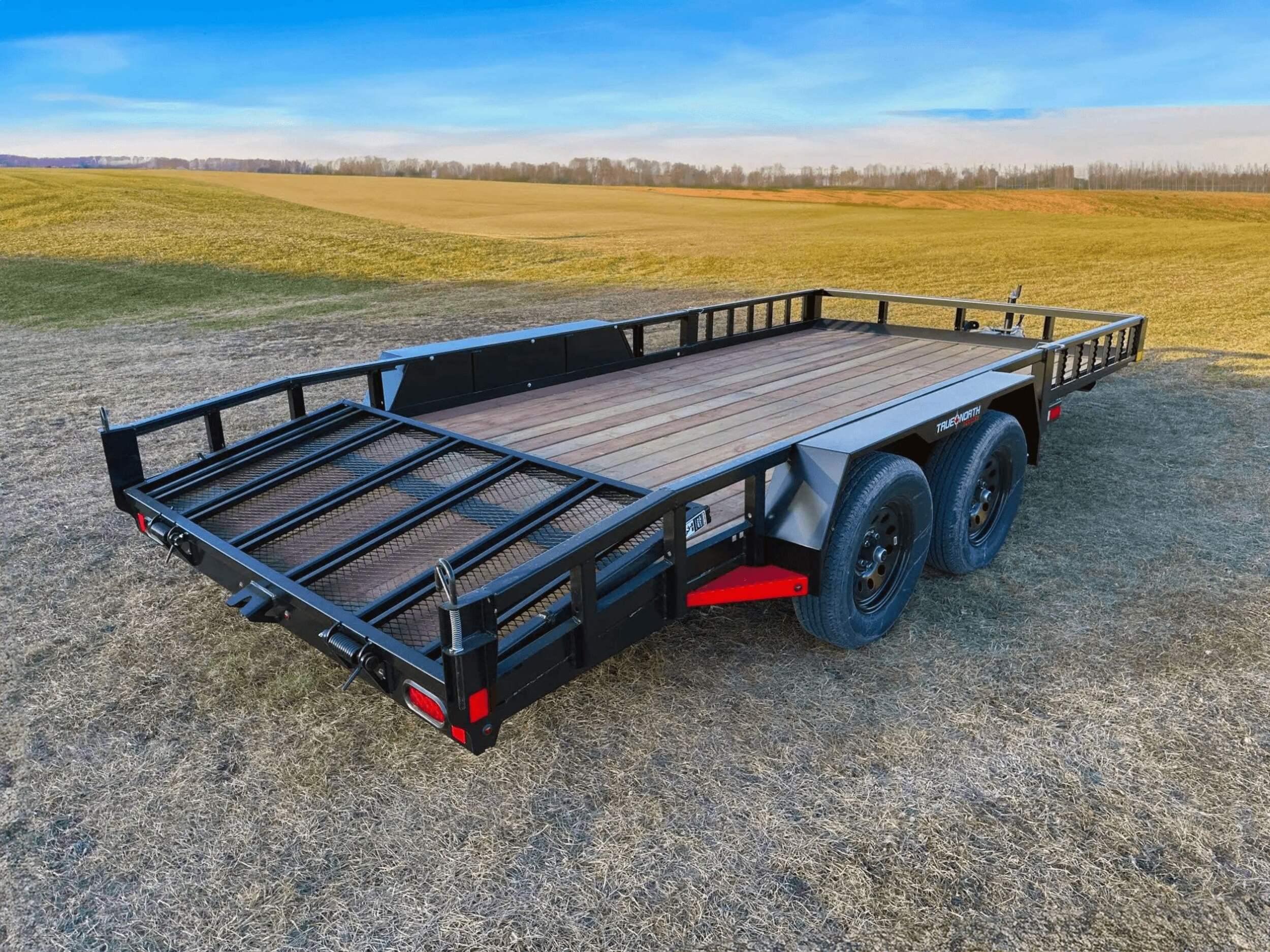 The True North 83-inch by 16-foot Tandem Axle Utility Trailer in black is built tough for hauling heavy loads. This durable trailer features a treated wood floor rated for 5,200-pound max payload. It includes a powder coated finish, steel fenders, removable ramps, and a 2-inch A-frame coupler with a lockable latch for secure towing. The fold-in rear gate provides easy access, while the included top wind jack offers stability when loading and unloading. Note that registration is required before taking this utility trailer on public roads. Contact your local store regarding assembly charges that may apply.