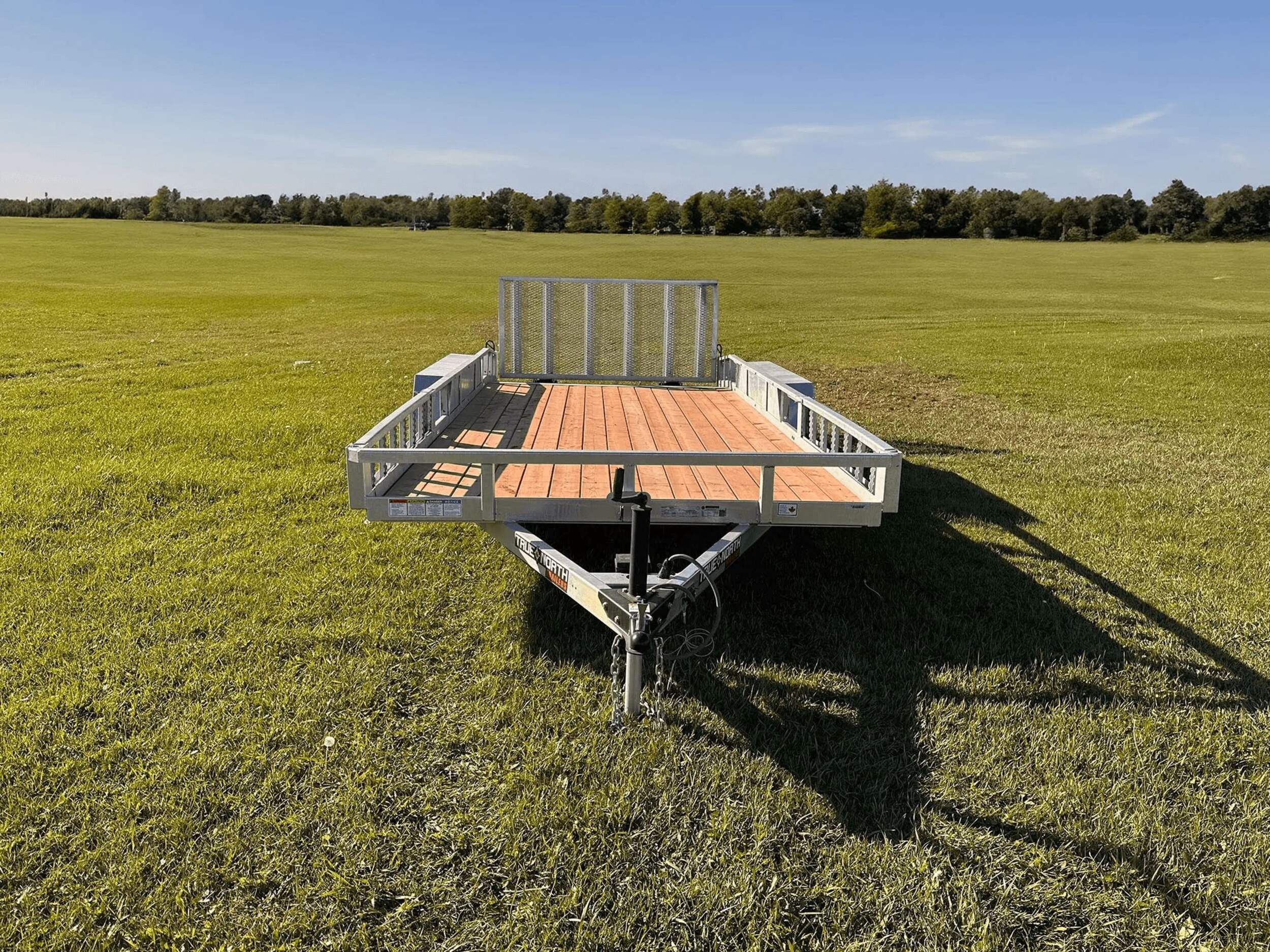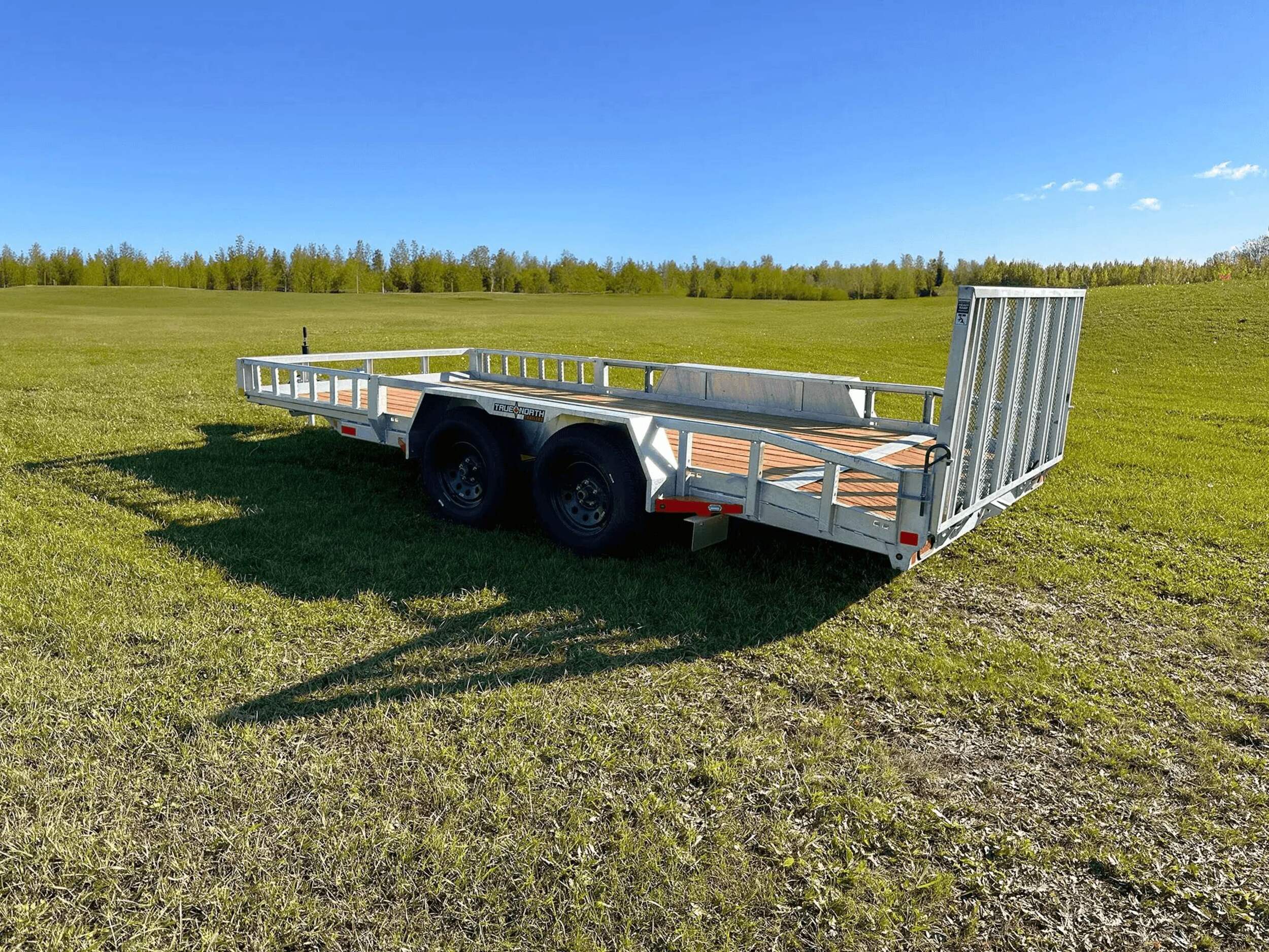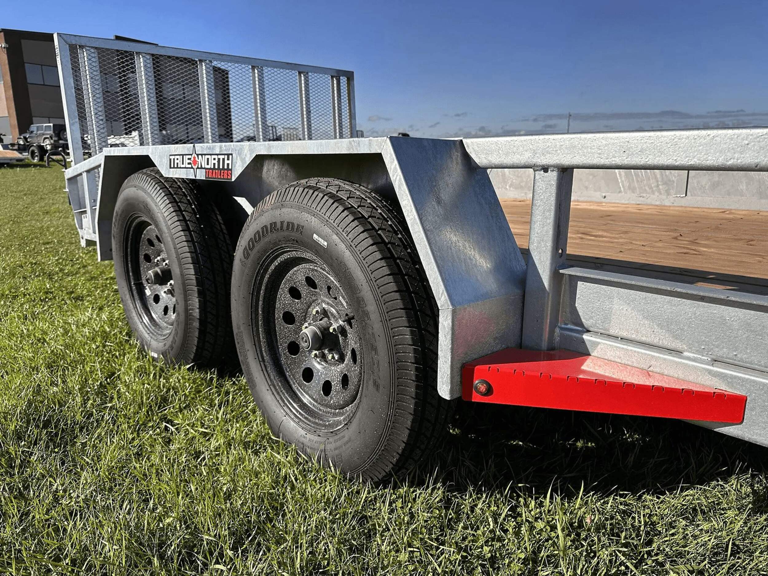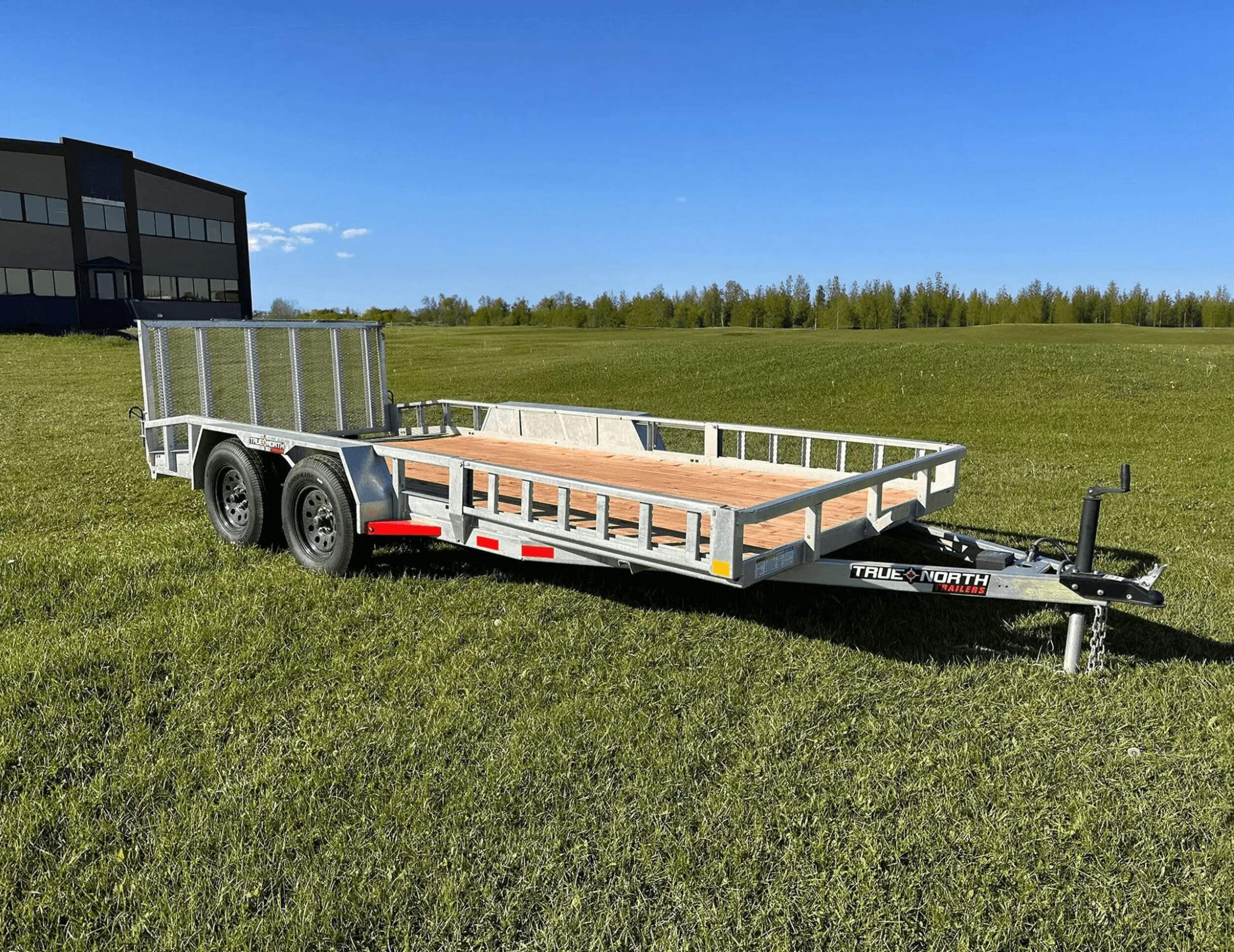The True North 83-in x 16-ft tandem axle utility trailer provides heavy-duty hauling with a 5200-lb payload capacity. The galvanized steel construction and treated wooden floor offer all-weather durability. Dove tail rear folding gate, removable fenders, and slip-resistant ramps allow easy loading and unloading. A-frame coupler with simple latch system fits 2" balls for secure towing, while the 5000-lb top wind jack adds stability. Please note registration is required before removing this utility trailer from the premises. Assembly services may involve extra fees. Contact your local Canadian Tire store for details.