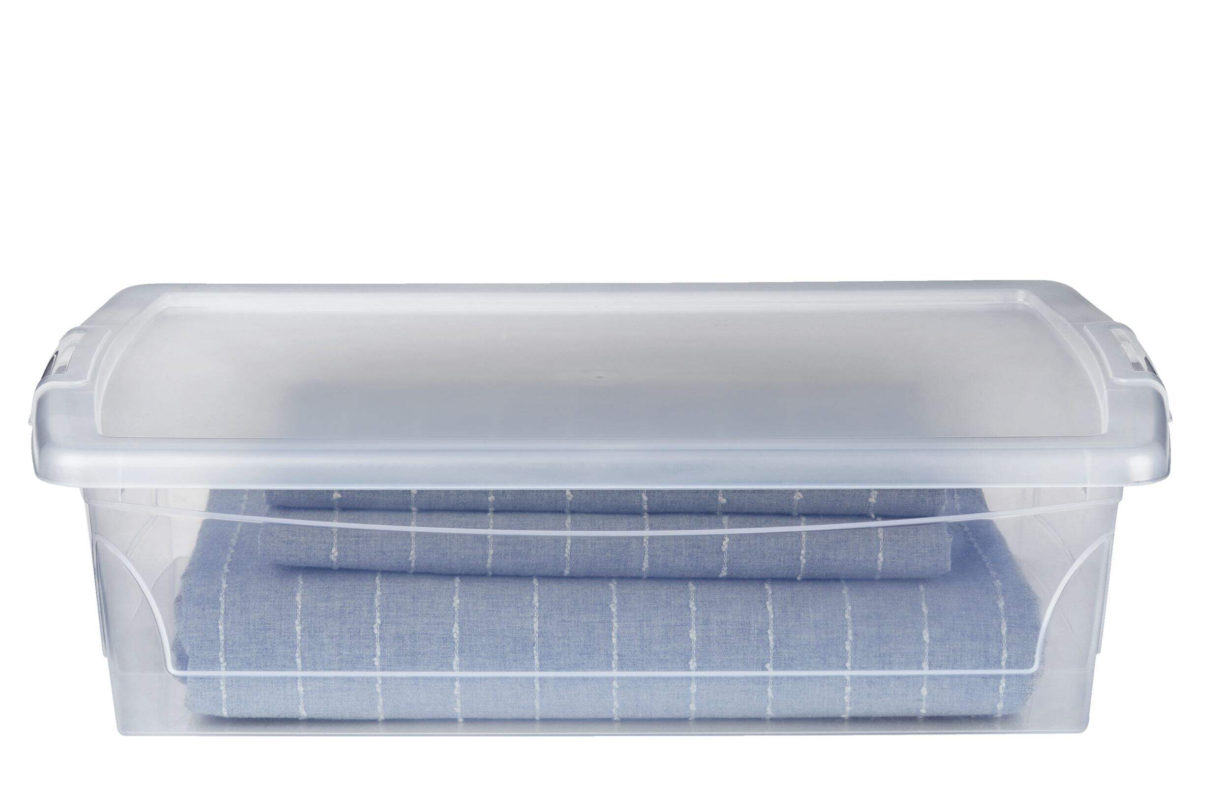 This type A Clarity Container has a transparent plastic construction, so you can clearly see what you have stored inside for more efficient storage. Featuring a low-profile and stackable design to help save space in closets or under the bed, this Clarity Container also has a 25L capacity to easily store clothing, linens, towels, seasonal decorations and more. This durable storage container has a snap-on lid to keep contents both protected and easily accessible.
