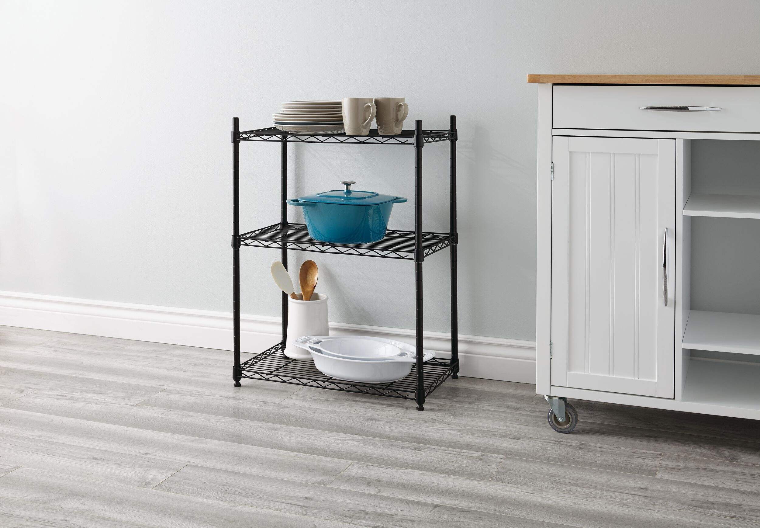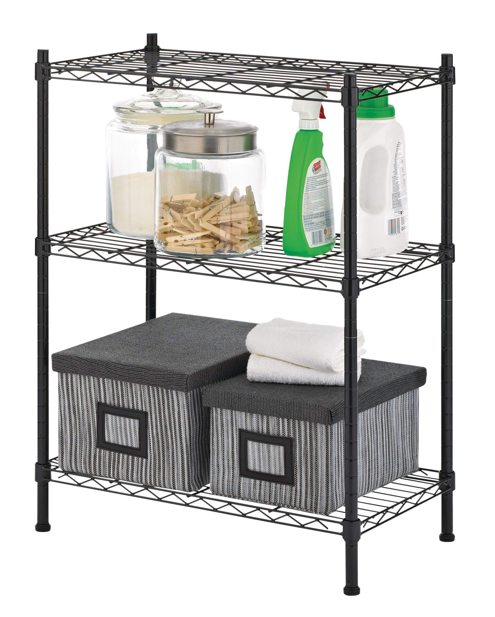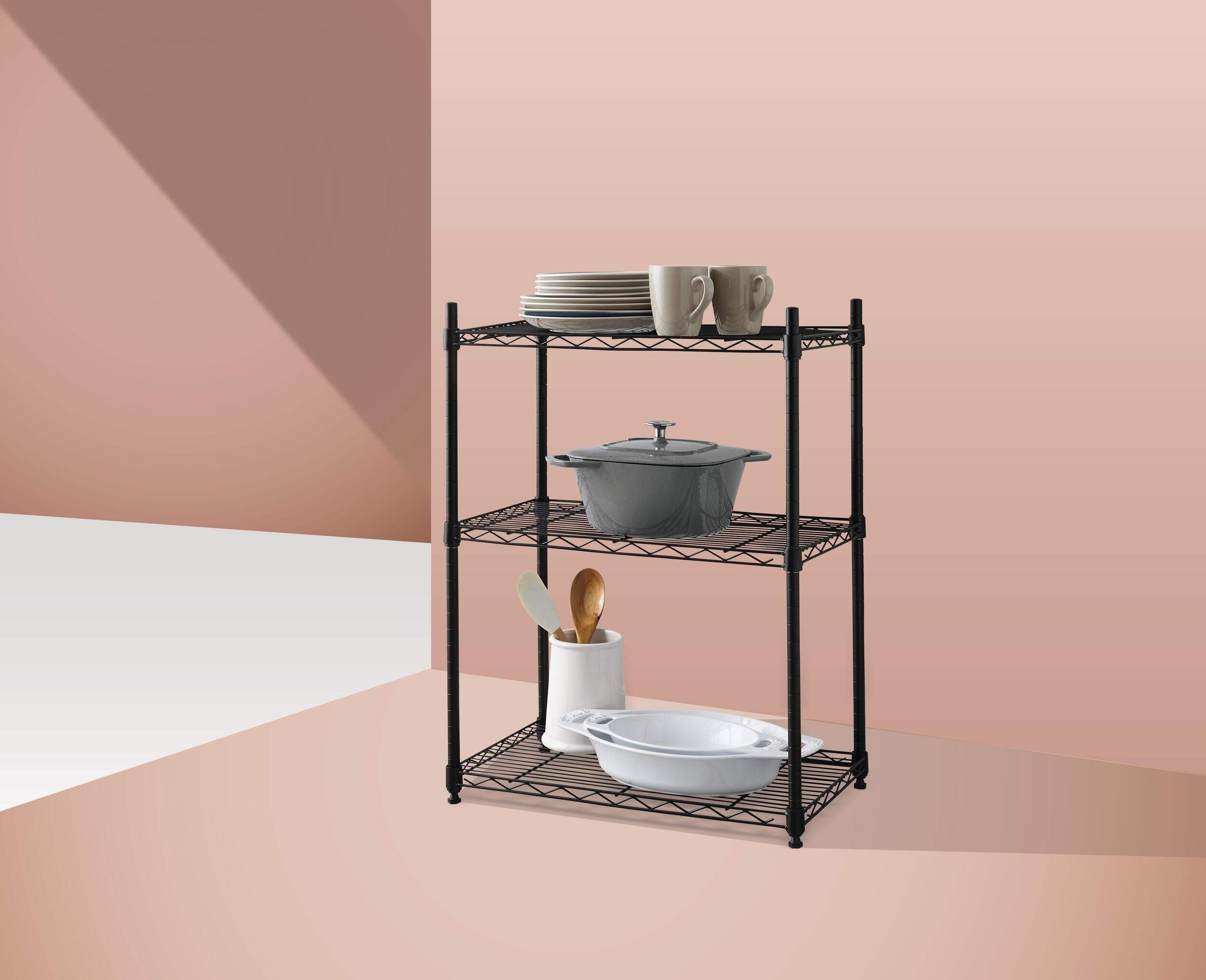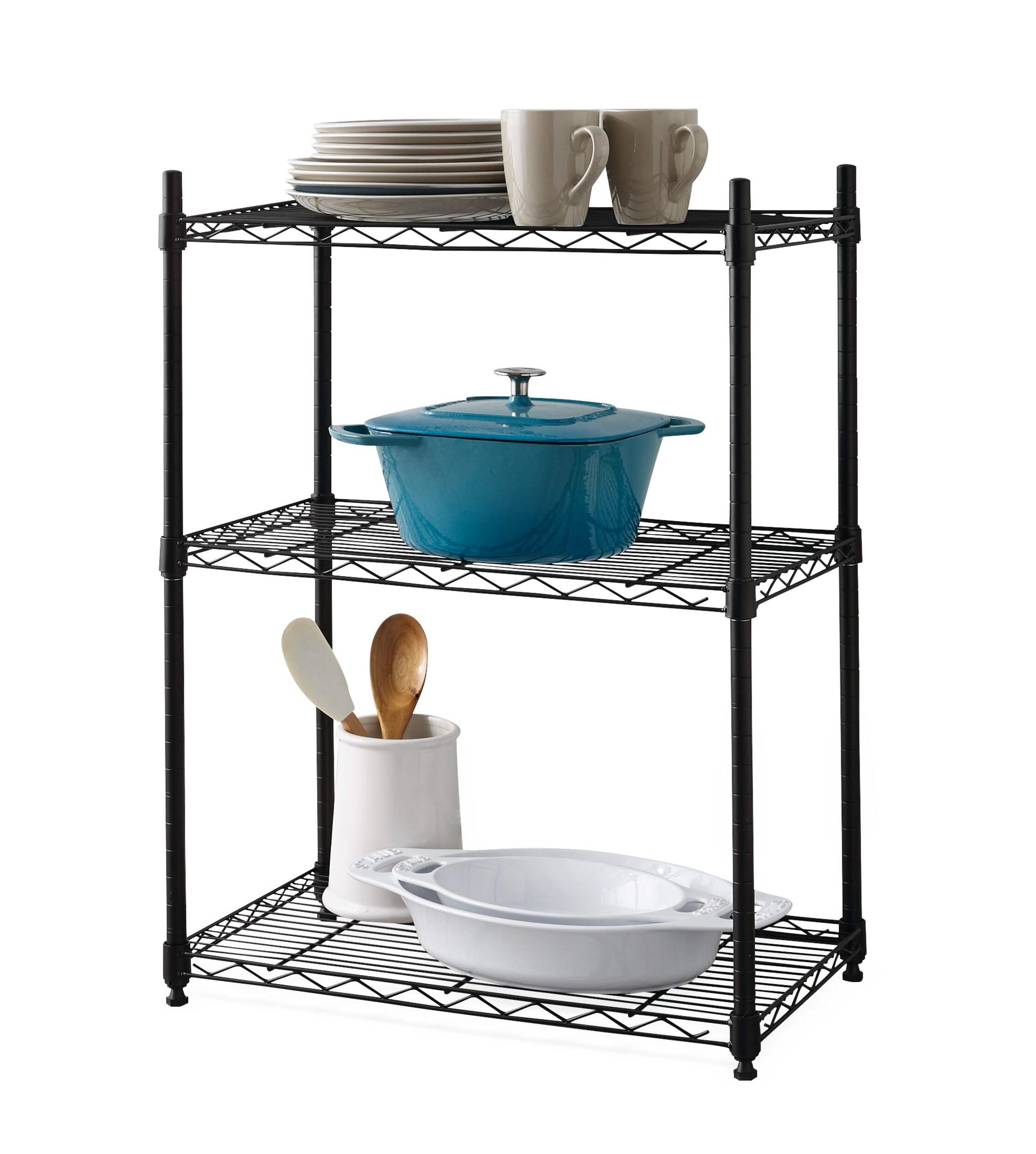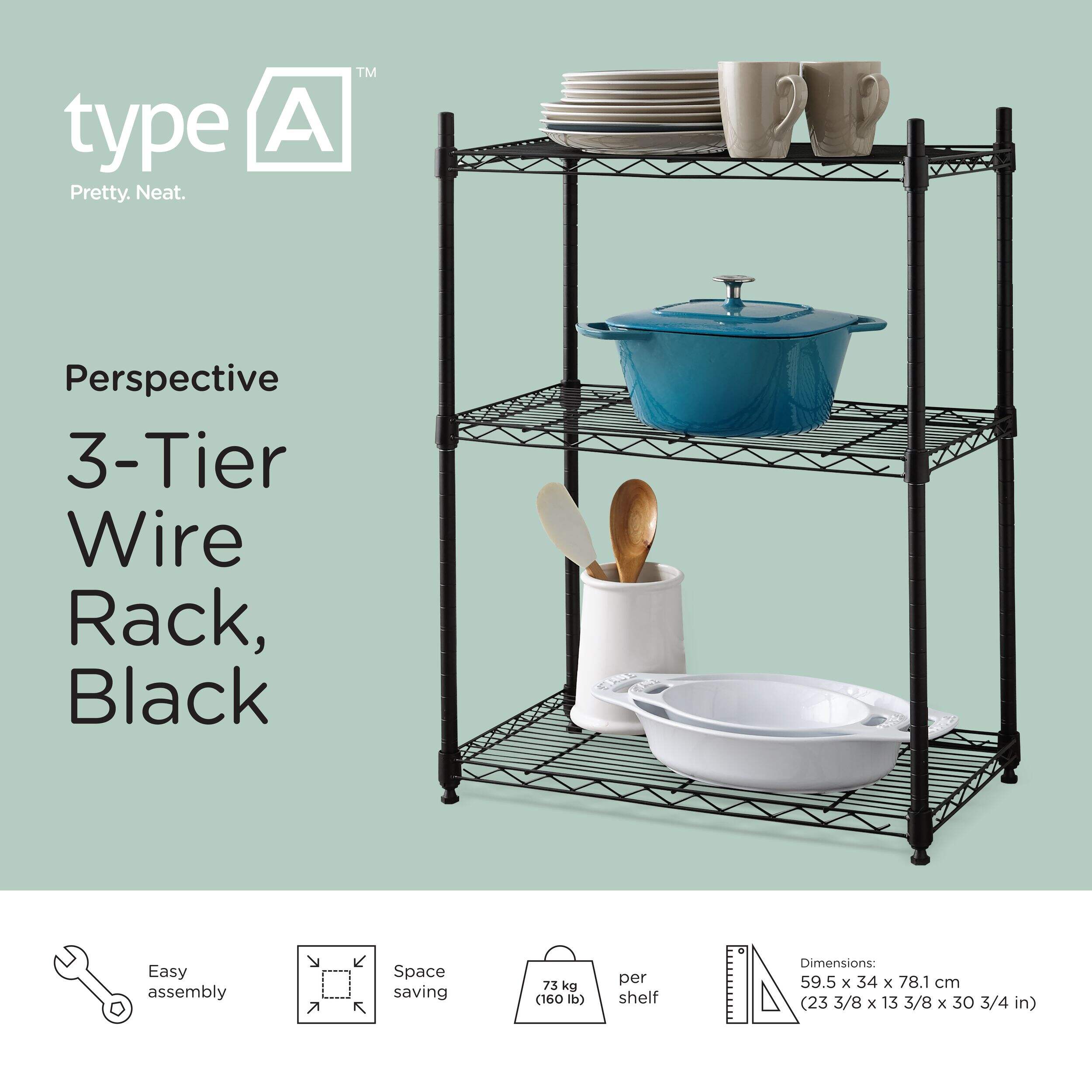 You can store and organize virtually anything on this convenient Type A Metal 3-Tier Adjustable Wire Shelving Storage Unit. This black wire unit is a reliable solution for spaces with limited storage and provides plenty of space on three adjustable shelves. A great choice for storage space in the kitchen, laundry room, or basement, this durable unit makes it easy to add customized storage in any area.