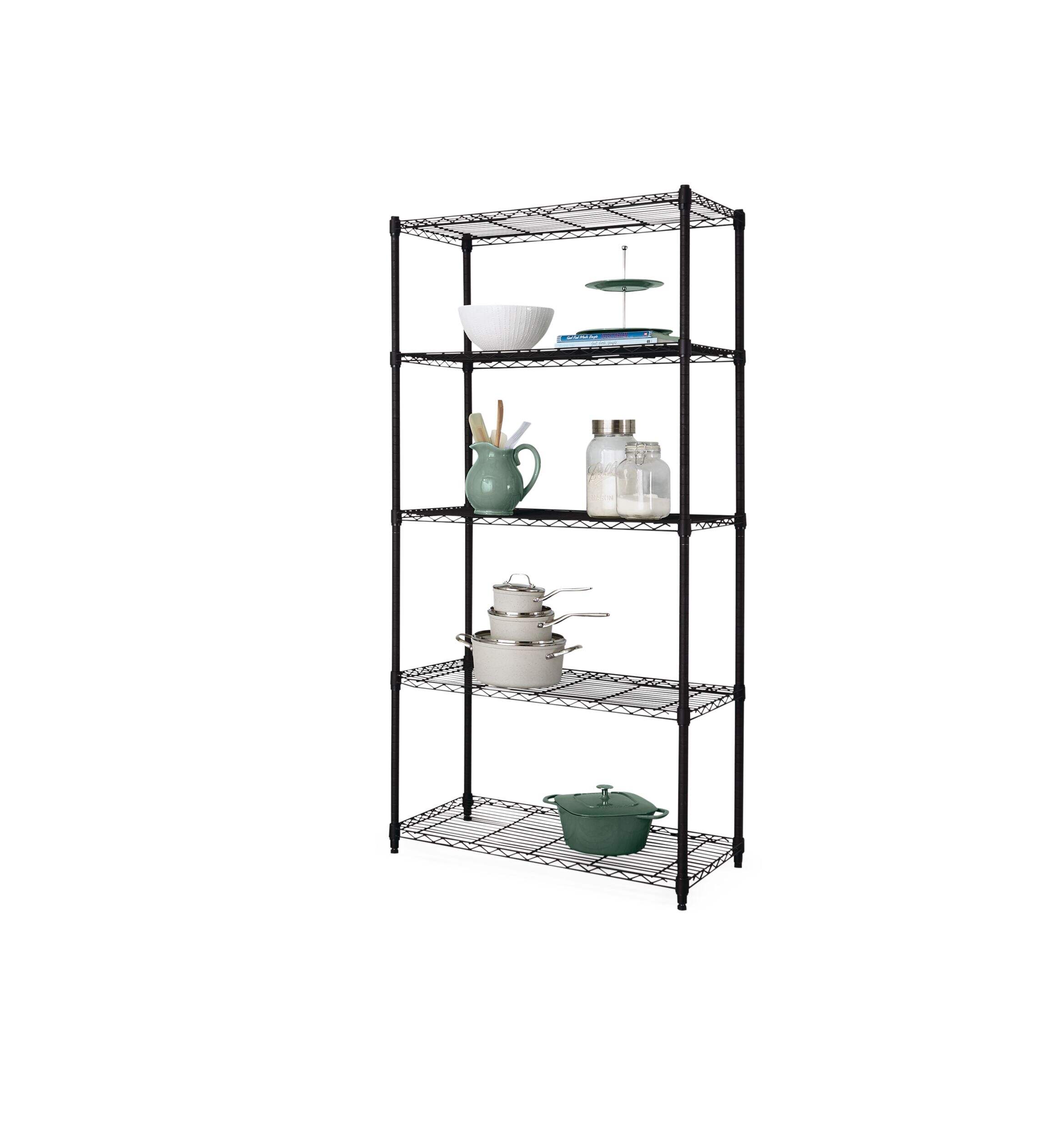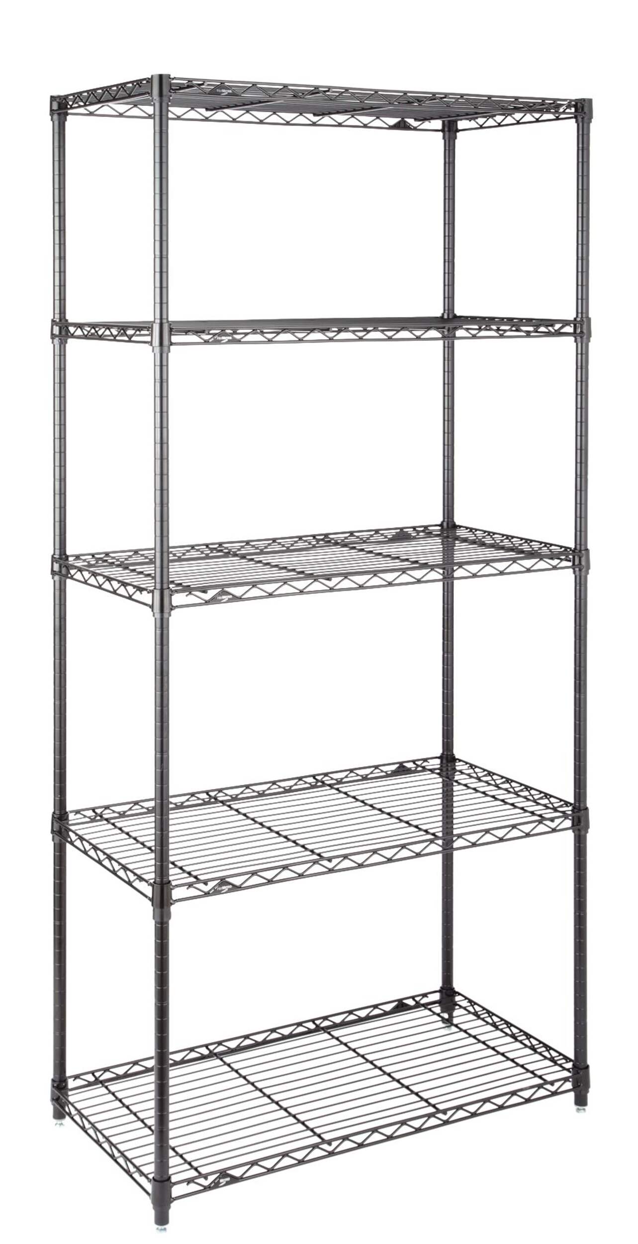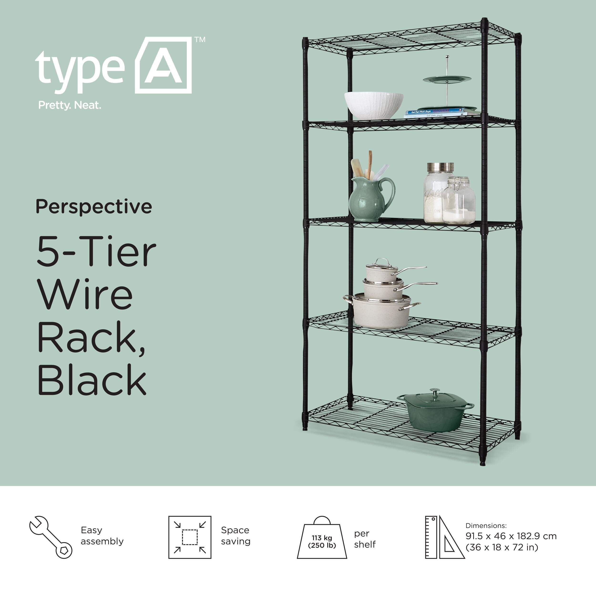 Keep items stowed neatly away but within easy reach using the Type A Metal 5-Tier Adjustable Wire Shelving Storage Unit. This sturdy black storage rack provides plenty of storage and display space, and is ideal for use in a kitchen, laundry room, closet or basement. The shelves adjust vertically so you can customize the unit to suit your needs. Strong and durable, this rack is great for holding pantry or household staples like cans, detergent bottles, seasonal décor and more.