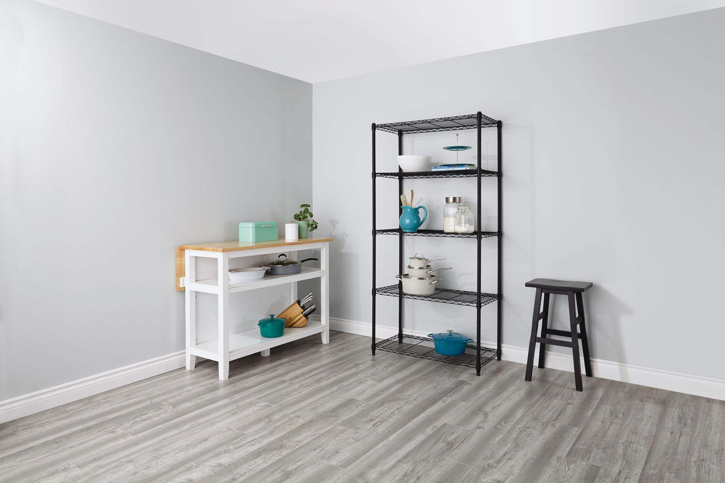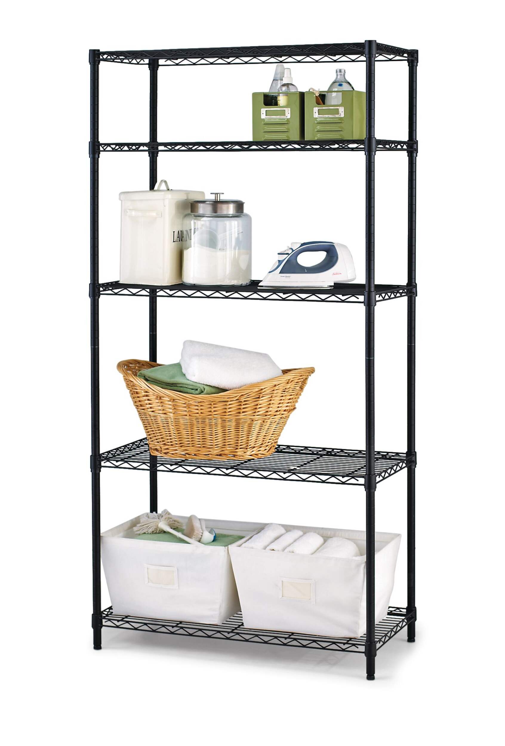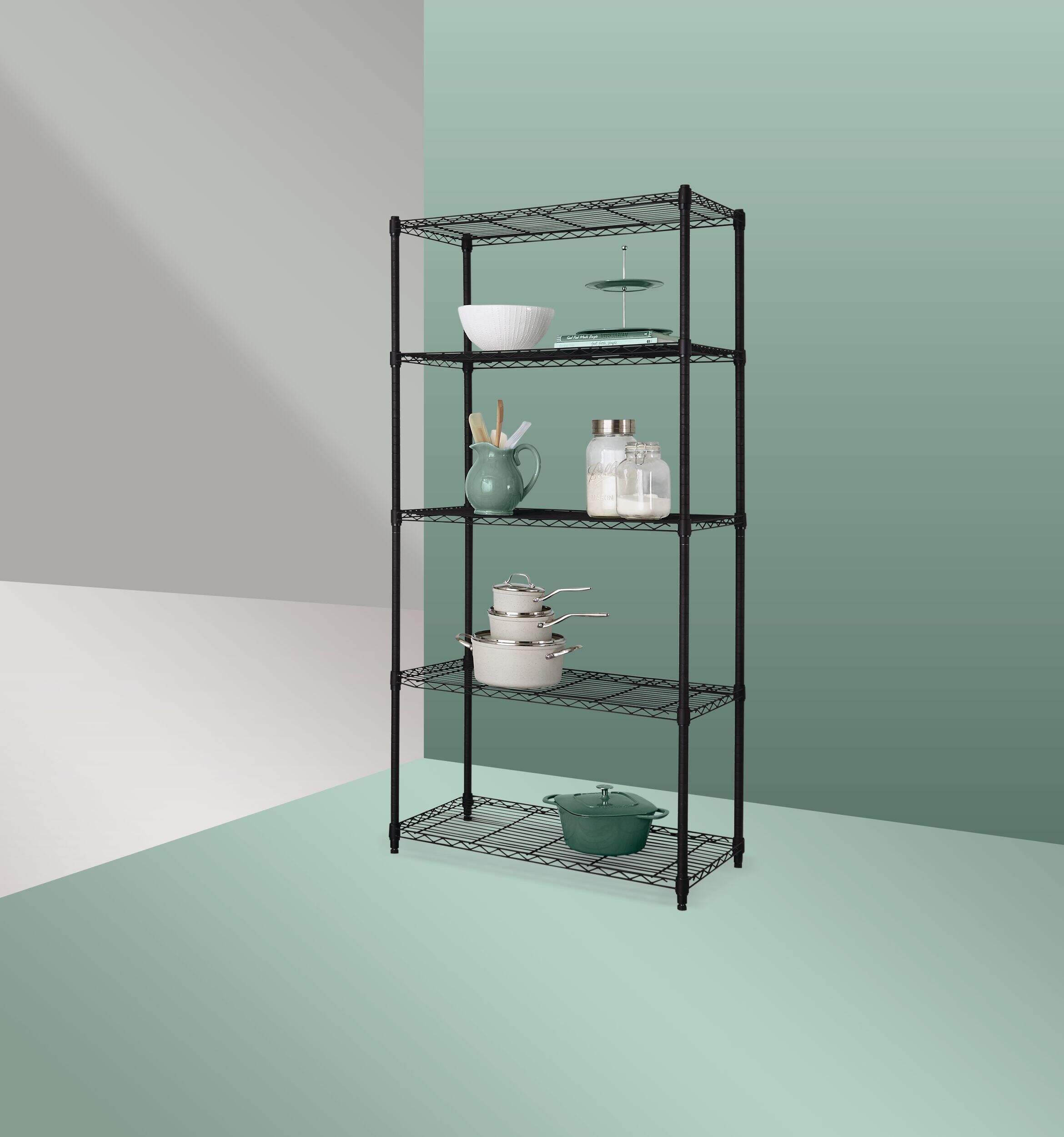 Keep items stowed neatly away but within easy reach using the Type A Metal 5-Tier Adjustable Wire Shelving Storage Unit. This sturdy black storage rack provides plenty of storage and display space, and is ideal for use in a kitchen, laundry room, closet or basement. The shelves adjust vertically so you can customize the unit to suit your needs. Strong and durable, this rack is great for holding pantry or household staples like cans, detergent bottles, seasonal décor and more.
