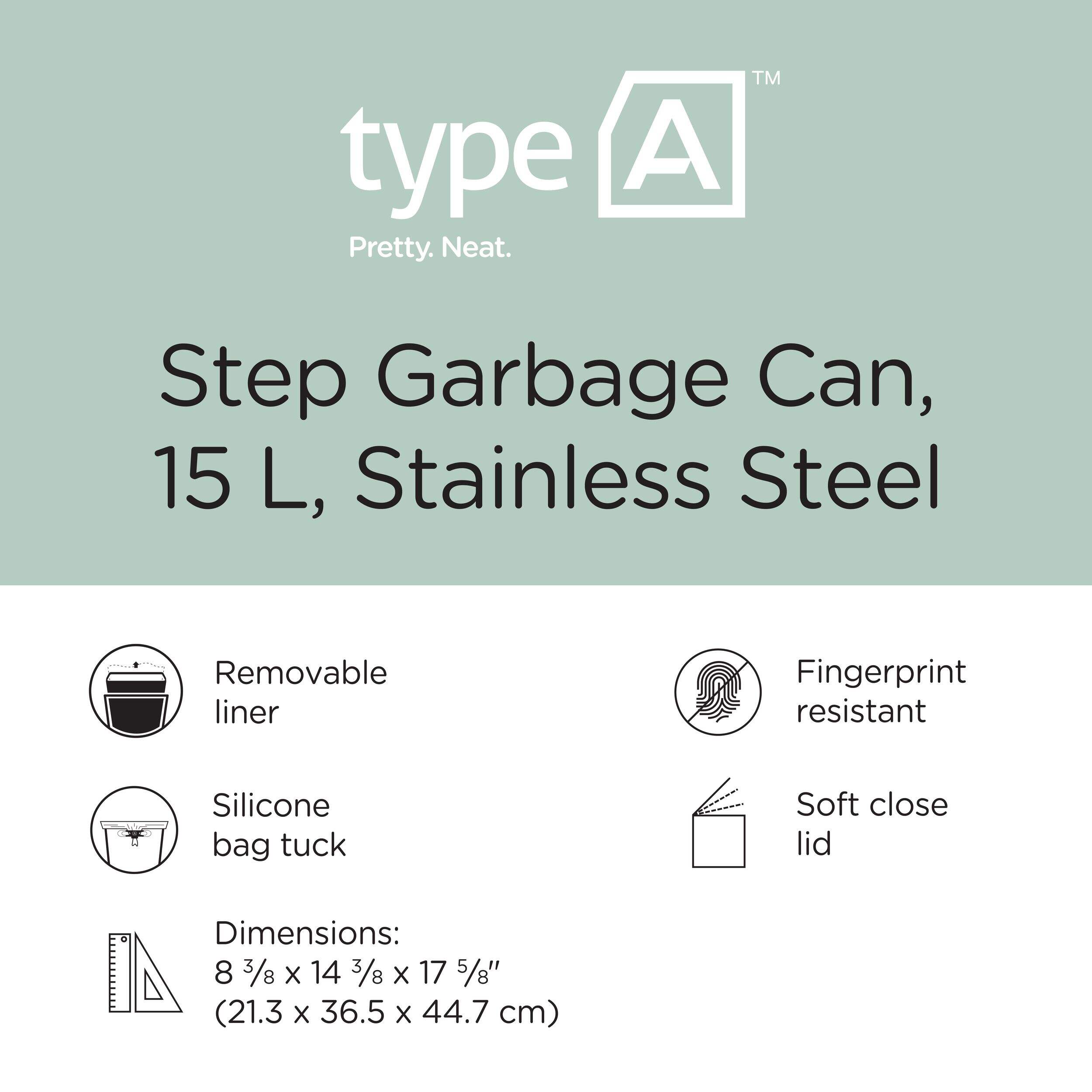 The type A Stainless Steel Step Rectangular Garbage Can is a sleek and practical addition to any home. Its convenient step function allows for hands-free operation, keeping the lid closed when not in use to minimize odours. The silicone bag tuck ensures garbage bags stay securely in place, while the removable liner and soft-close lid add to its functionality. This garbage can is perfect for use in the bathroom, bedroom, or home office.