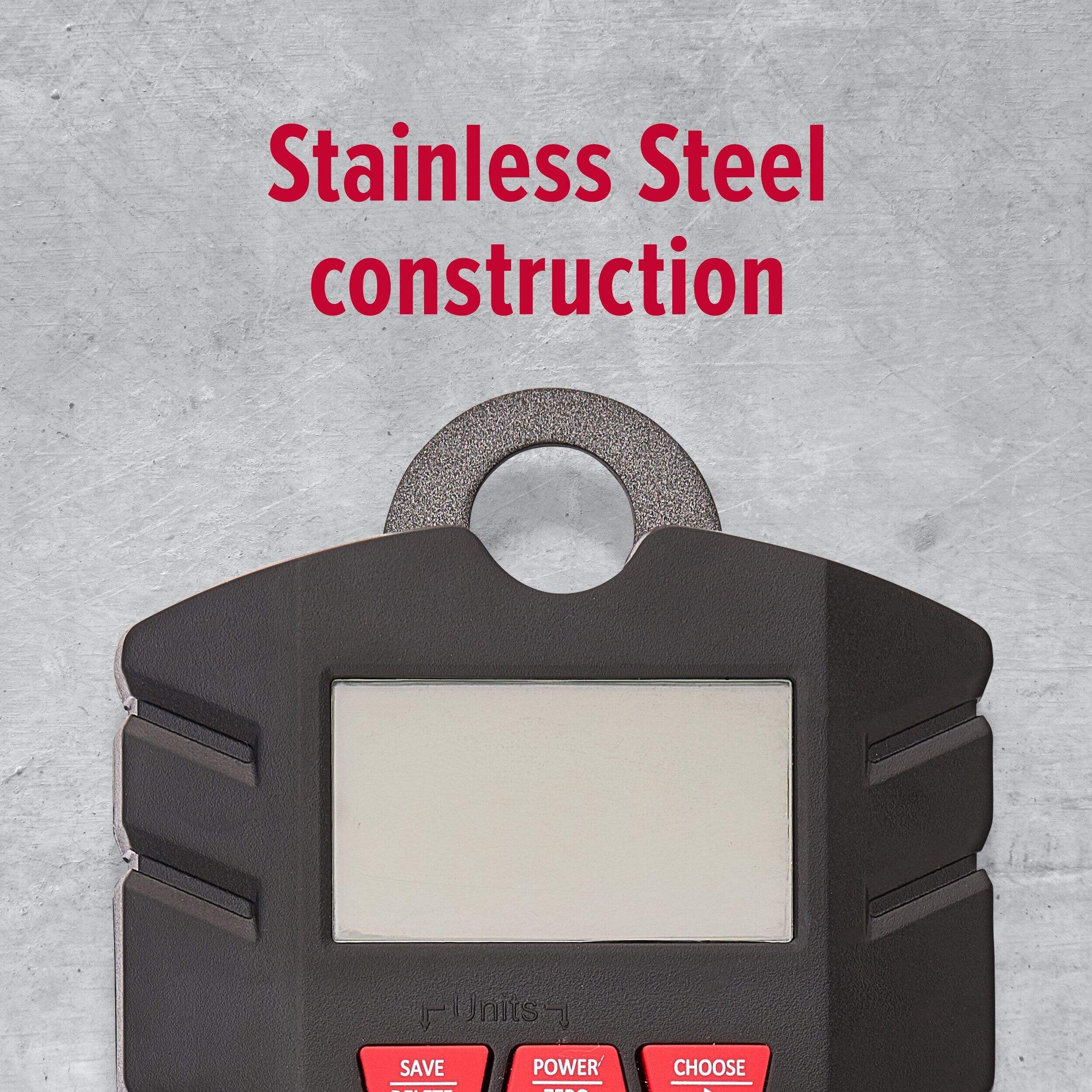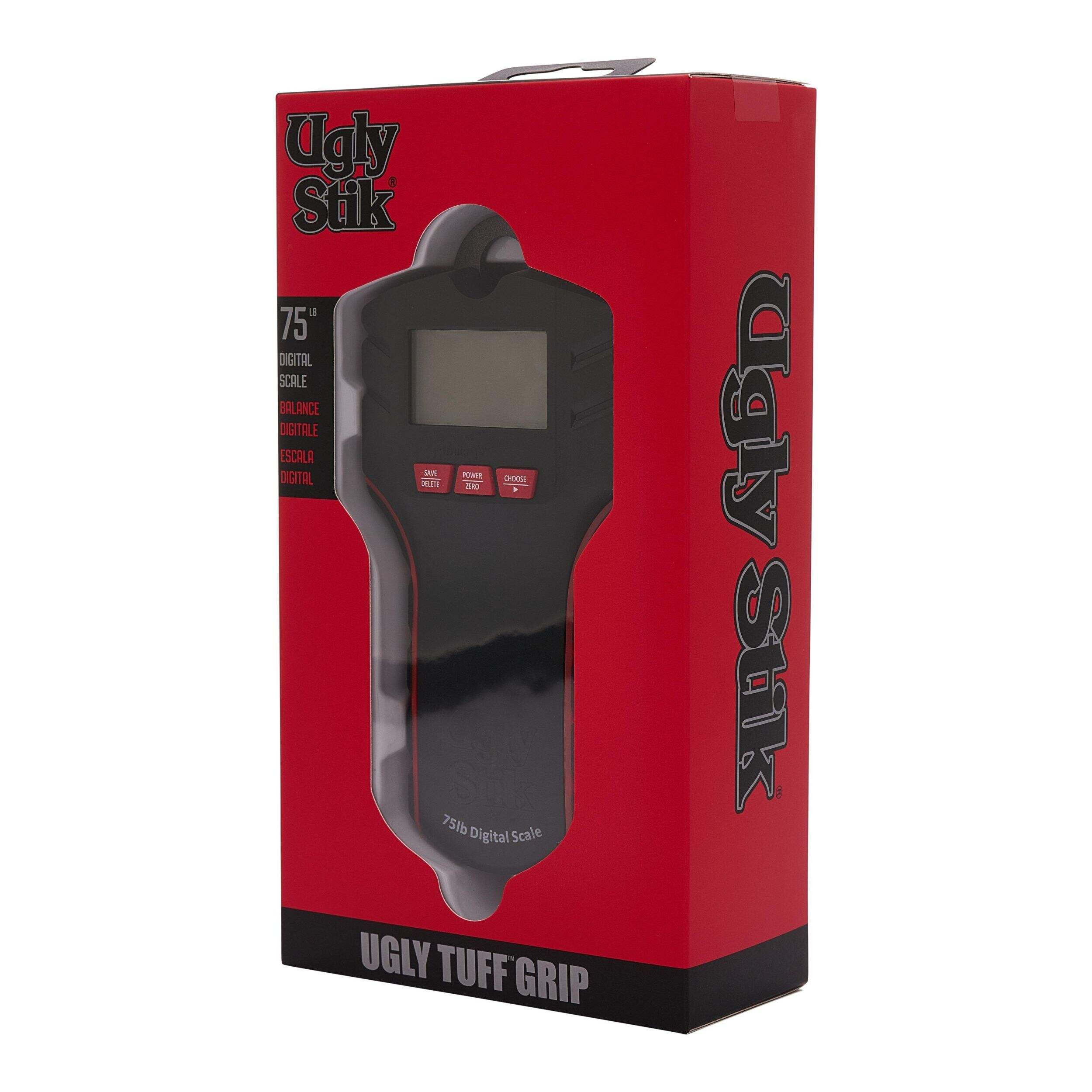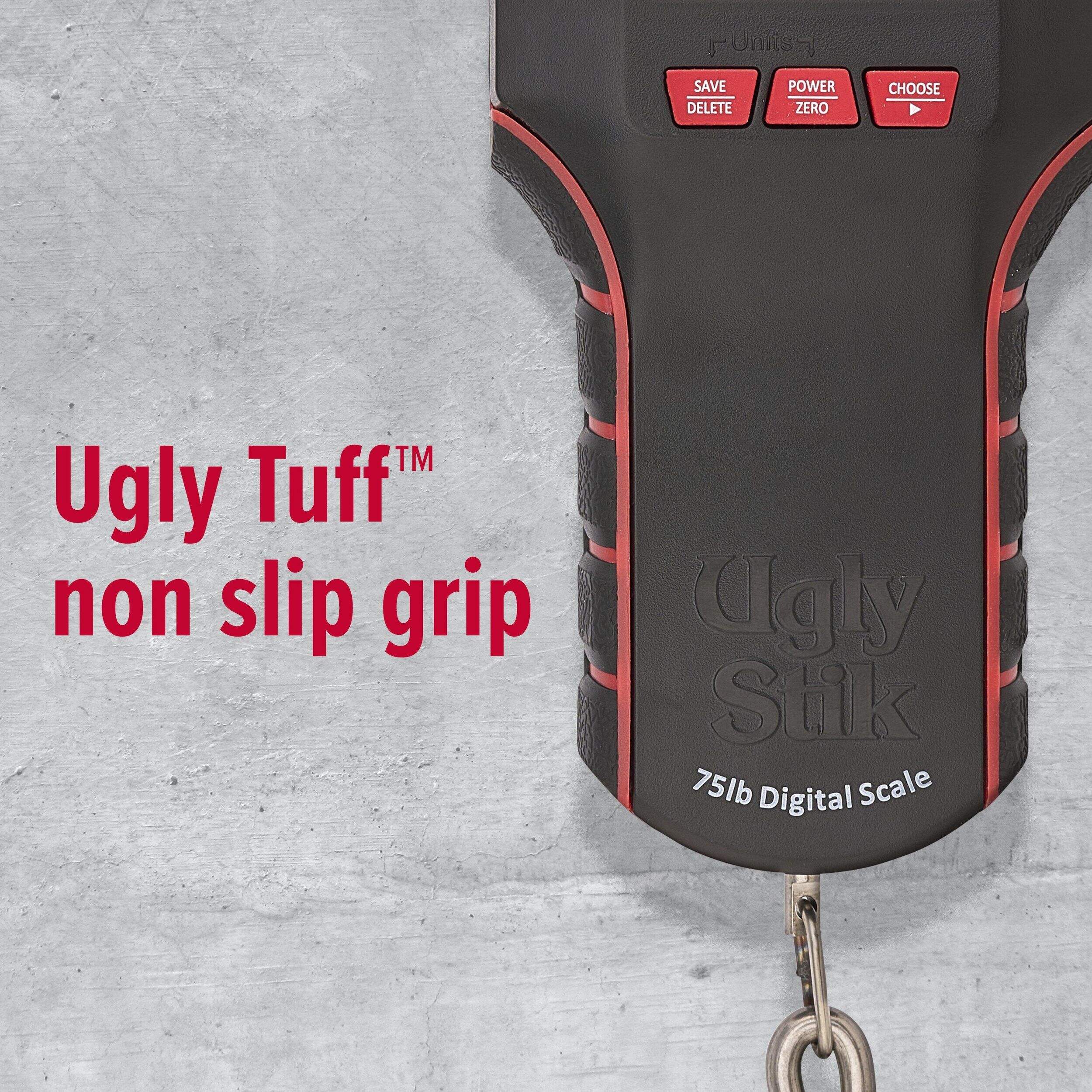 The Ugly Stik Digital Scale brings rugged durability to weigh-ins. Its non-slip grip provides control when handling slippery fish, while the stainless steel frame withstands heavy use season after season. With an 8 weight memory, total and average readings, and a backlit display, this digital scale has the essential features to weigh catches like a pro.