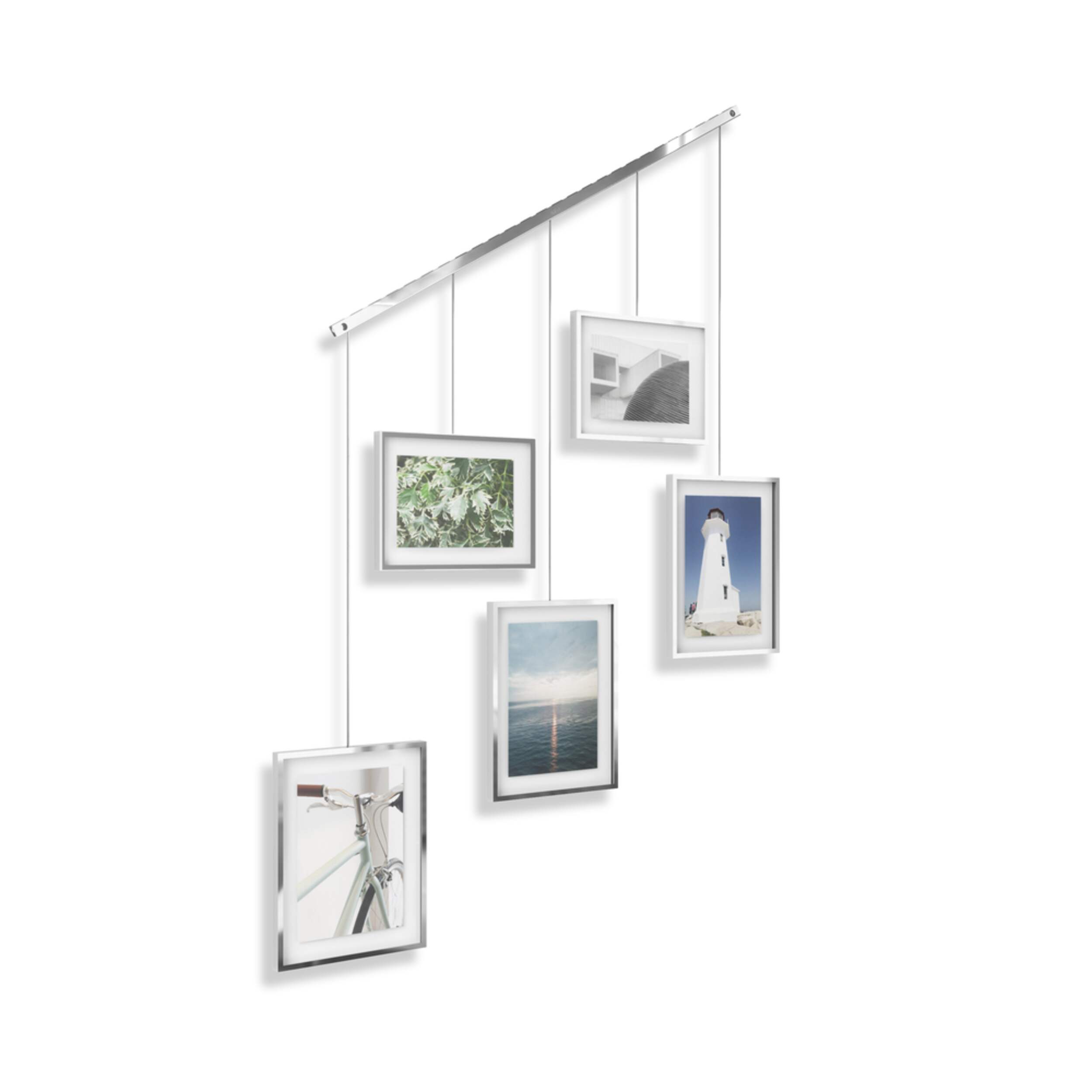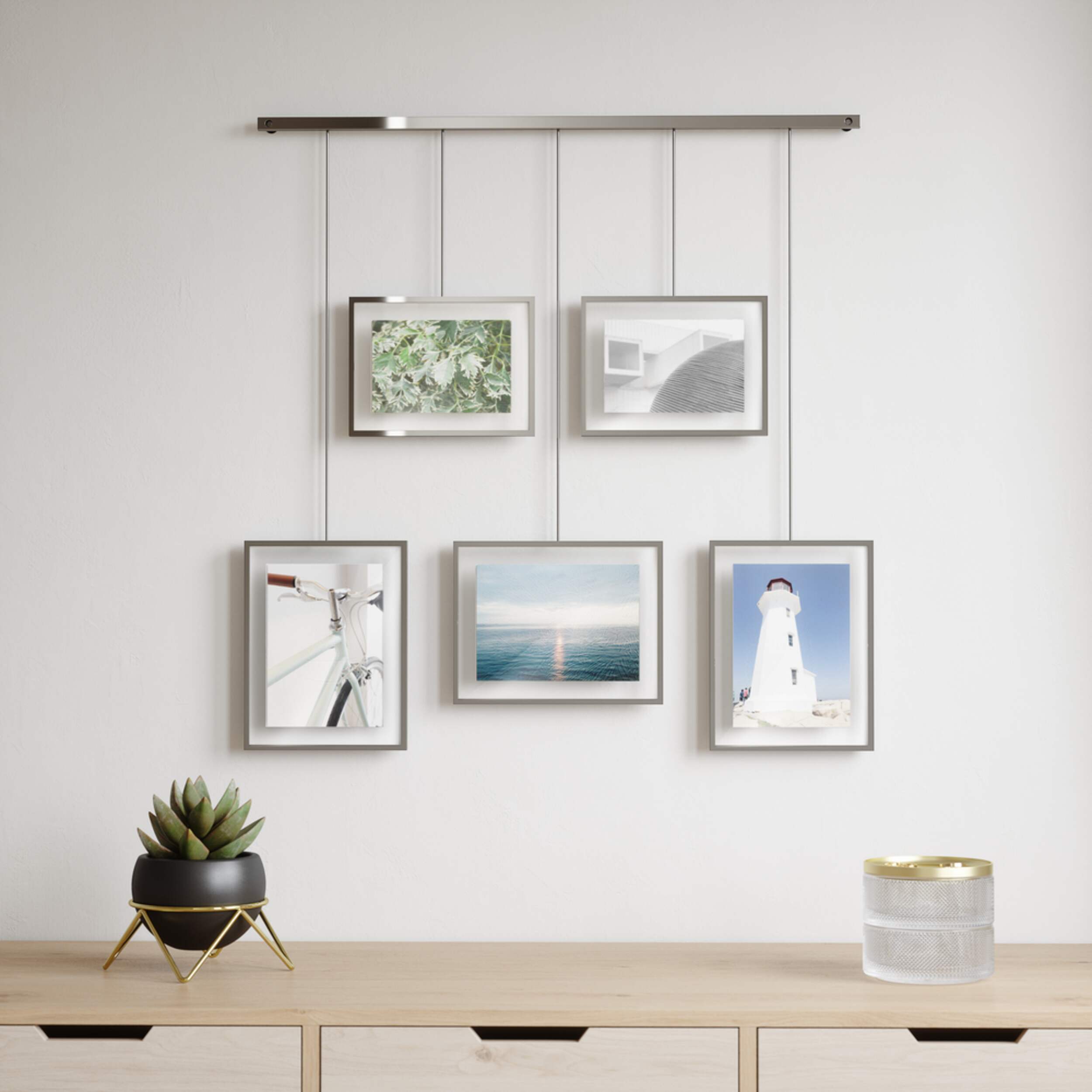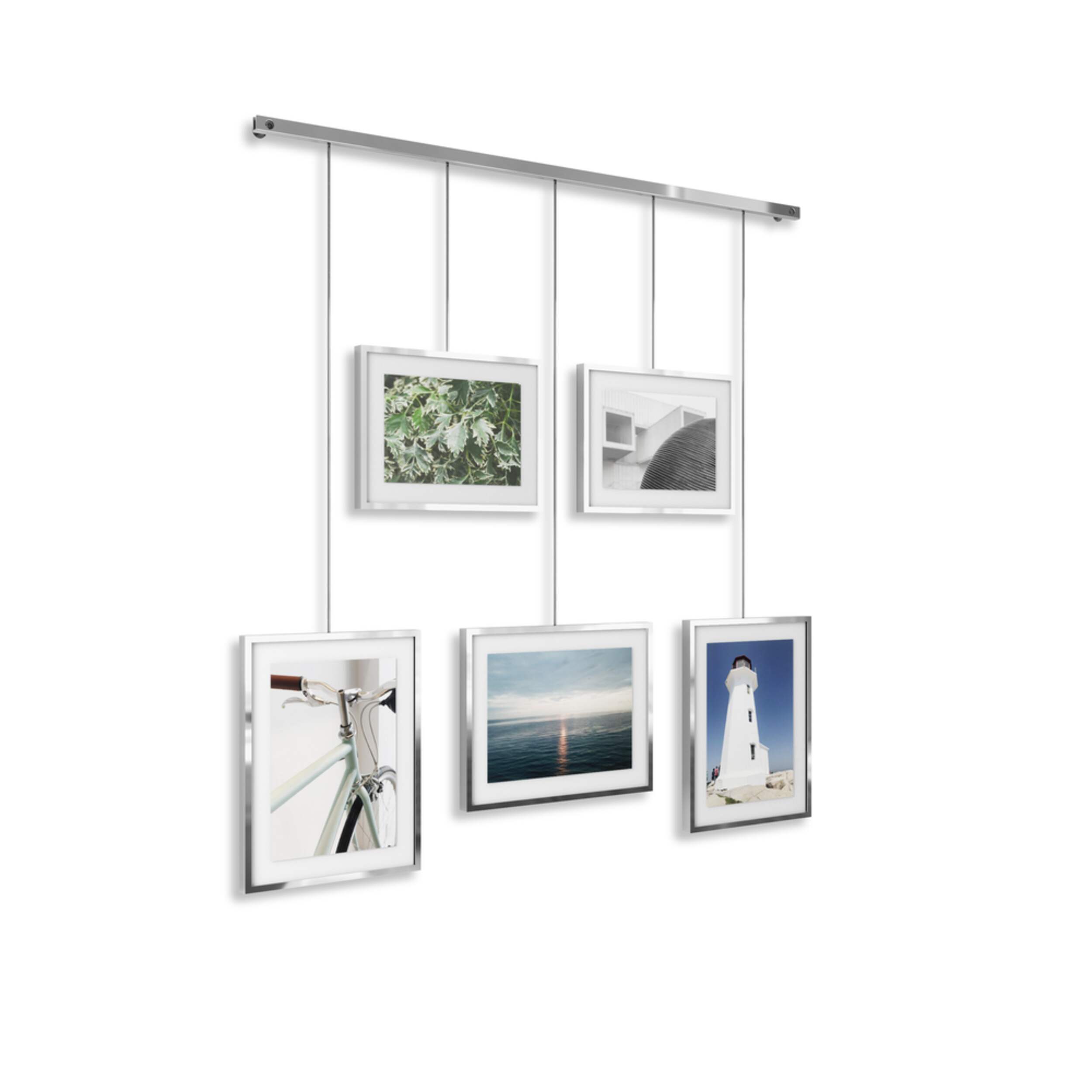 Display your favourite photos in an eye-catching fashion with two 4" x 6" (10.1 x 15.2 cm) and three 5" x 7" (12.7 x 17.7 cm) picture frames suspended from a modern and sleek beam
