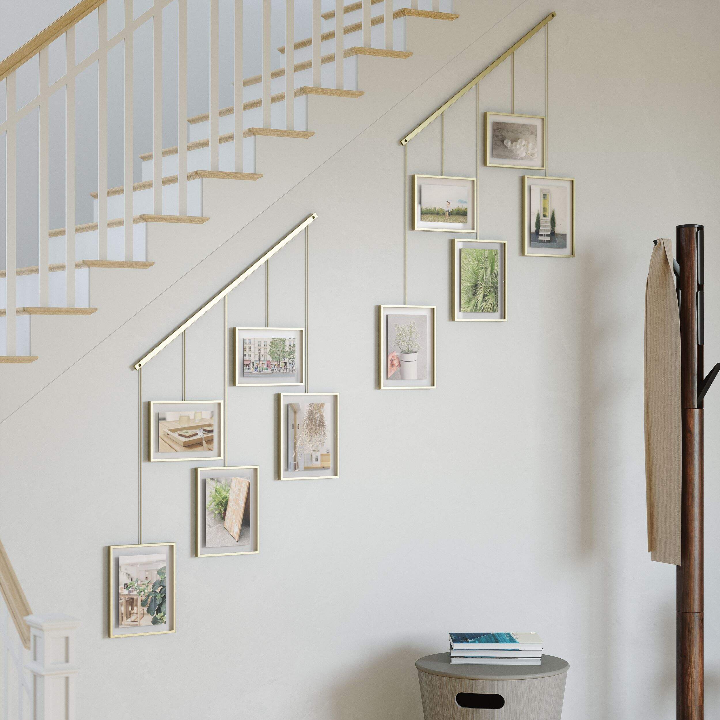 Upgrade your wall decor with Exhibit Photo Display. This sleek, wall-mounted brushed metal ledge is equipped with clips and brackets to securely hold five gallery-style picture frames of various sizes. Say goodbye to unsightly wall damage – Exhibit is designed to minimize any marks left behind. But that's not all – the brackets with the frames are suspended from the ledge, giving you the freedom to create your own unique layouts. Hang it straight or angled, Exhibit is perfect for stairways, adding a modern touch to any space. Place Exhibit in your living room, bedroom, entryway, office, or studio to elevate your home's style. Showcase your favorite photos and artwork while giving the room a fresh, contemporary update. You can easily customize the layout to fit your preferences. Move the picture frames around, rotate them to landscape or portrait orientation – the choice is yours. With two 4x6 frames and three 5x7 frames, you can display all your cherished memories, illustrations, and more. Designed to complement any decor style, Exhibit is not just a wall decor piece – it's a statement. Change out your images effortlessly to refresh your room whenever you feel like it. Upgrade your space with Exhibit Photo Display today.
