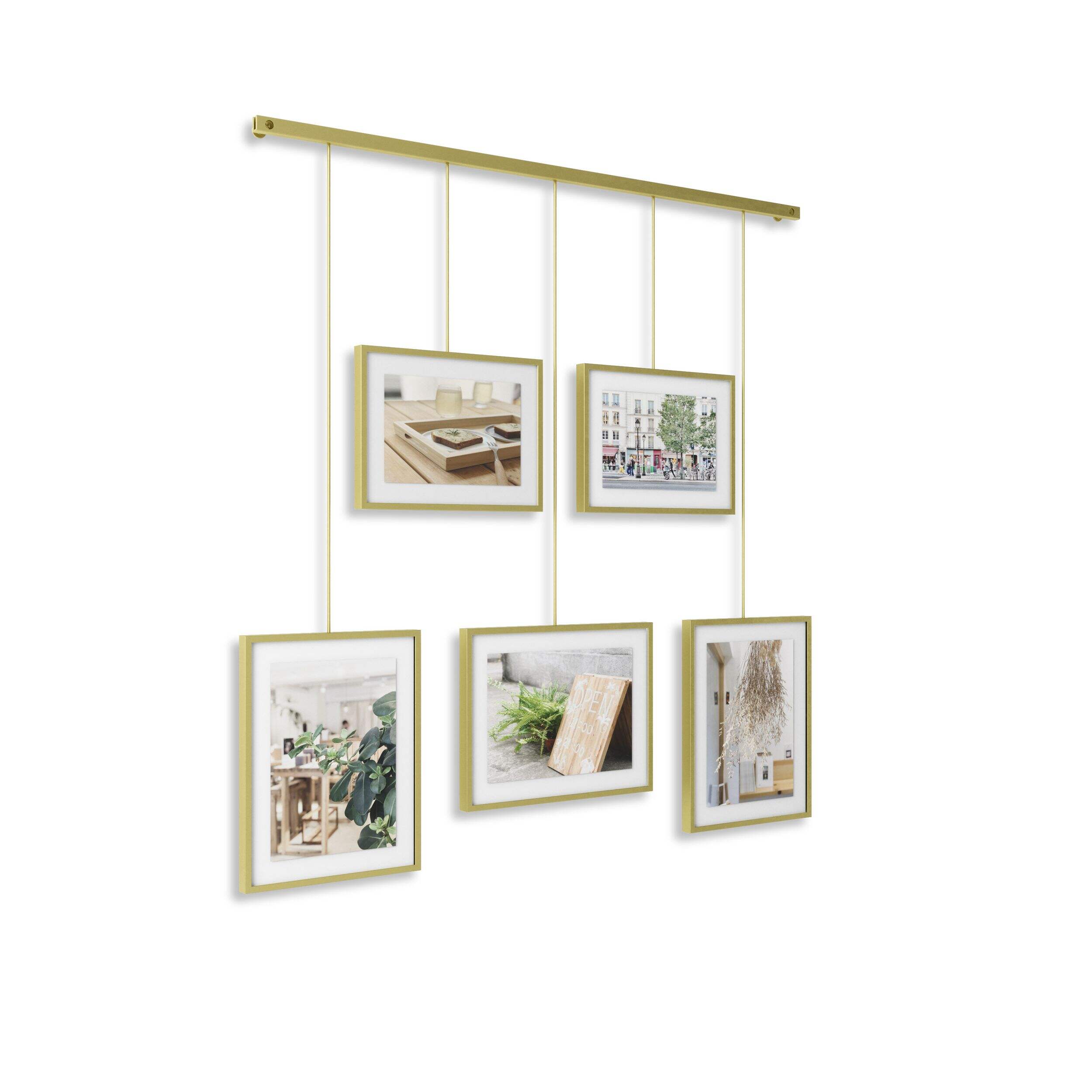 Umbra Exhibit 5-Frame Photo Display features a wall-mounted brushed metal ledge with clips and brackets to hold five gallery-style picture frames of various sizes