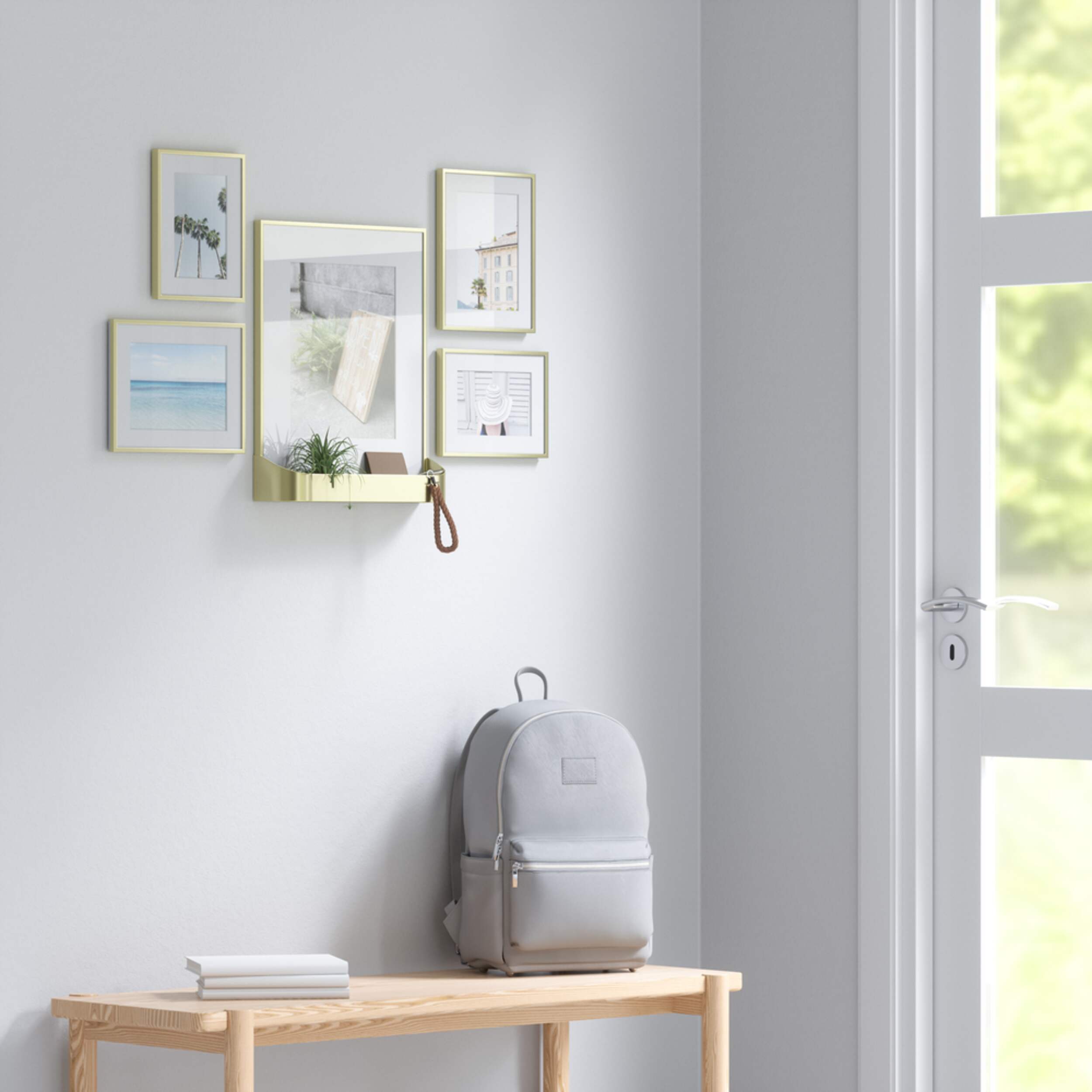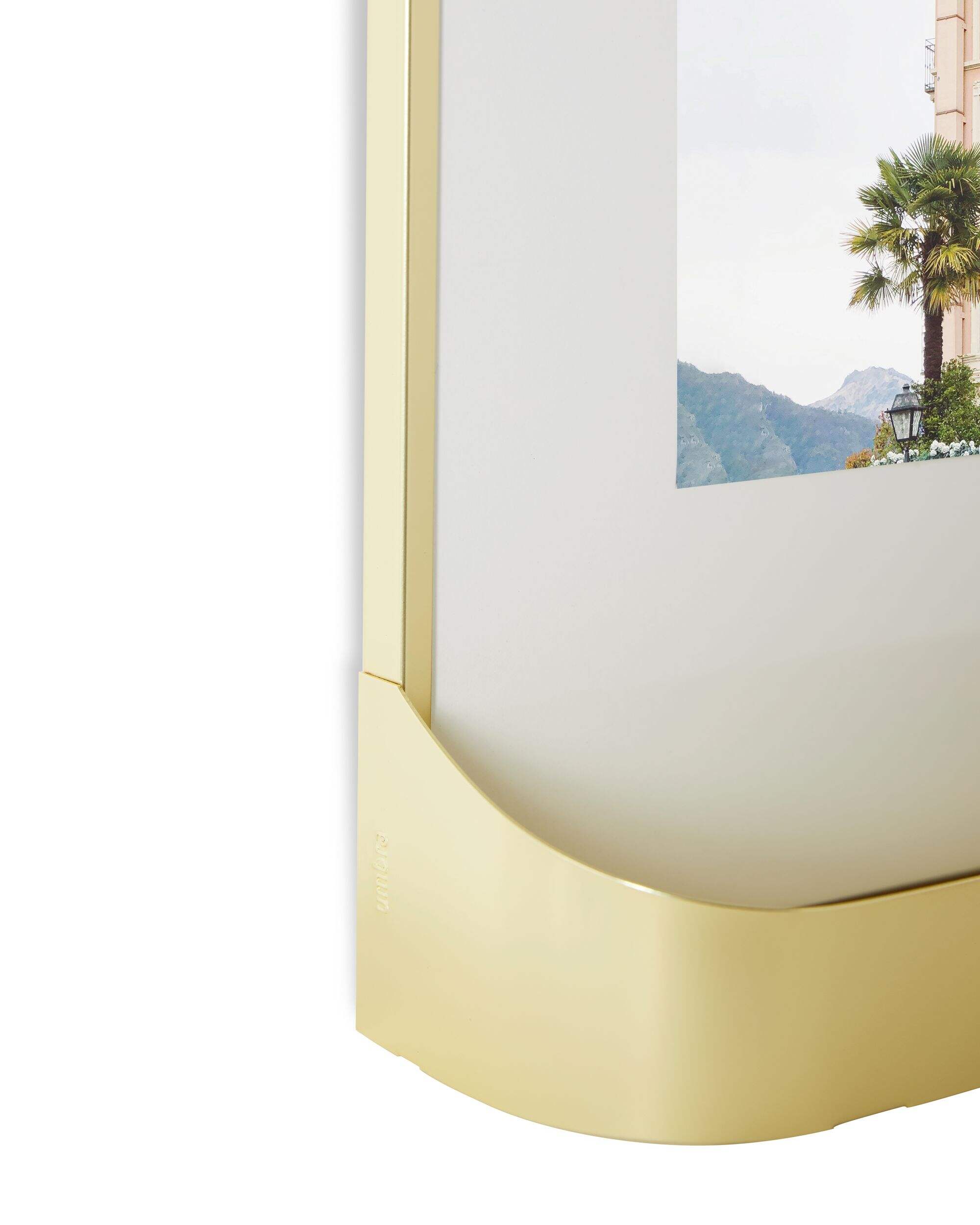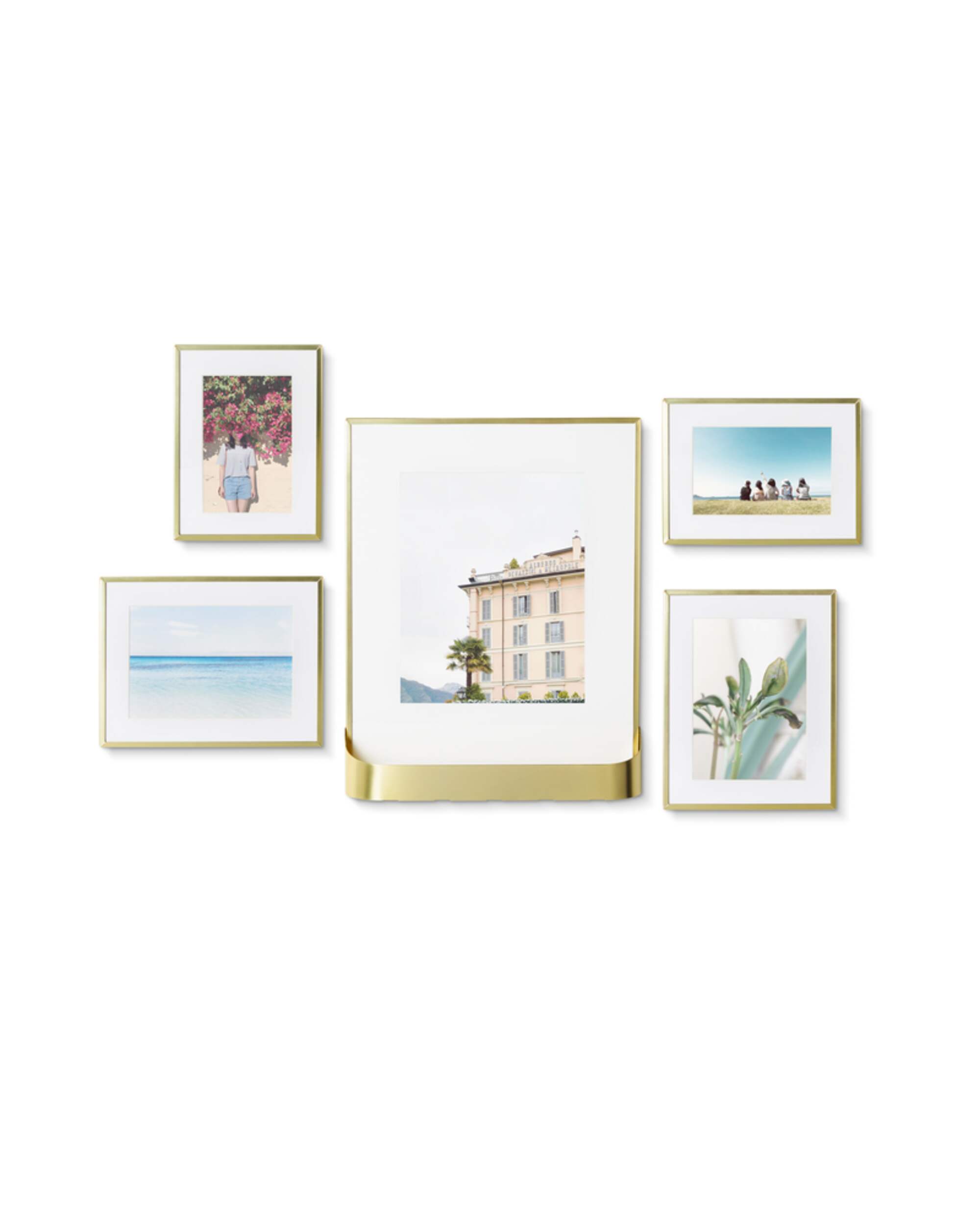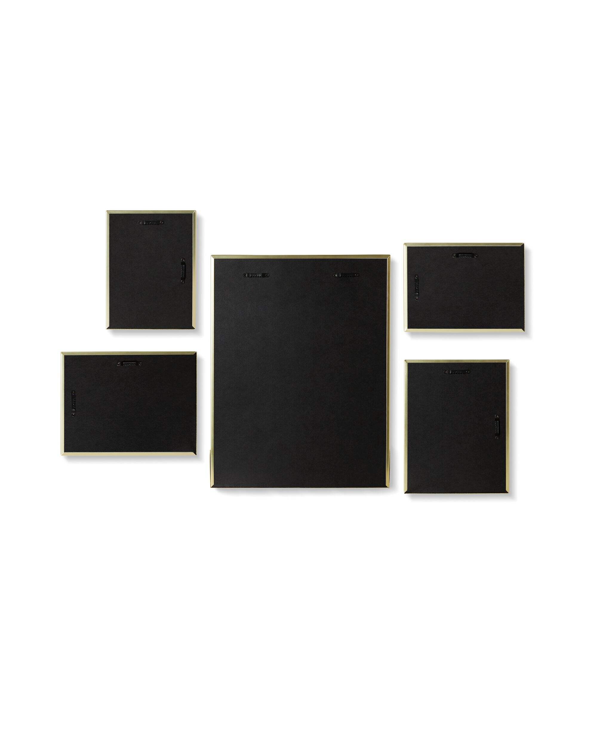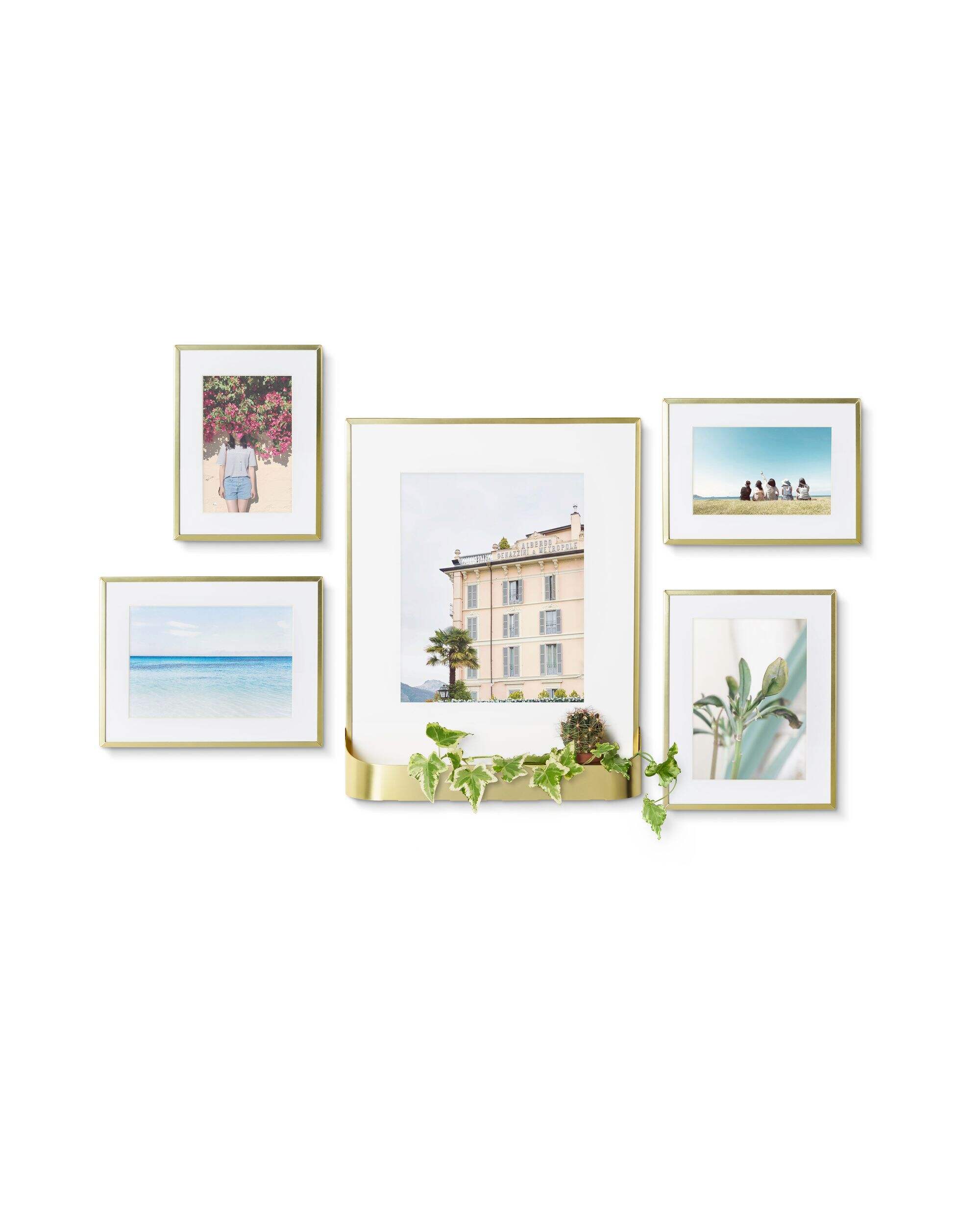These five brass gallery frames make decorating your walls a breeze. The photo frames are simple to mount and arrange however you prefer. The set includes two 4x6 inch frames, two 5x7 inch frames and one 8x10 inch frame, each with a removable white mat. The 8x10 frame has a unique a storable basket perfect for small plants like cacti or succulents, or décor and trinkets. The removable plastic liner shields the frame from dirt. This versatile set is ideal for family photos, portraits and other cherished memories.