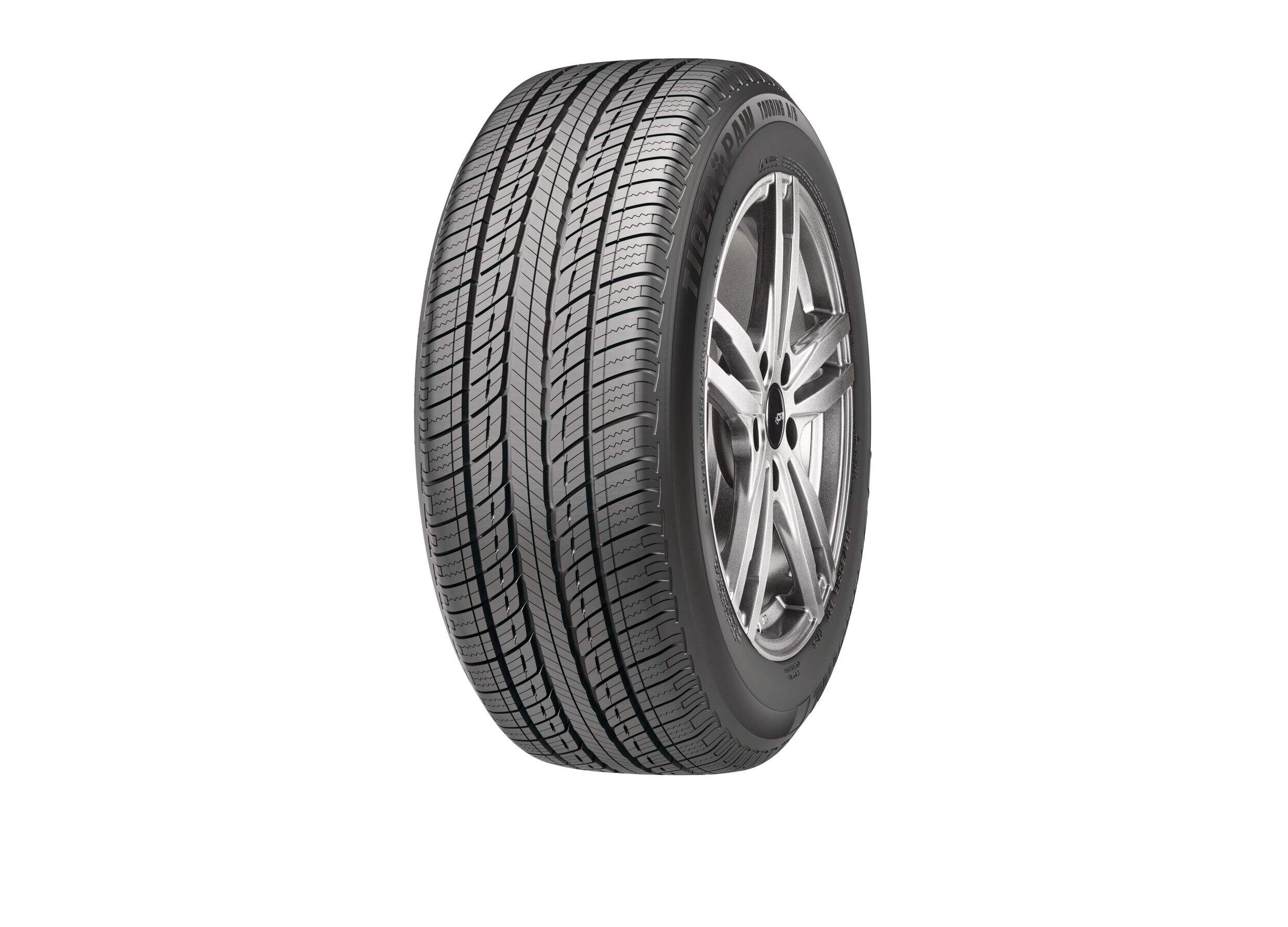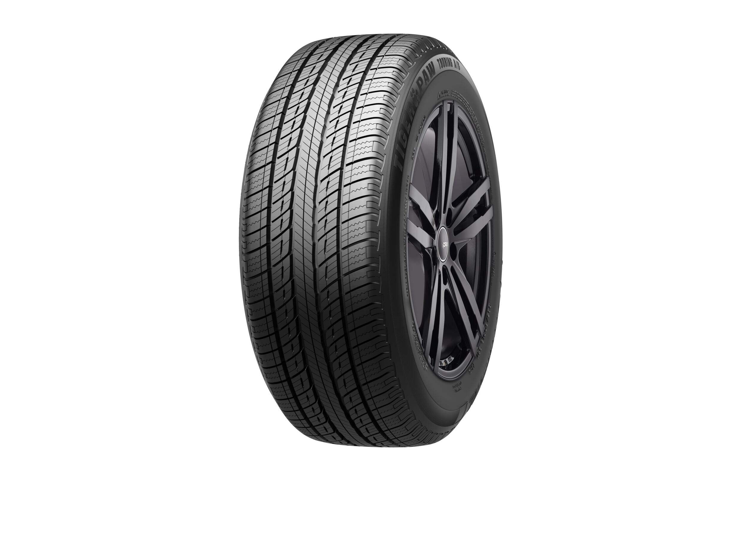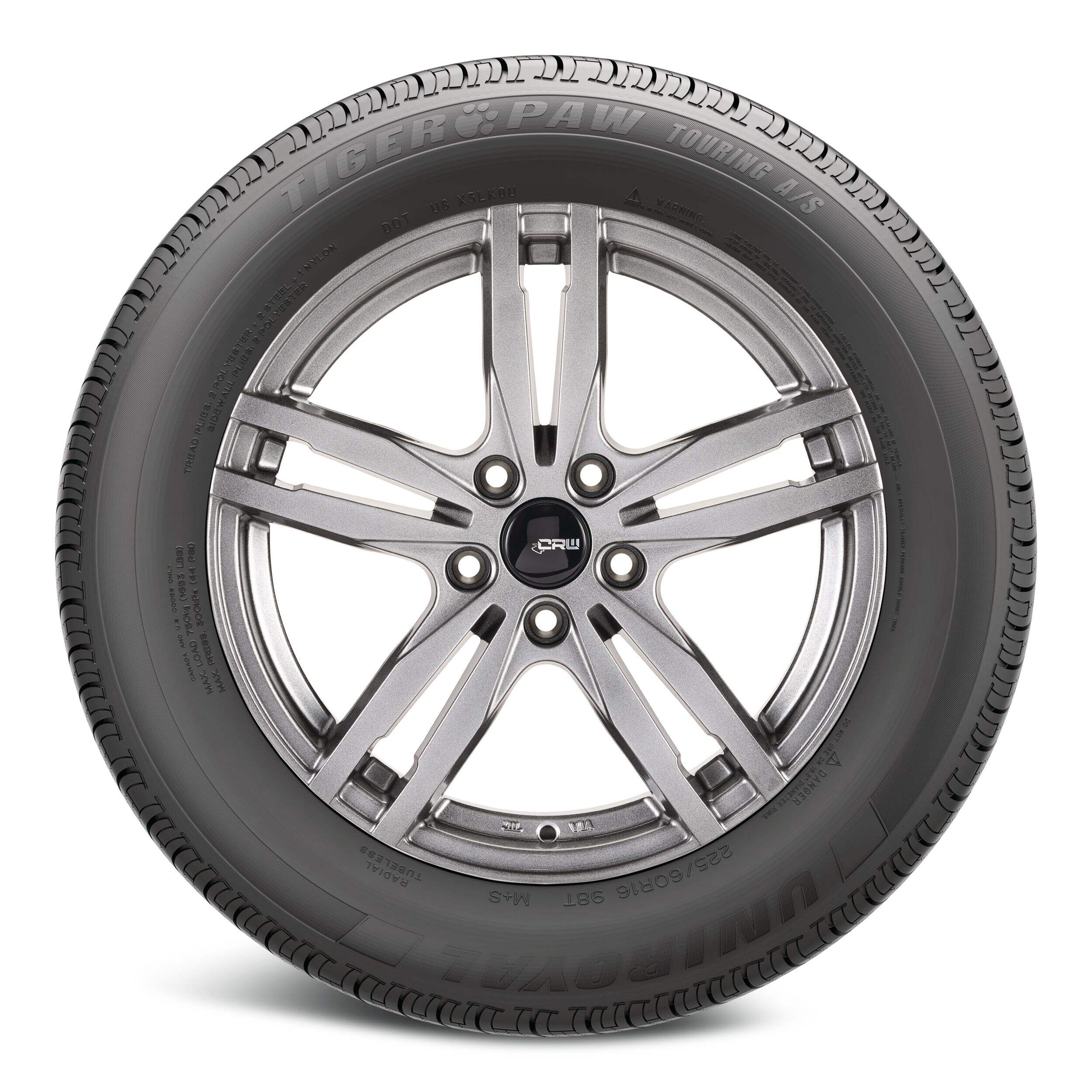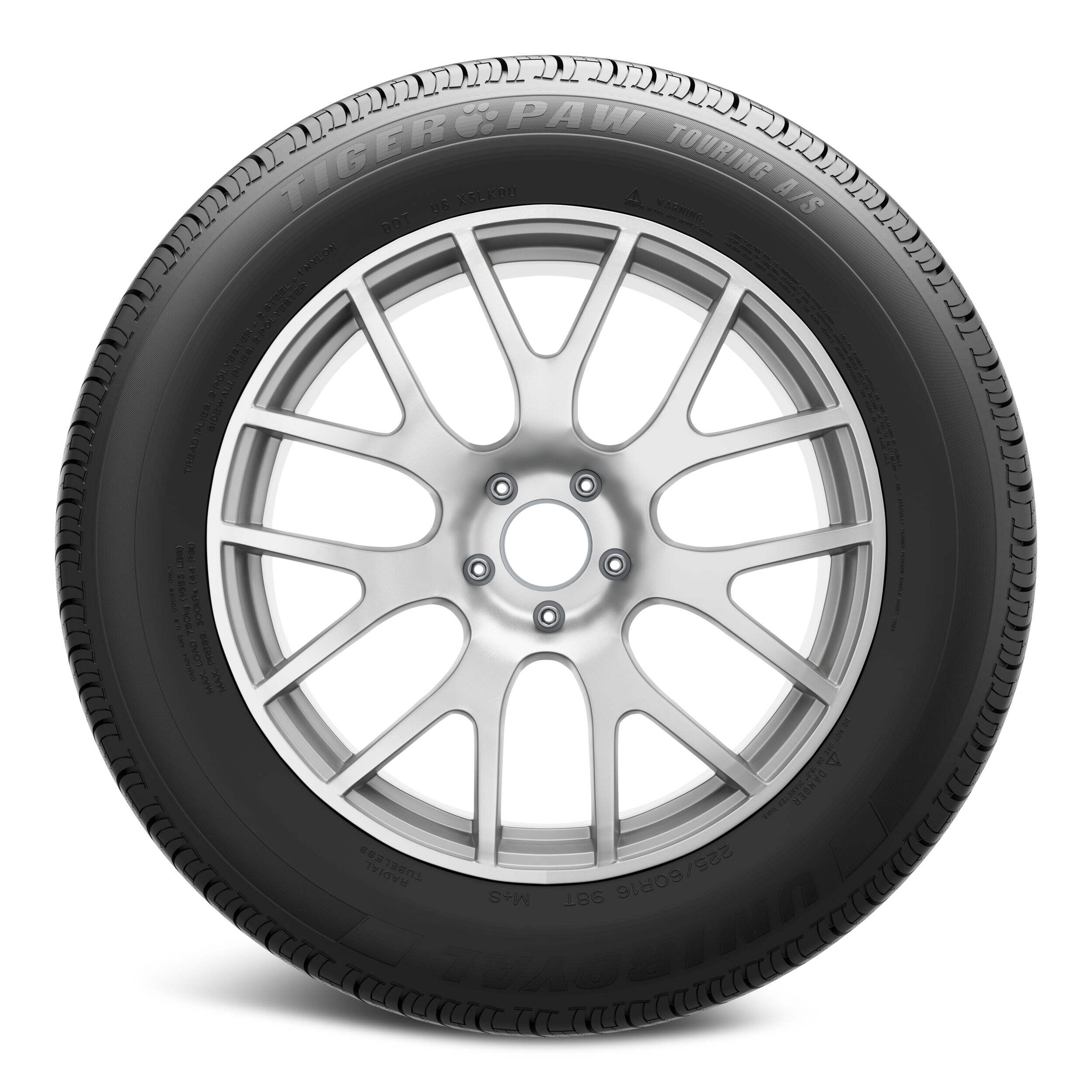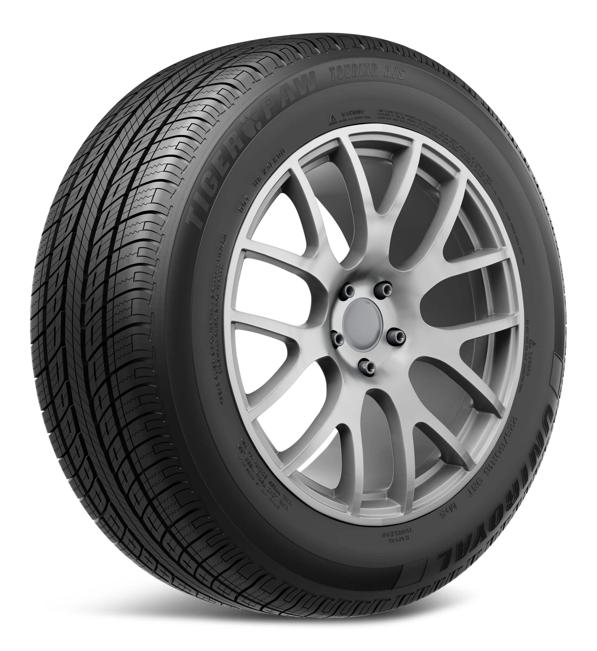 The Uniroyal Tiger Paw Touring A/S is a durable tire designed to meet the everyday needs of vehicles used for both highway and city driving. Its circumferential grooves enhance wet-weather performance by channeling water away from the tire for improved traction. The tread pattern promotes a longer lifespan while providing a comfortable, quiet ride. Zig-zag sipes on the tread blocks offer superior grip in slippery conditions, such as rain or light snow, and help efficiently evacuate slush and excess water, ensuring a safer driving experience.