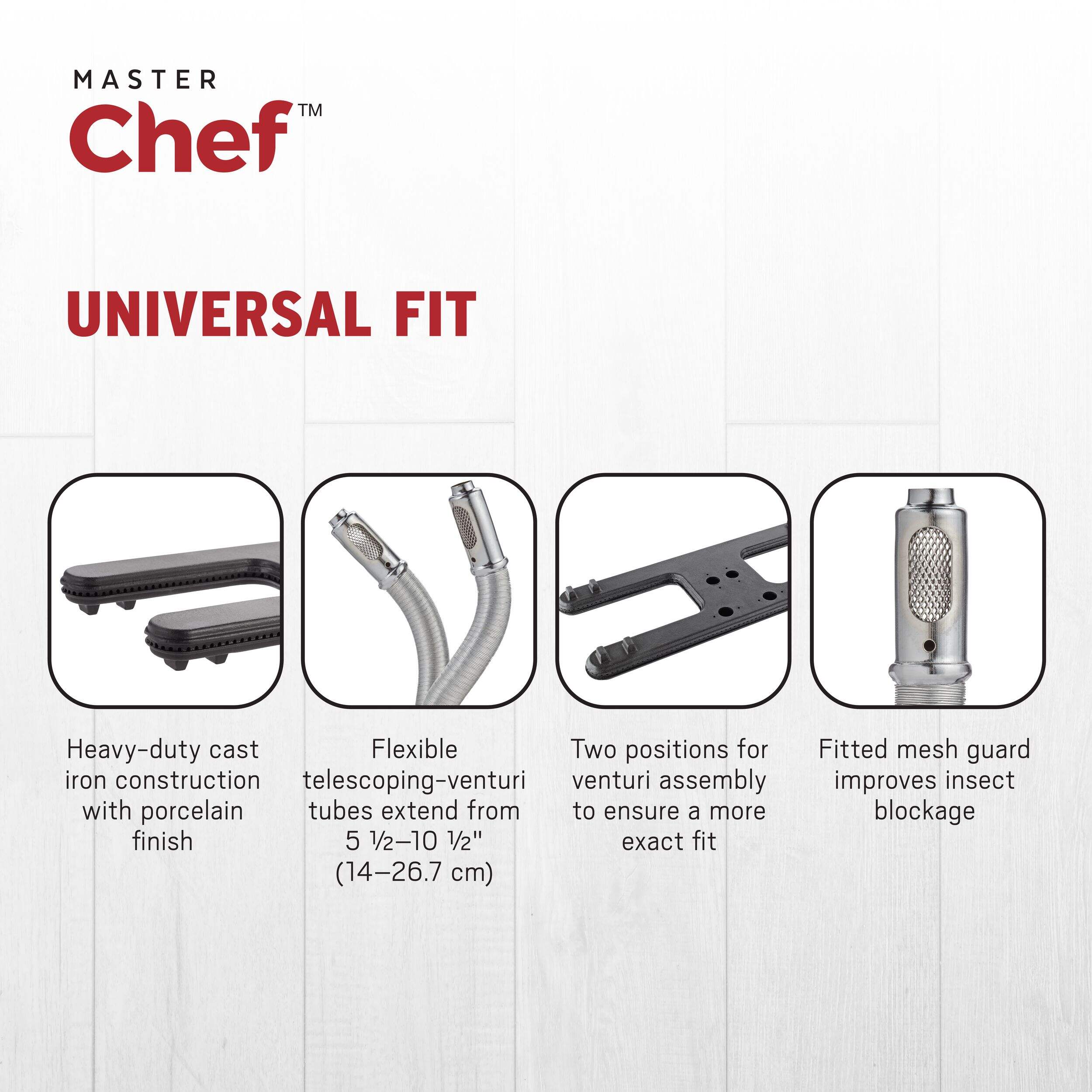 The Universal Fit Cast Iron Bar Burner, Large, features heavy-duty cast-iron construction with a porcelain finish. This large bar burner replaces most small H-burners on gas grills with two control knobs. It is specially designed for propane and natural gas models to give you a seamless cooking experience. Its flexible telescoping venturi tubes extend from 5 1/2 to 10 1/2 inches (14 - 26.7 cm). The barbecue burner includes two positions for venturi assembly and ensures a more precise fit. Additionally, its fitted mesh guard improves insect blockage. Sturdy and reliable, this cast iron burner includes a one-year exchange warranty.