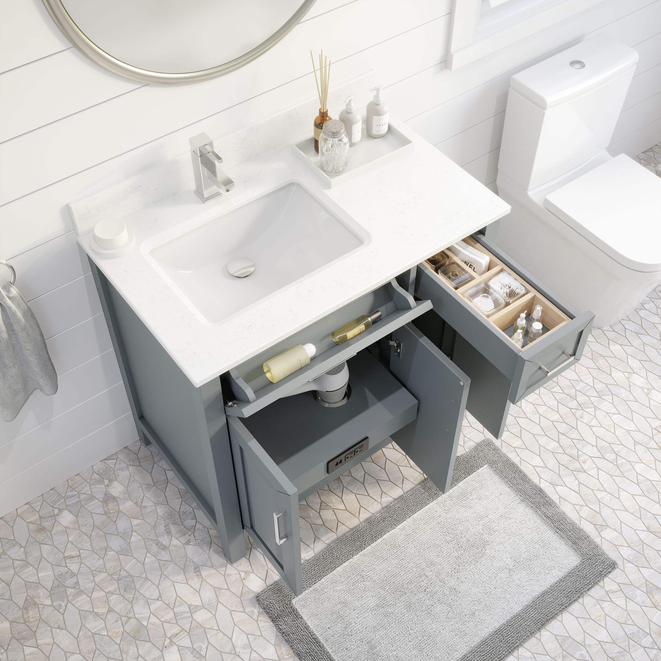 Terrence 36" (91.4 cm) Bathroom Vanity with Drawer and Cabinet Organizer features a premium solid hardwood frame with high quality plywood panel construction for a sturdy cabinet
