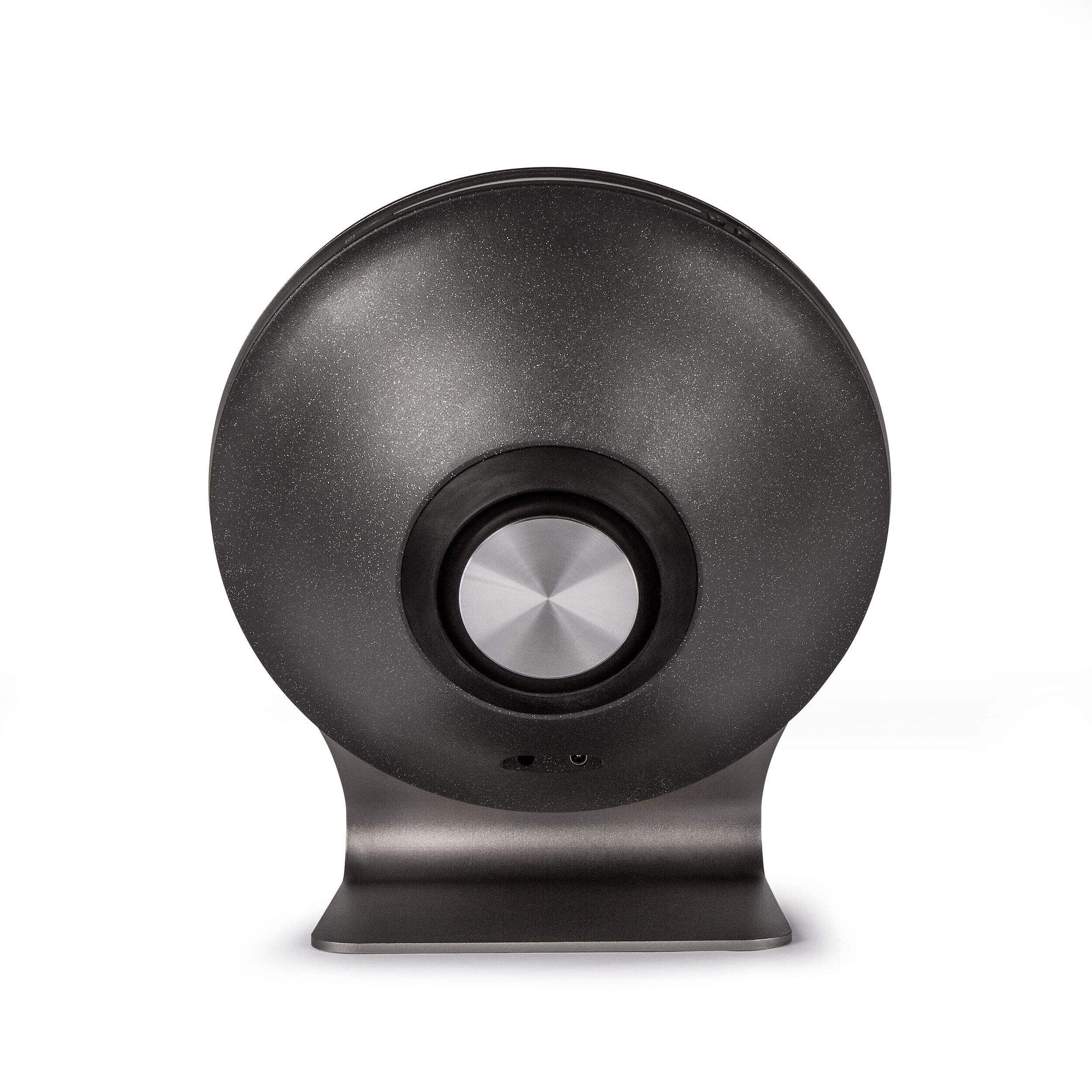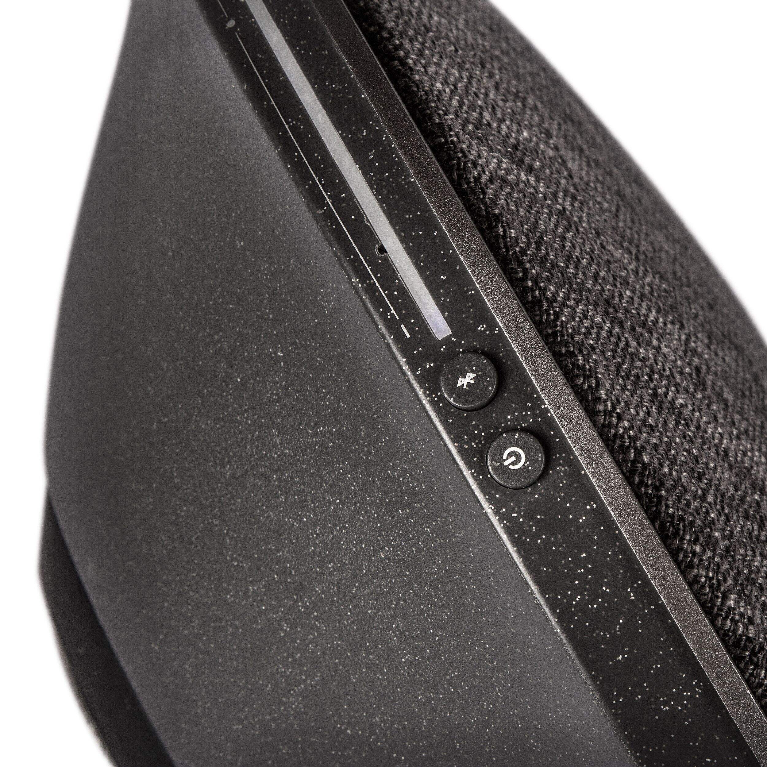 Stylish aluminium stand has a built-in Smart Touch swipe LED volume control and distinctive bass deflector