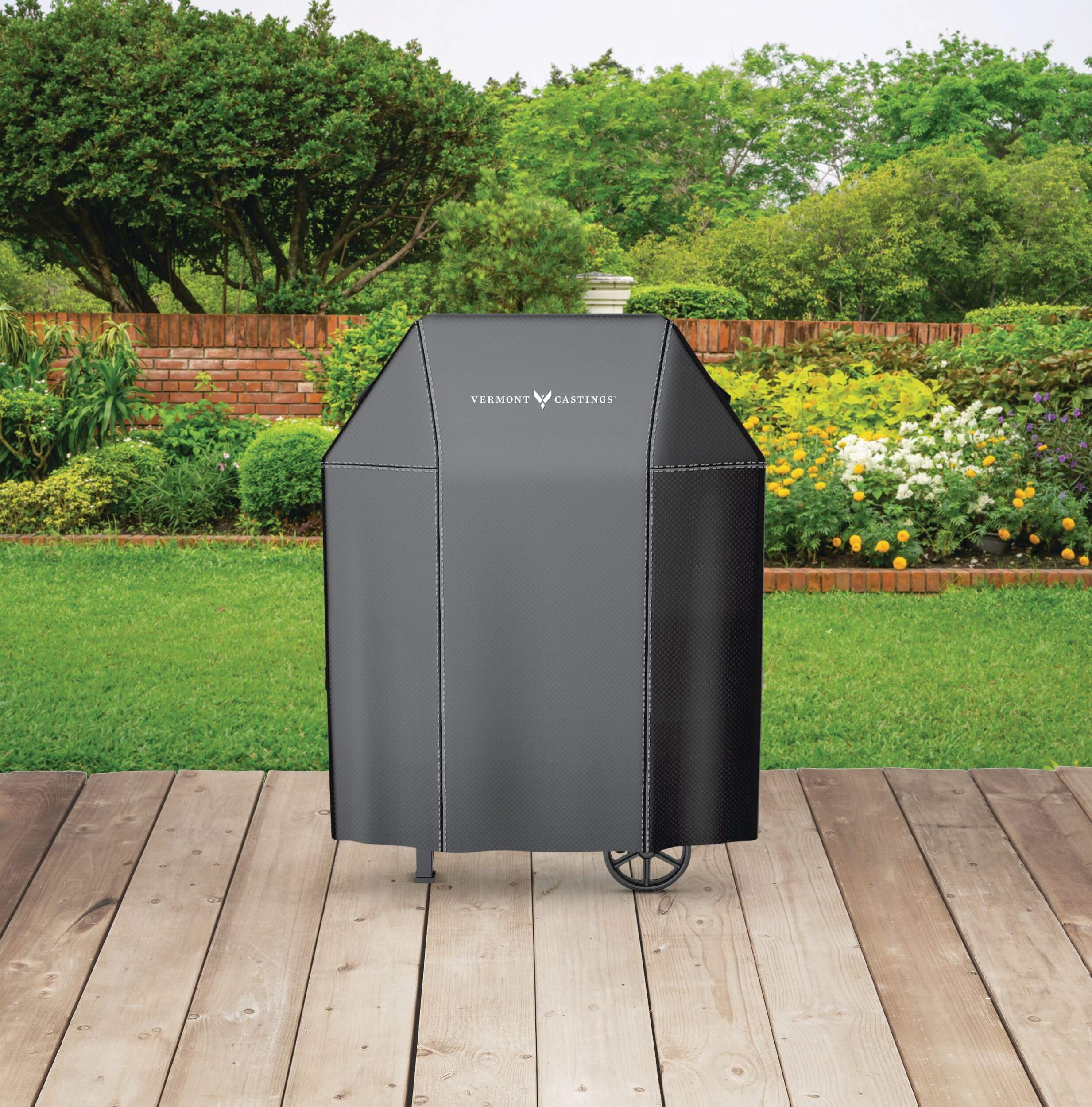 The Vermont Castings Grill Cover features a heavy duty, enhanced polyester construction that lasts