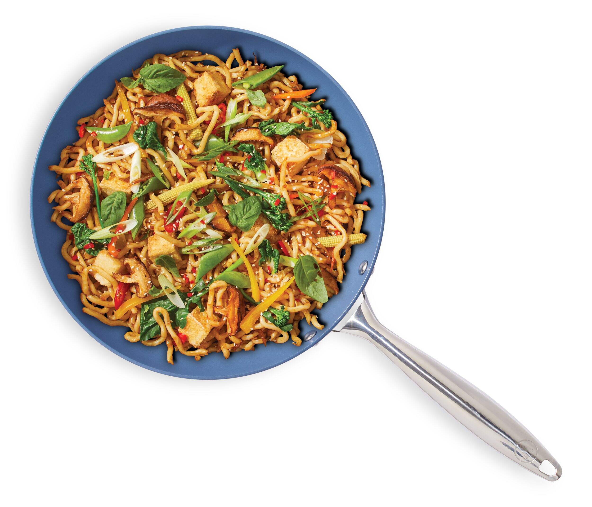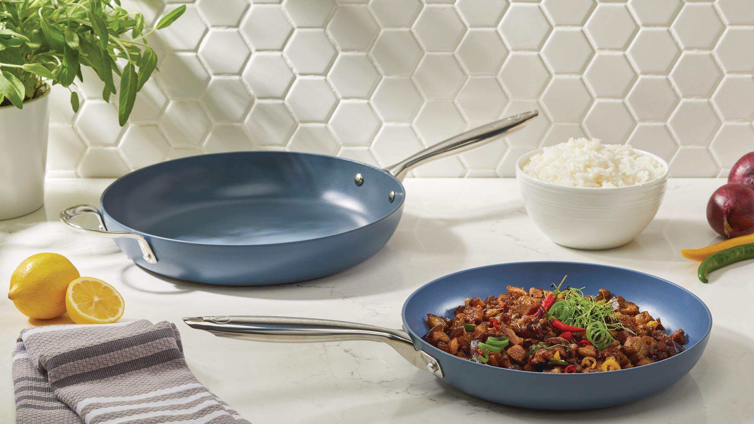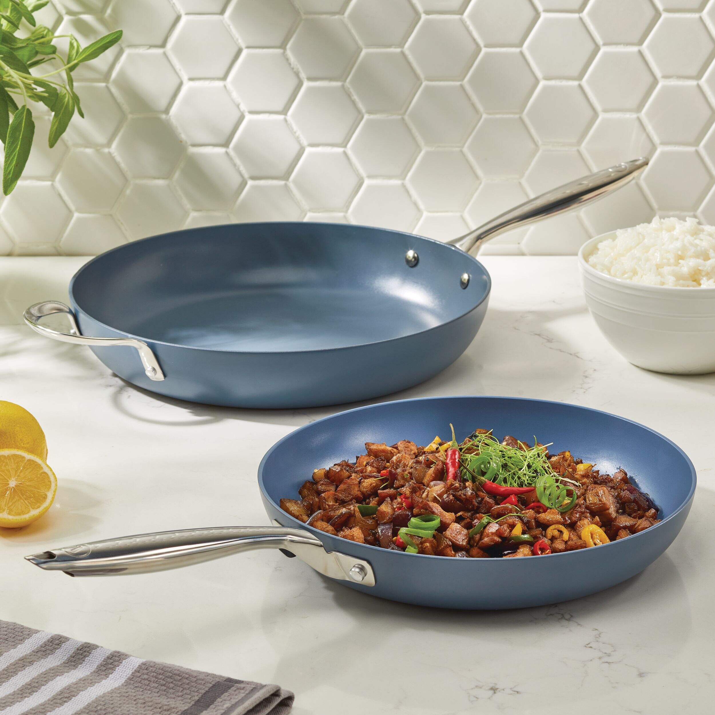 Cooking healthy meals is a breeze with this Vida by PADERNO 10 1/4" Non-Stick Frypan in serene blue. Its heavy aluminum body heats rapidly and evenly, while the GeoSheild 3-layer nonstick coating (PFOA and BPA-free) glides your food with ease. Copper and crystalline infusion mean this nonstick is ultra-durable too. Oven-safe to 450°F, the stylish blue-grey exterior looks sharp while the ergonomic handles keep you in control. Compatible with induction, gas, electric and more, this pan is ready to become your new kitchen workhorse.