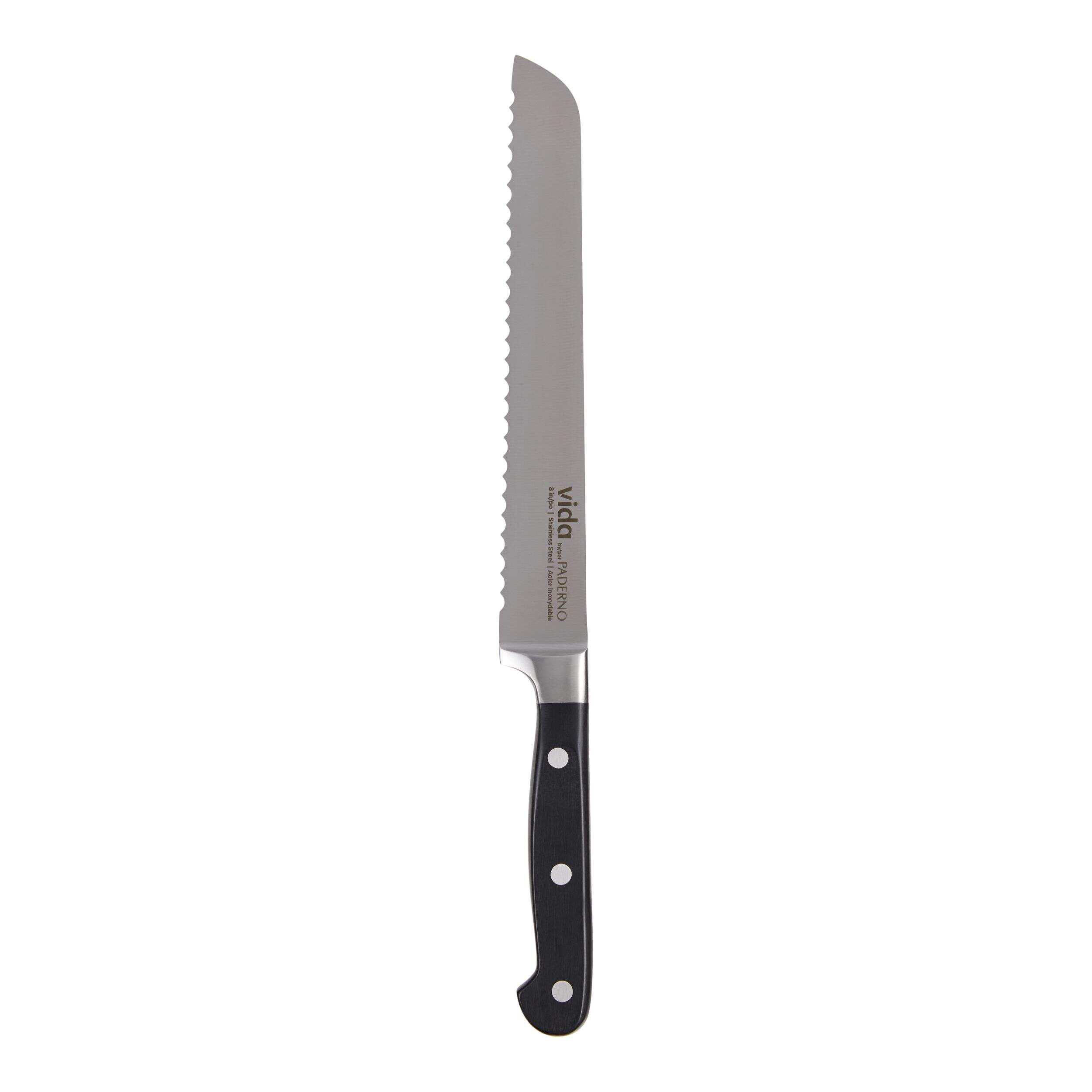 Sleek yet sturdy, the Vida by PADERNO Bread Knife brings modern style to the kitchen. Its triple-riveted handle provides a comfortable, stable grip while the full tang adds balance for precise slicing. The smooth bolster allows your hand to glide effortlessly along the handle as you cut. With its satin finish blade and elegant design, this bread knife makes an artful addition to your cutlery collection.