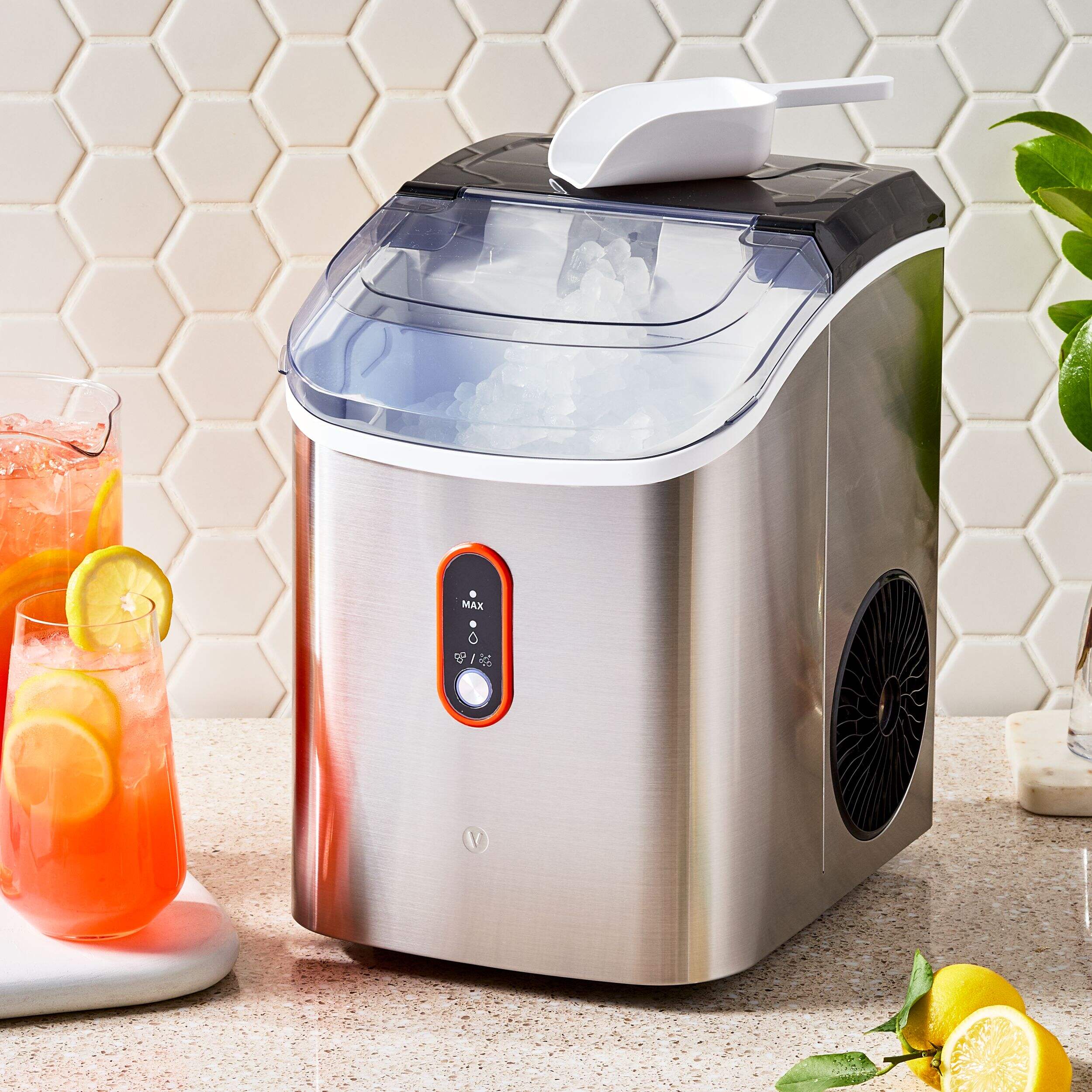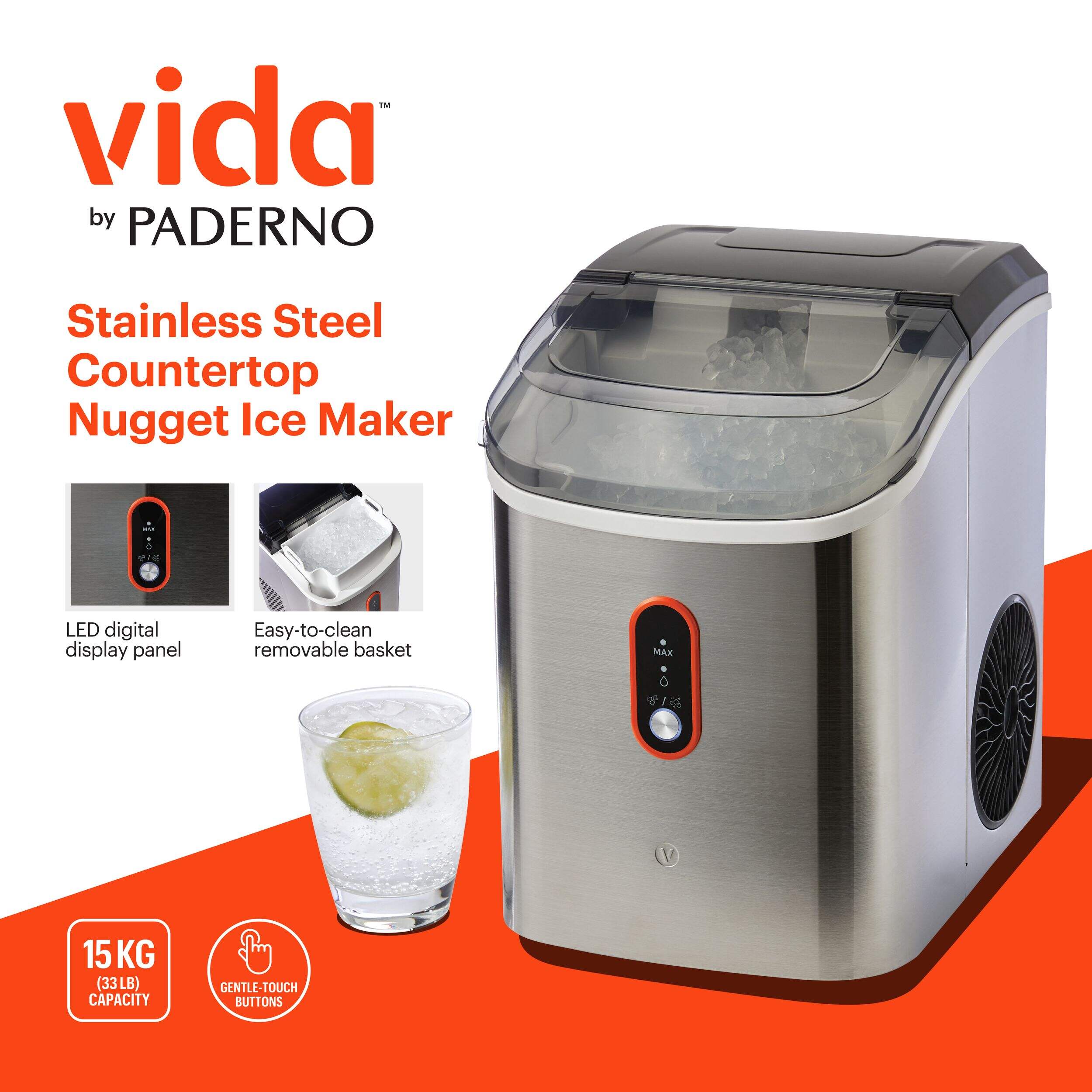 The Vida by PADERNO Stainless Steel Countertop Nugget Ice Maker transforms your kitchen into a haven of refreshment, producing a generous 12-15kg (26-33lb) of soft, chewable nugget ice. With its quick churn time, you'll enjoy the first delightful ice cubes within just 10 minutes. Compact yet powerful, this sleek design includes a removable ice basket and scoop, making it both a practical and elegant addition to your home.