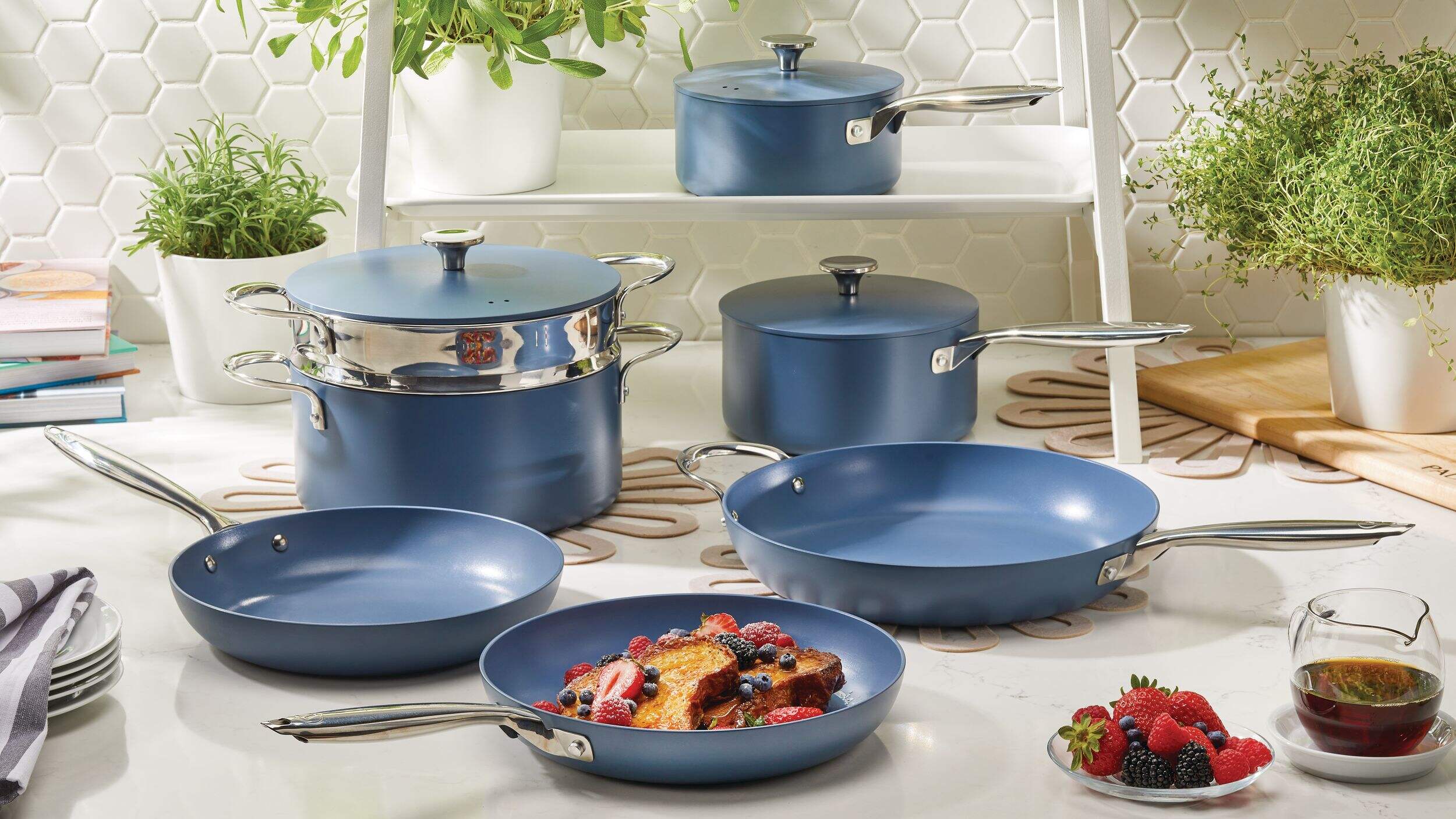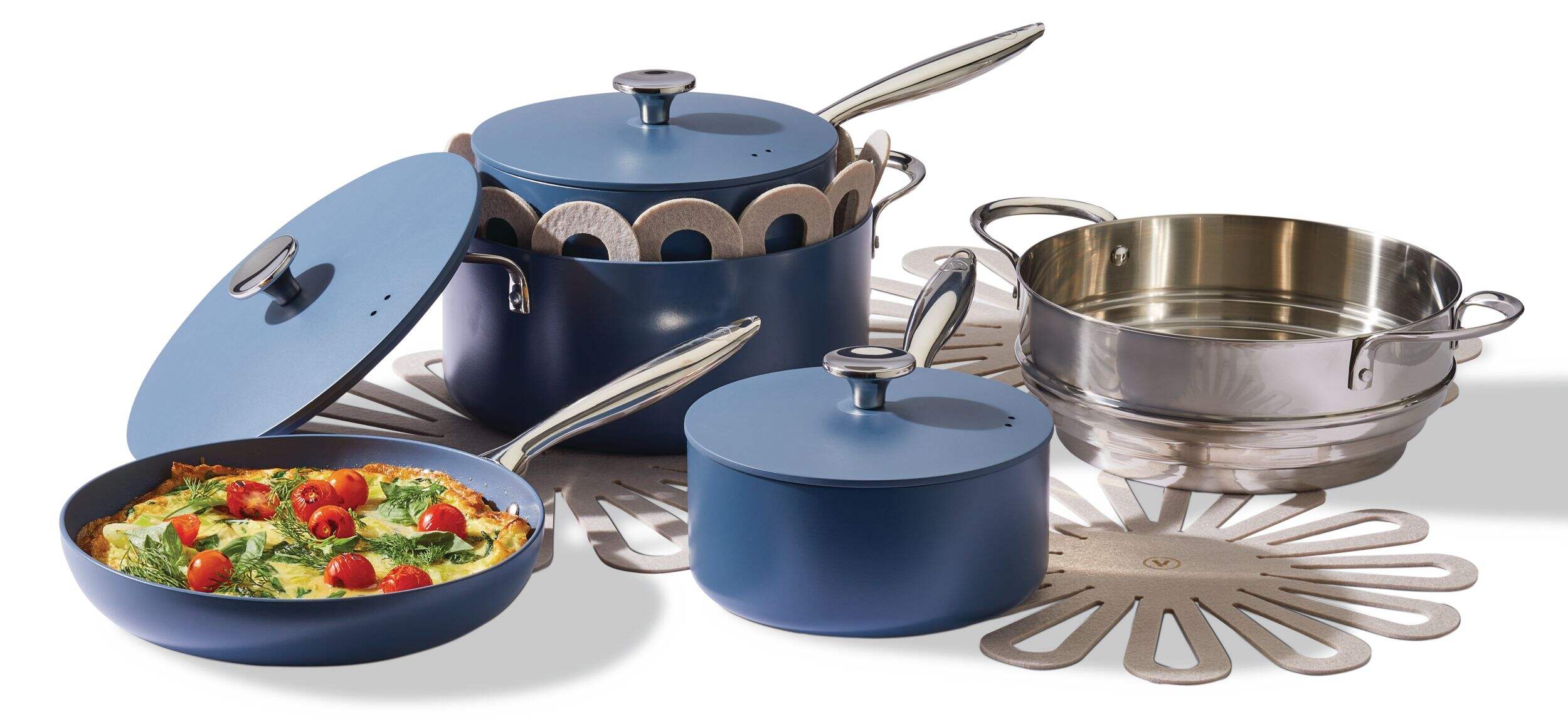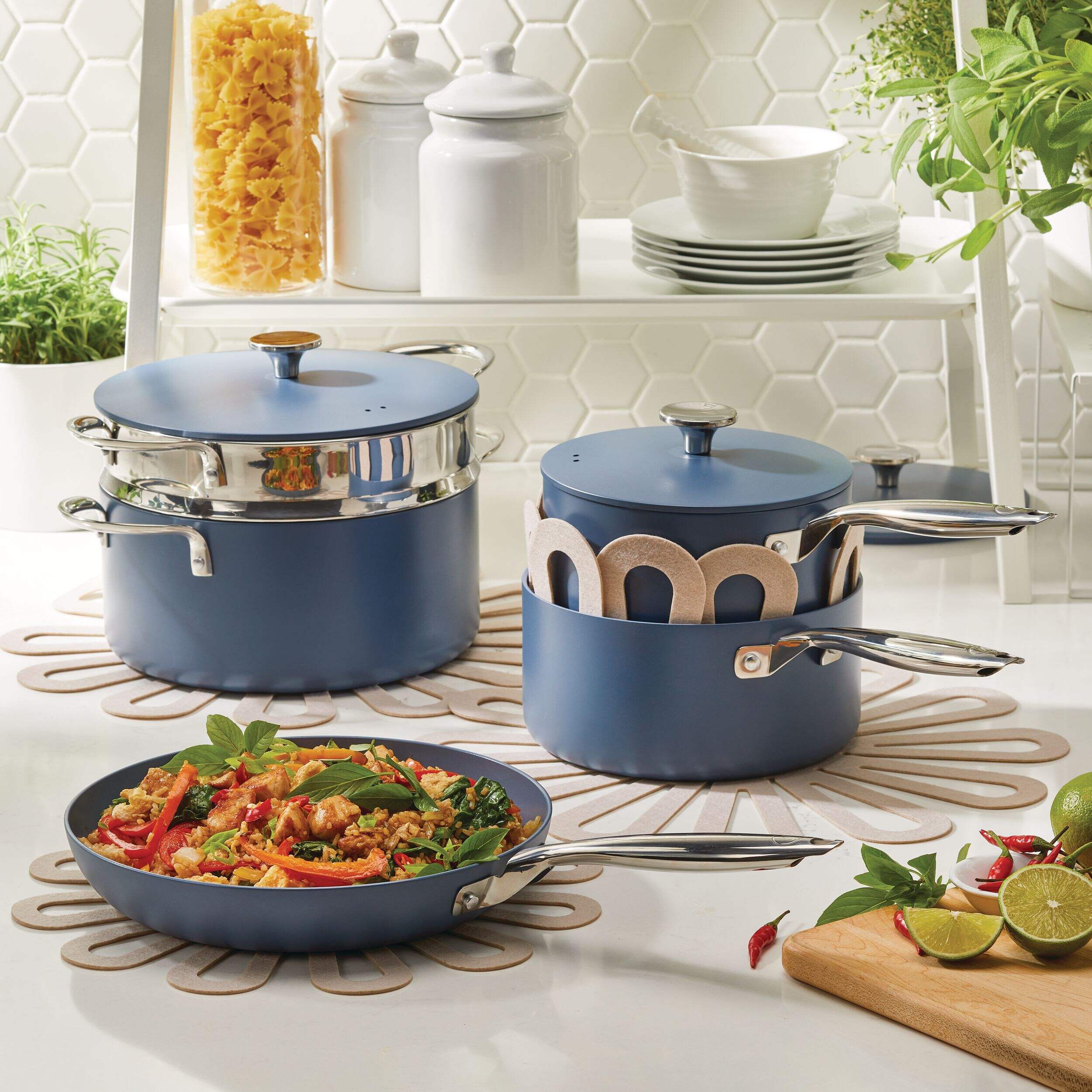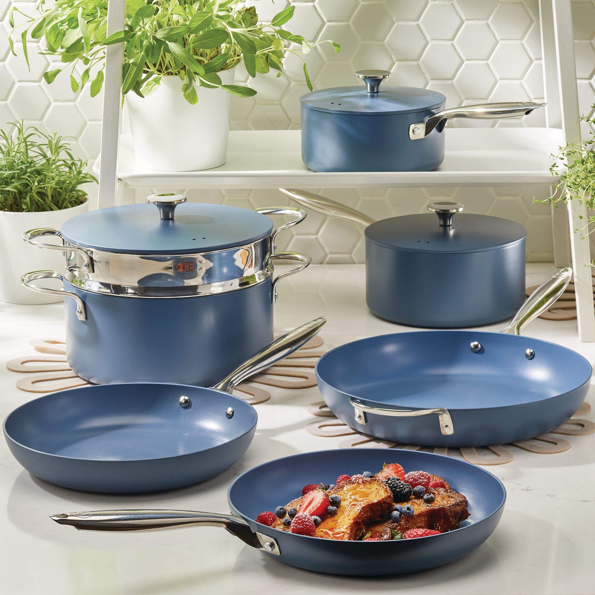 The Vida by PADERNO Non-Stick Cookset offers versatile performance and stylish design, perfect for any kitchen. It’s compatible with electric, gas, ceramic, halogen, and induction cooktops, allowing flexibility across all types of stoves. The self-basting lids feature venting holes to control steam release for more flavourful meals, while the serene Bluefin exterior, a soothing blue with cool grey hints, adds a refined touch. Thoughtful details include felt pot protectors, ensuring safe, scratch-free storage. This cook set combines convenience, durability, and beauty in every meal.