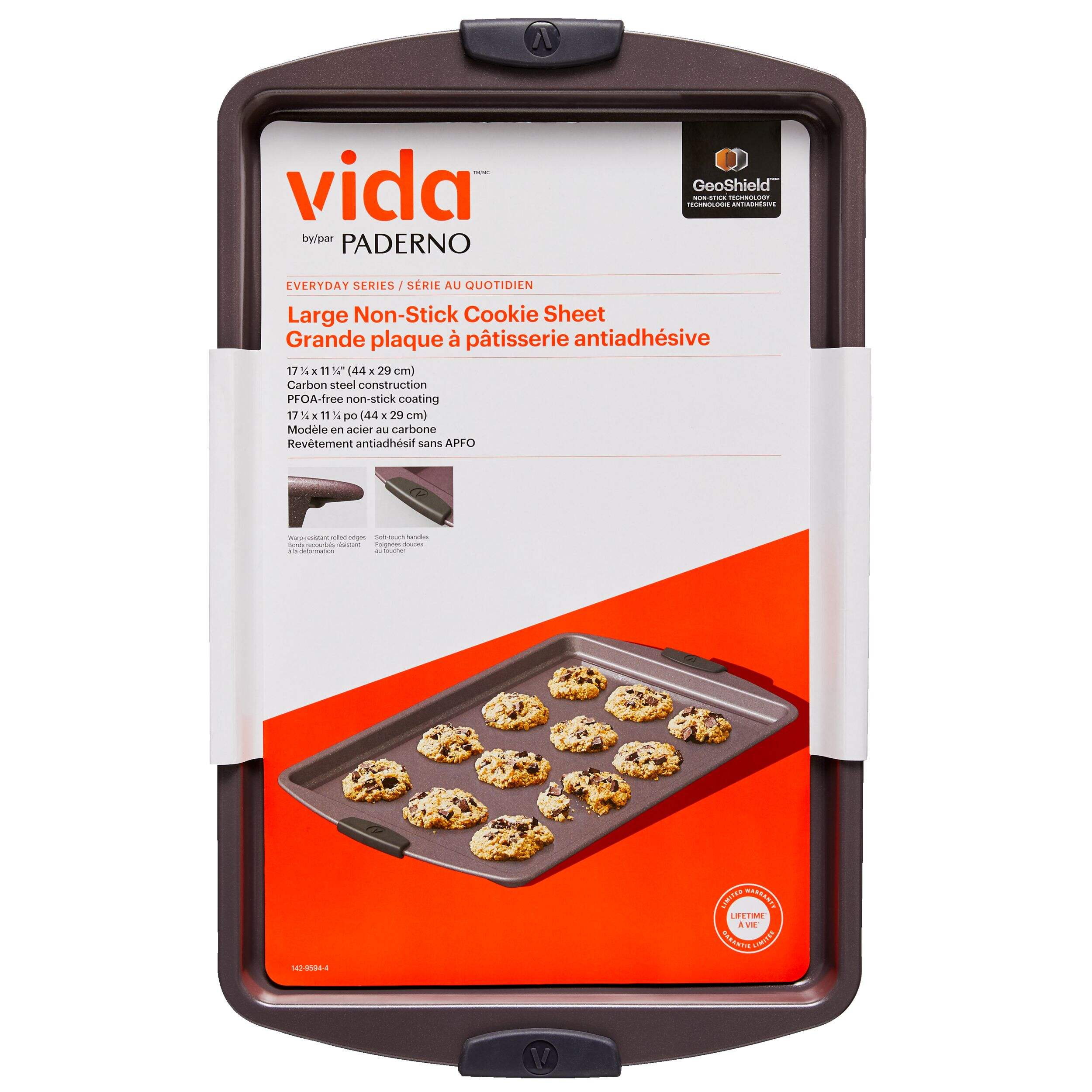 Introducing the Vida by PADERNO Non-Stick Large Baking Sheet, a must-have tool for any baker’s kitchen. Crafted from heavy-gauge carbon steel, this baking sheet features a two-layer non-stick coating for quick food release and easy cleanup. With silicone wrap-around handles for easy lifting and rolled edges to prevent bending, it ensures durability and convenience. Ideal for baking cookies, bread, and more, this sheet is PFOA- and BPA-free.