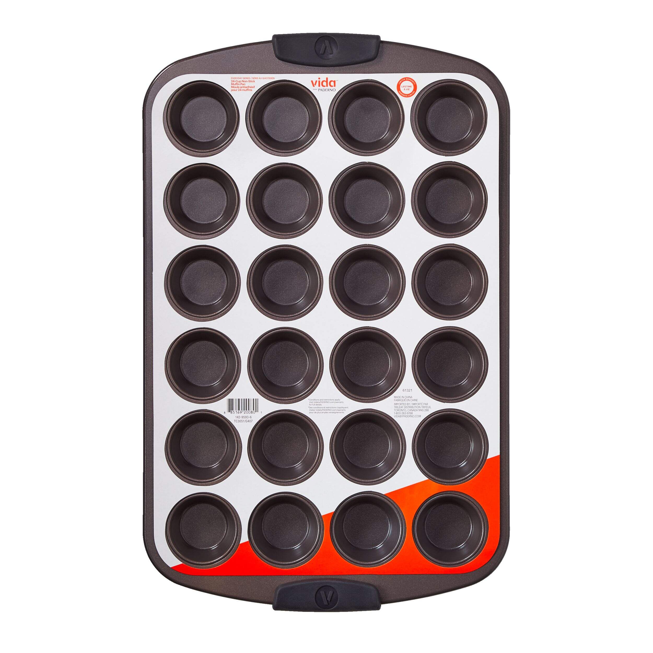 Step up your muffin making with this Vida by PADERNO Muffin Pan. Designed for optimal baking, this muffin pan features an innovative non-stick coating that seamlessly releases food, giving you perfect muffins and making clean-up a breeze. The durable carbon steel construction provides lasting use while the 24-cup capacity makes it easy to bake crowd-pleasing batches. Expand your baking skills by whipping up new recipes with this easy-to-use muffin pan.