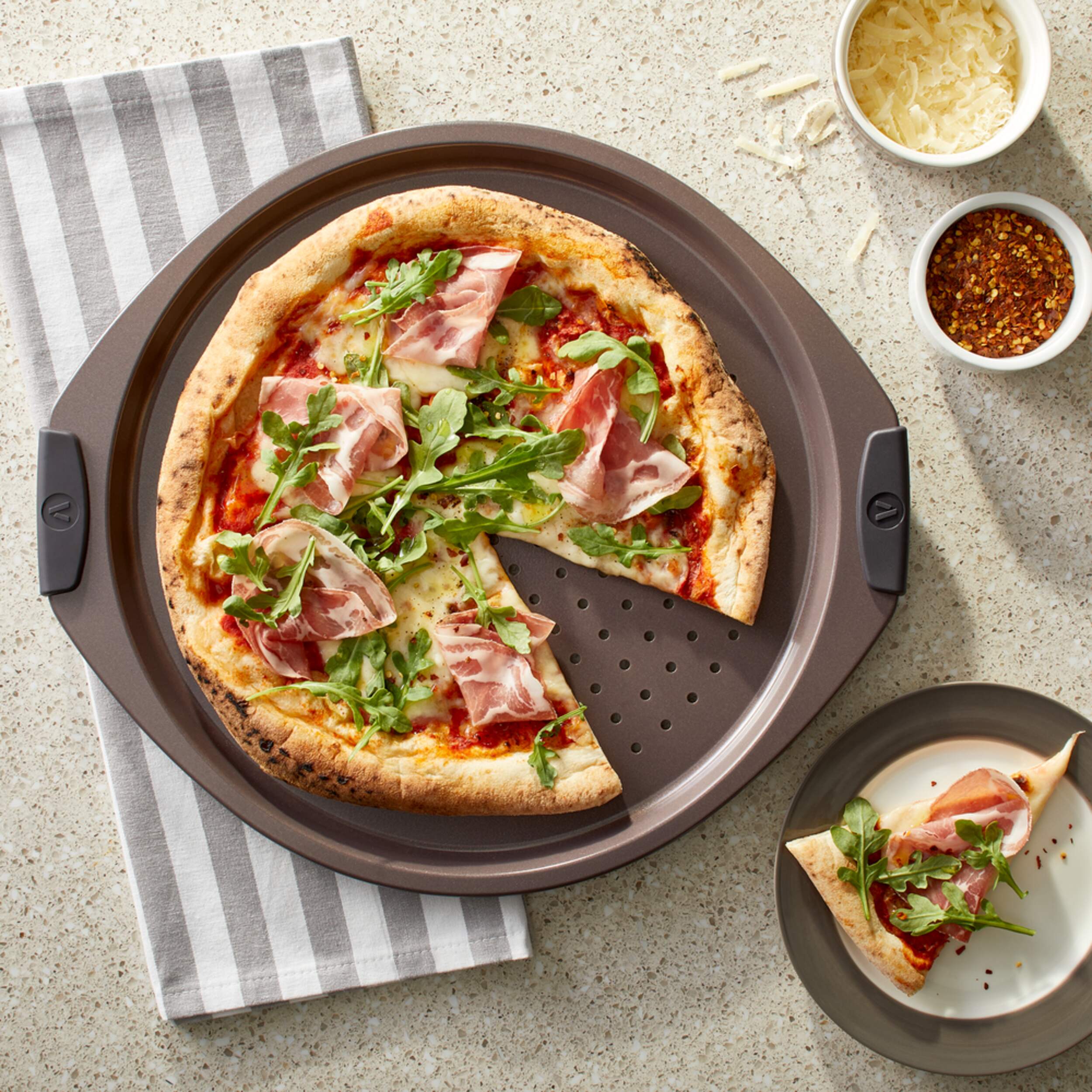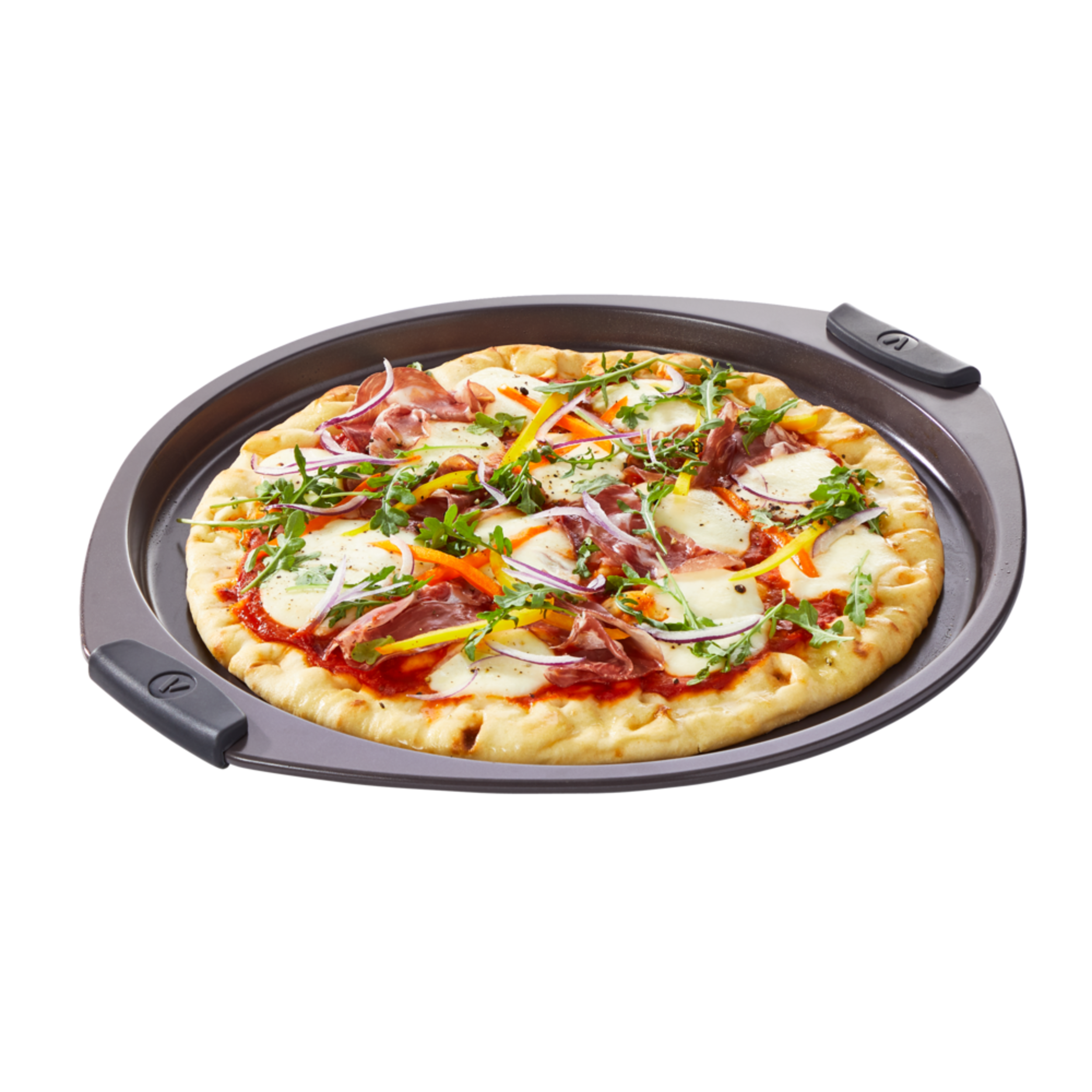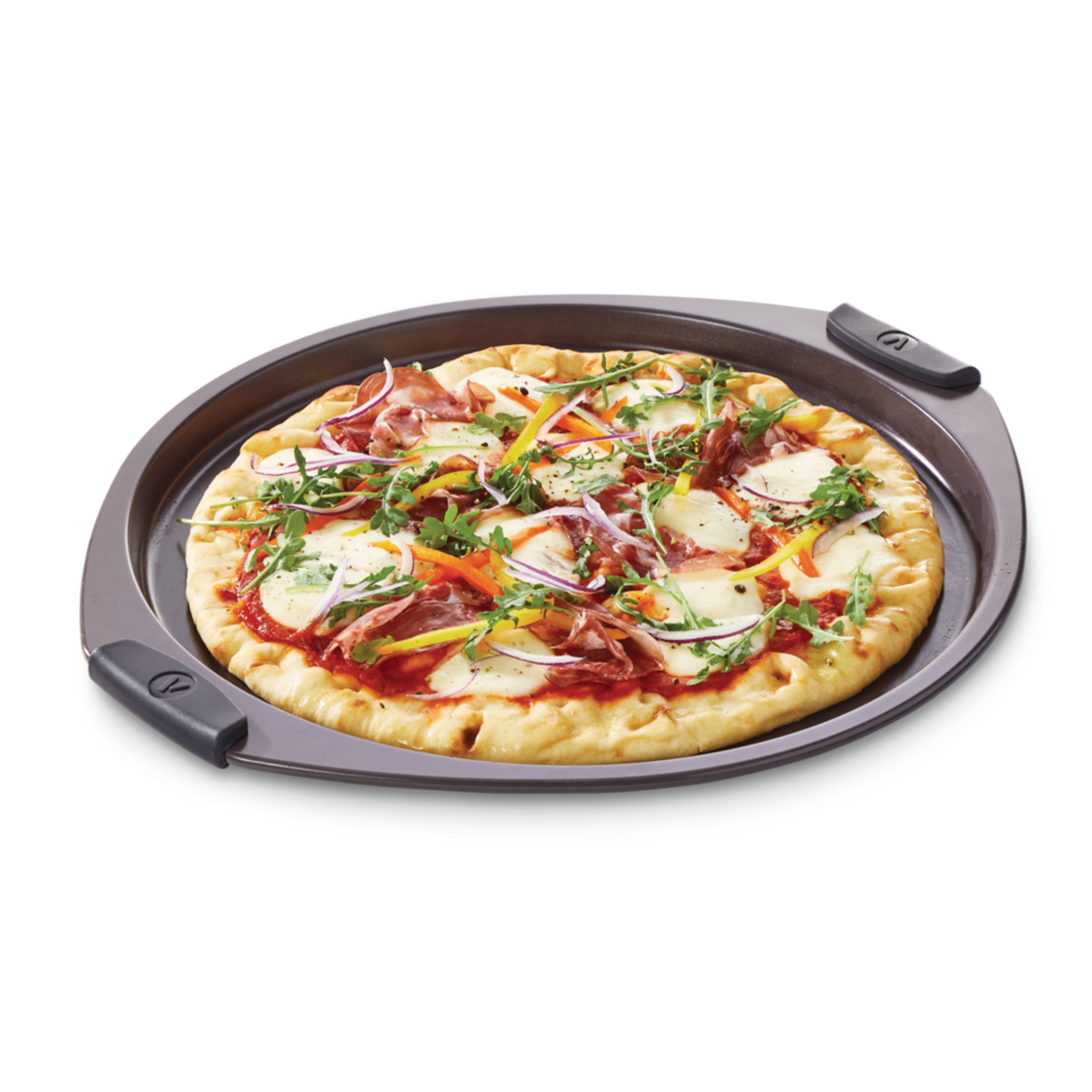 For those pizza-lovers who covet a crispy crust, the Vida by PADERNO Pizza Crisper Pan delivers the goods. The specially designed base allows heat to circulate for a firm pie every time. This round pan features heavy-gauge carbon steel construction for even heat distribution and optimal browning. The two-layer non-stick coating provides quick food release and easy cleanup, while silicone wrap-around grips ensure safe, secure handling to and from the oven.
