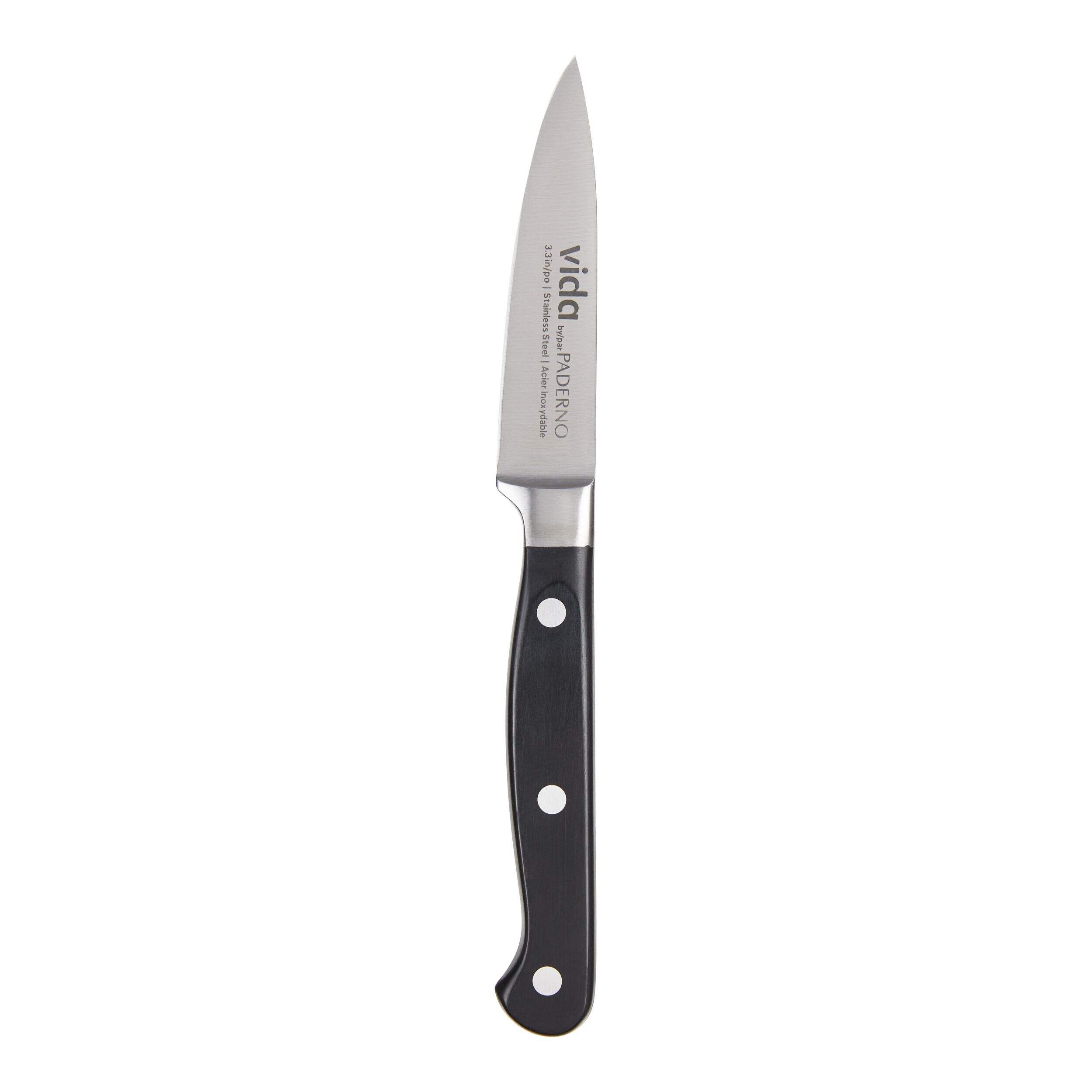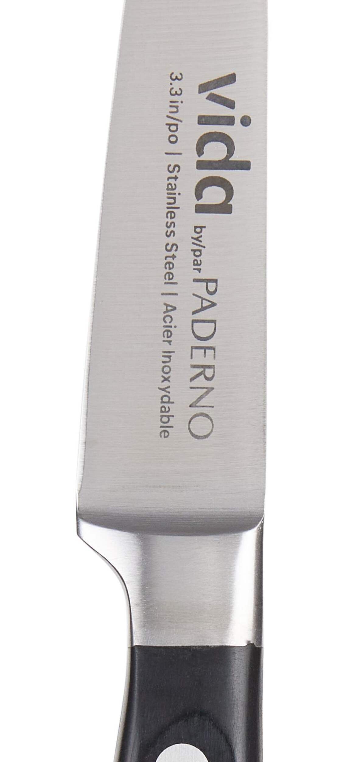 The Vida by PADERNO Paring Knife brings elegant design to meal preparation. This versatile paring knife features triple-riveted handles and a smooth bolster for a comfortable grip. The full tang construction provides stability from tip to end of the handle. With a satin finish and precisely honed blade, this paring knife slices, dices and minces with ease. An essential for any kitchen, this knife makes food prep simple and stylish.
