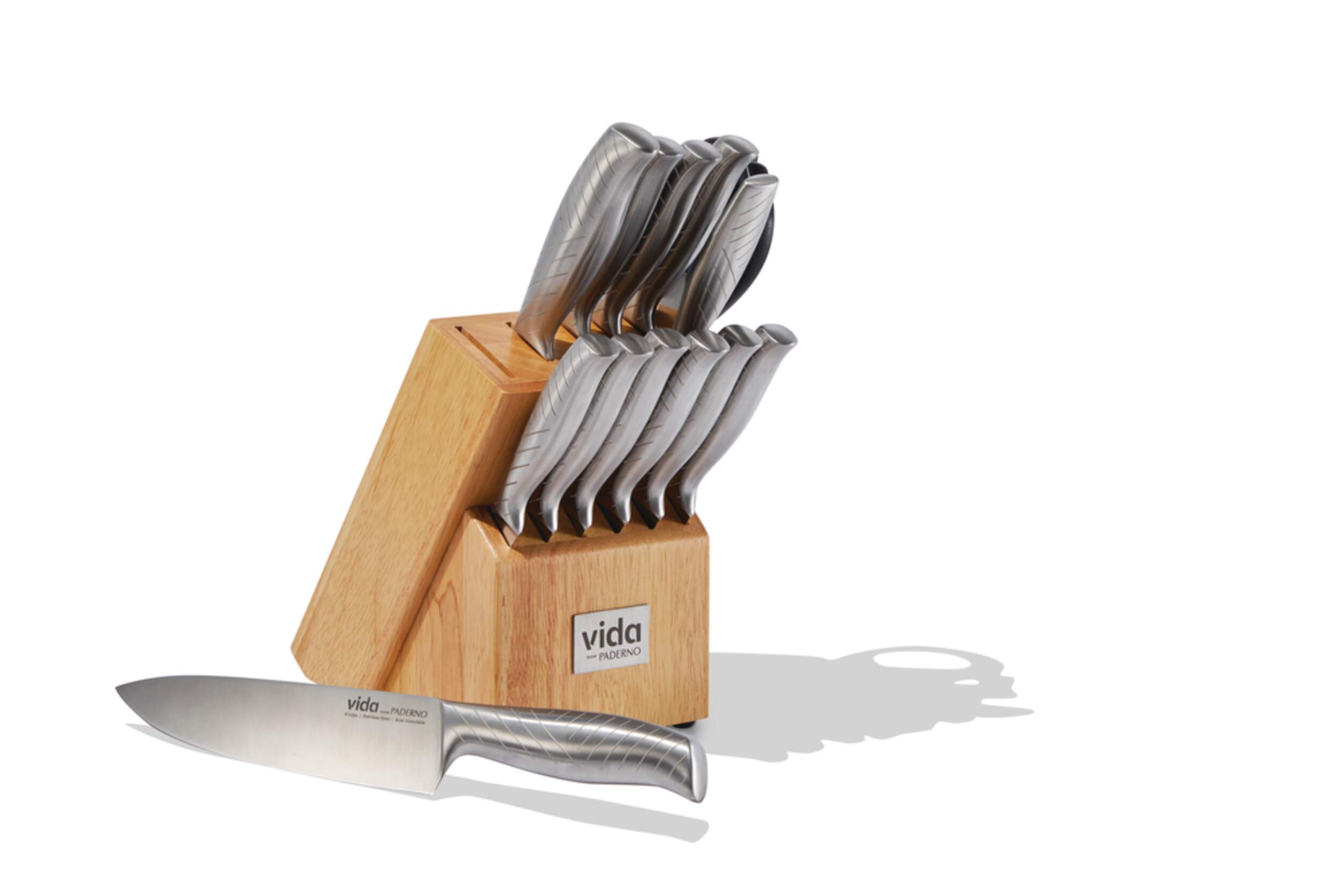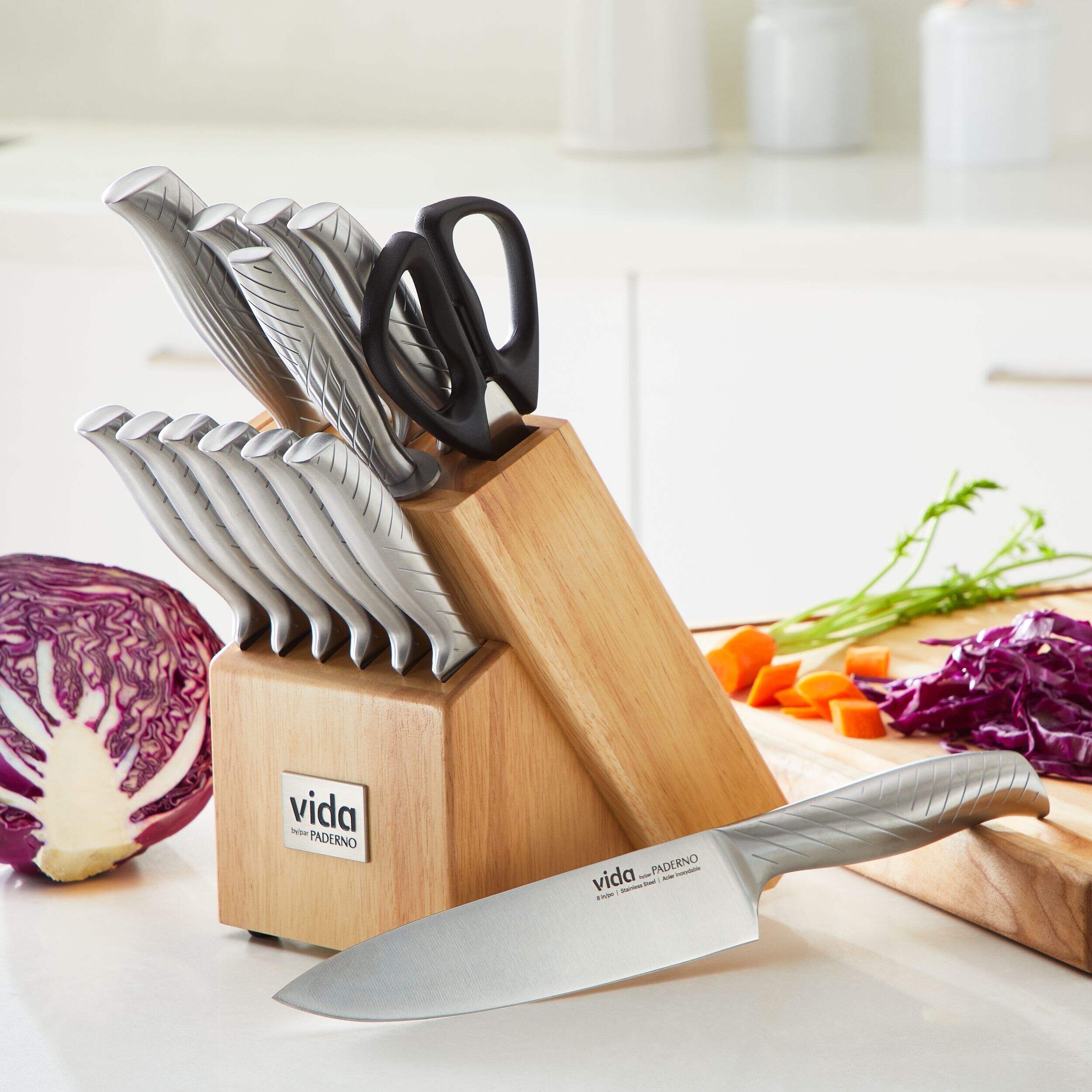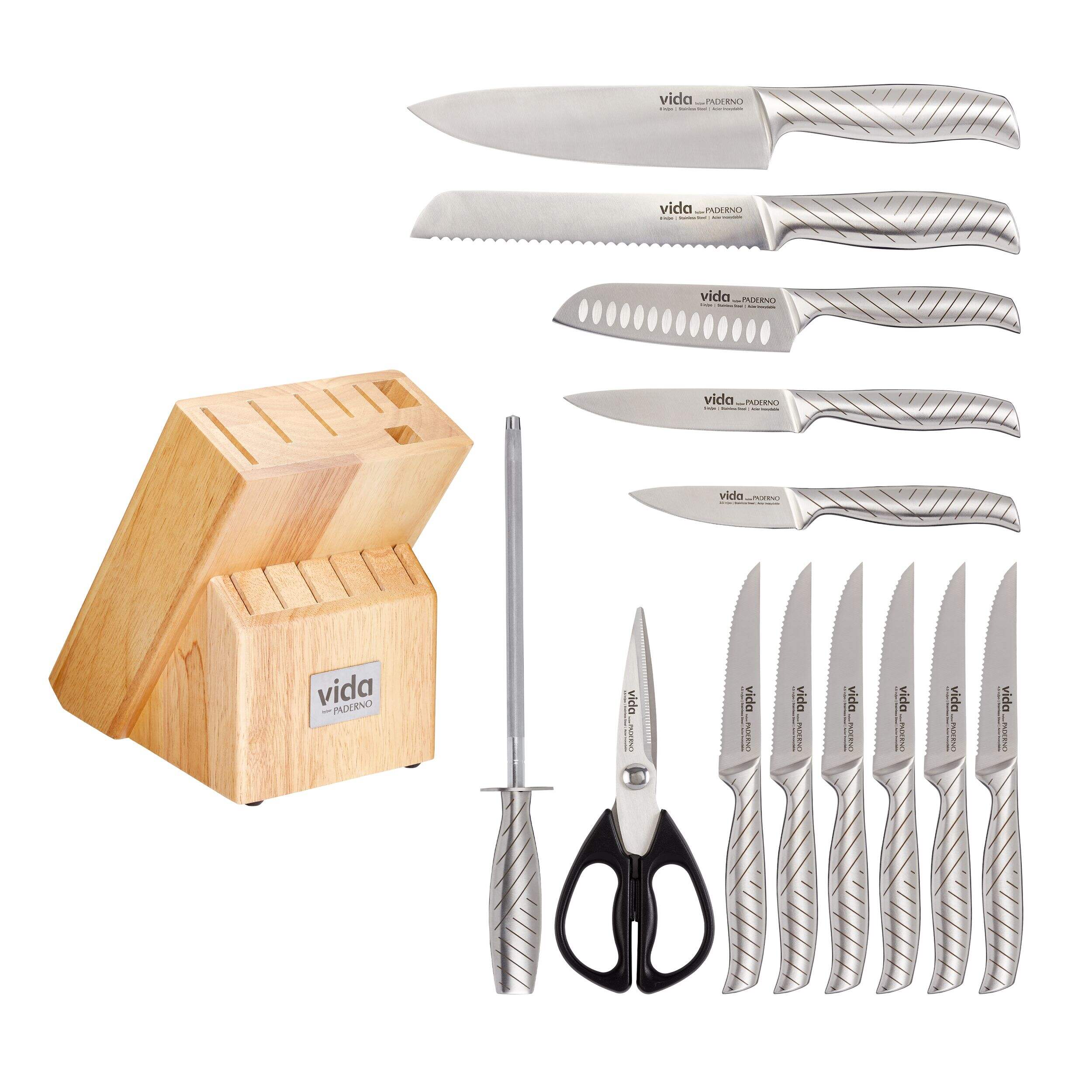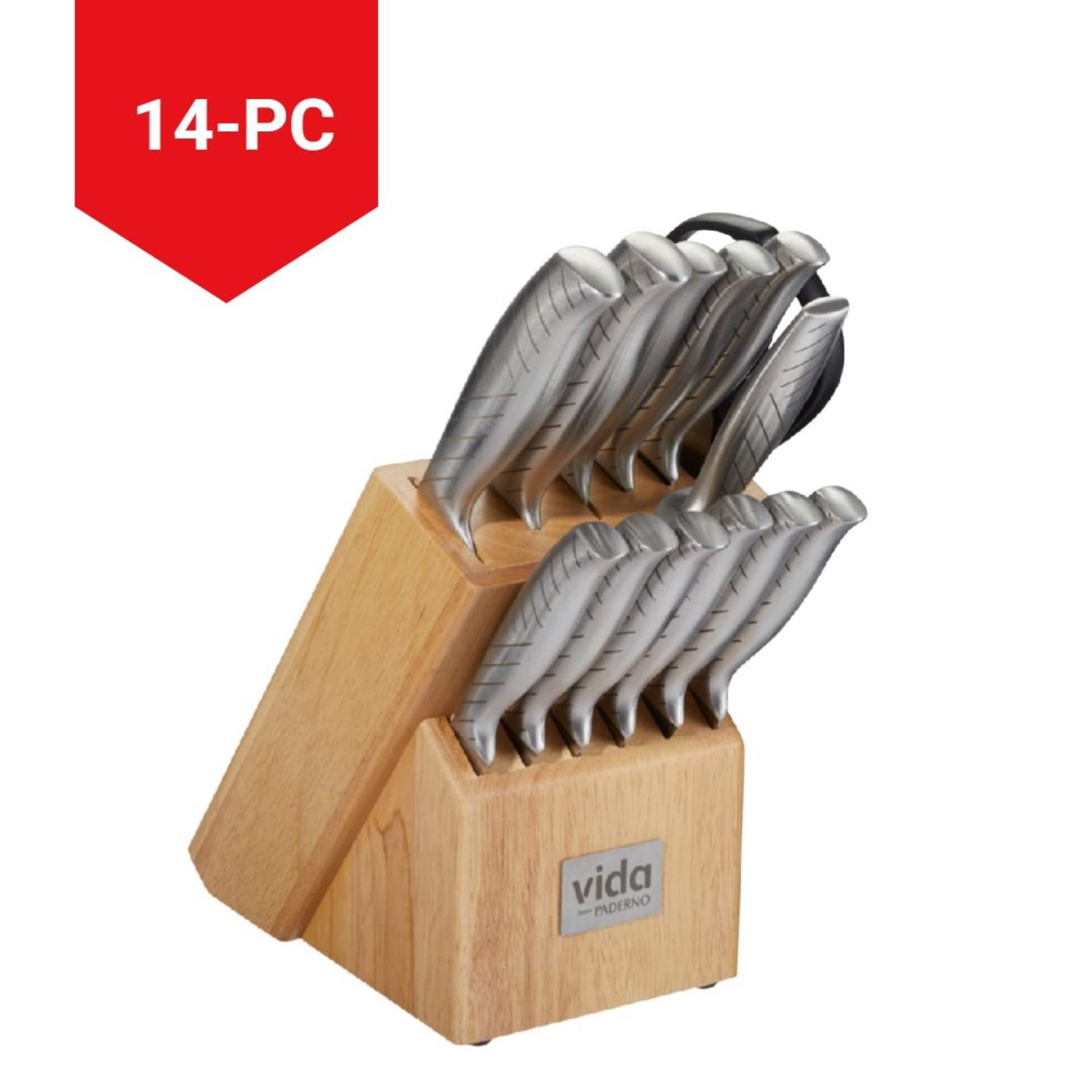 Chopping, dicing and slicing is smooth and easy with the Vida by PADERNO Stainless Steel Knife Block Set. This 14-piece knife set features 11 knives, honing steel, all-purpose shears and a wood block to take care of all your cutting needs. Designed with high-carbon stainless steel, this durable knife set is built to last.