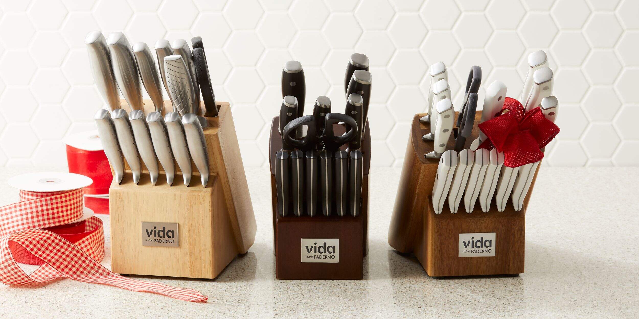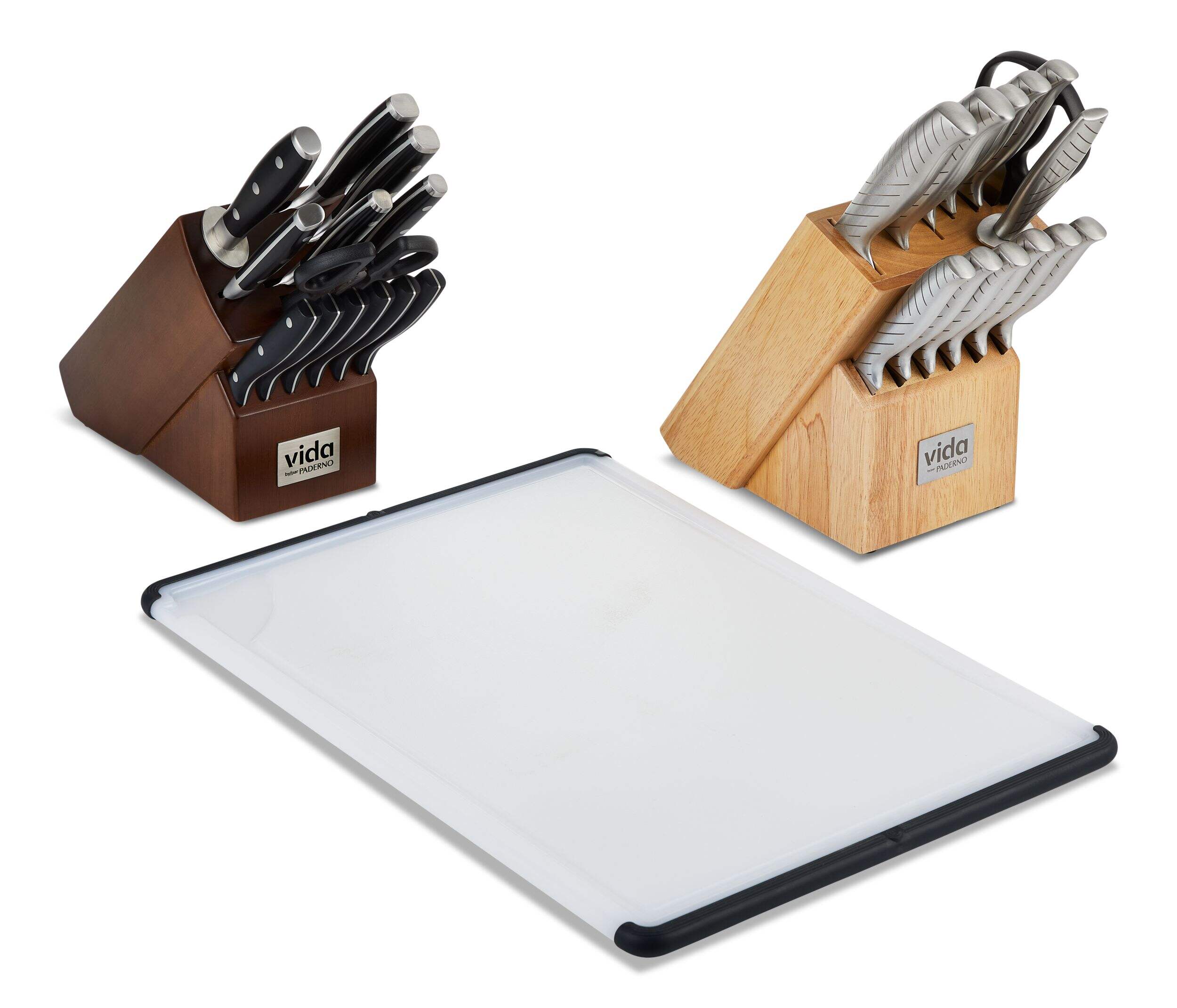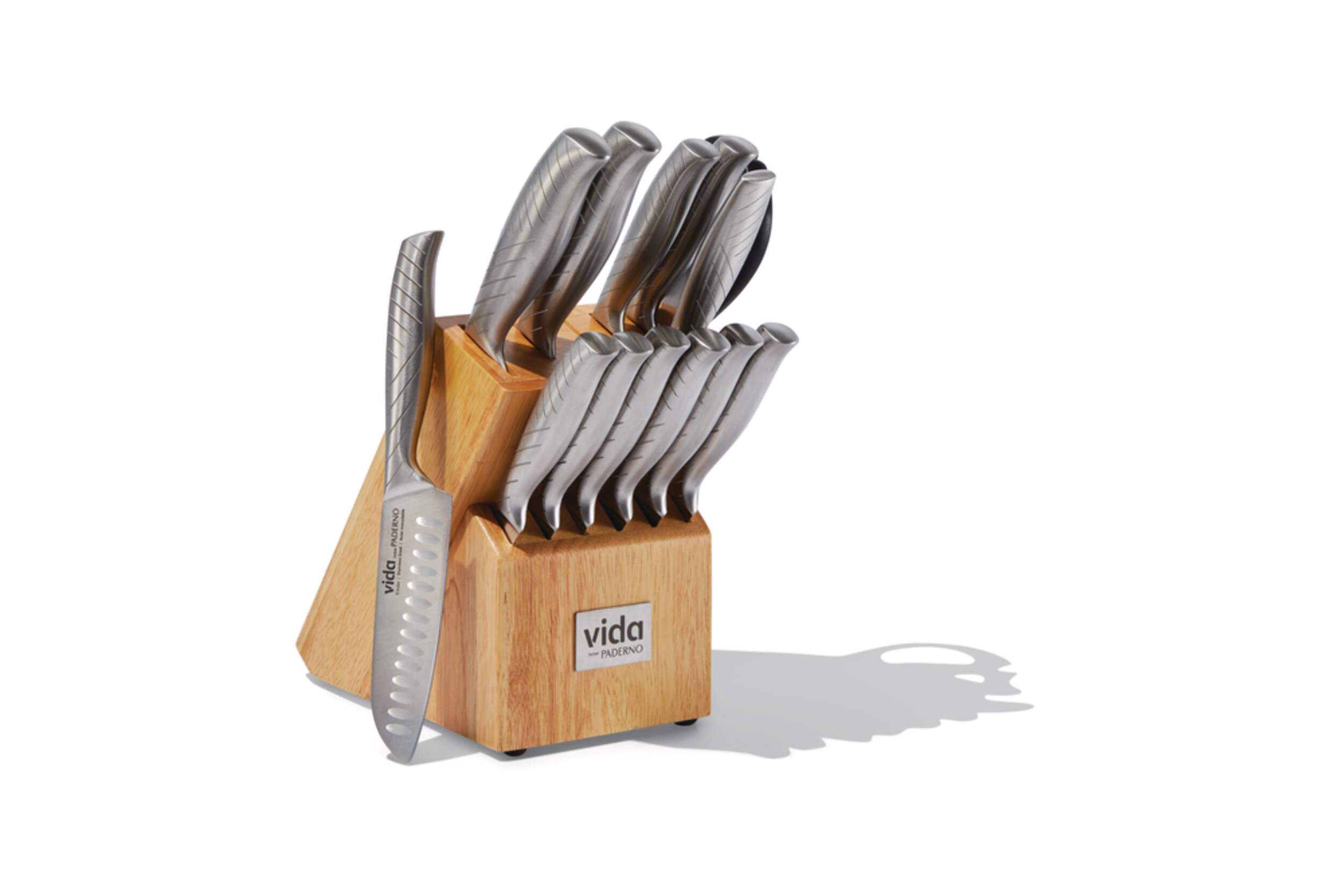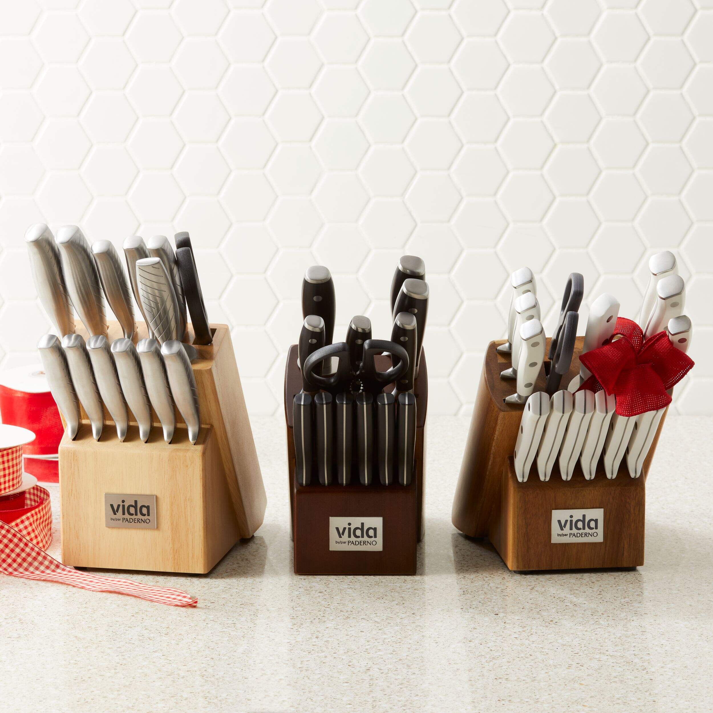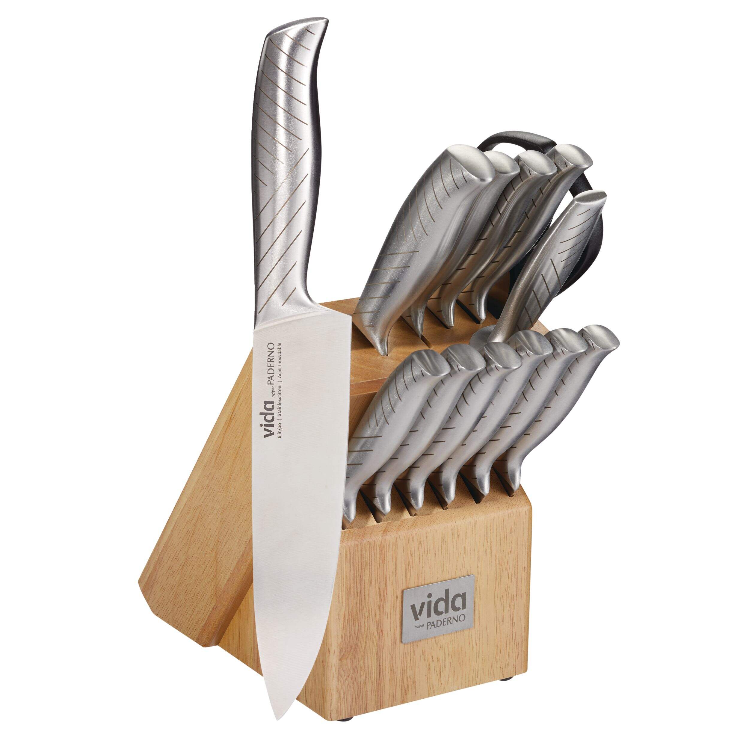 Chopping, dicing and slicing is smooth and easy with the Vida by PADERNO Stainless Steel Knife Block Set. This 14-piece knife set features 11 knives, honing steel, all-purpose shears and a wood block to take care of all your cutting needs. Designed with high-carbon stainless steel, this durable knife set is built to last.