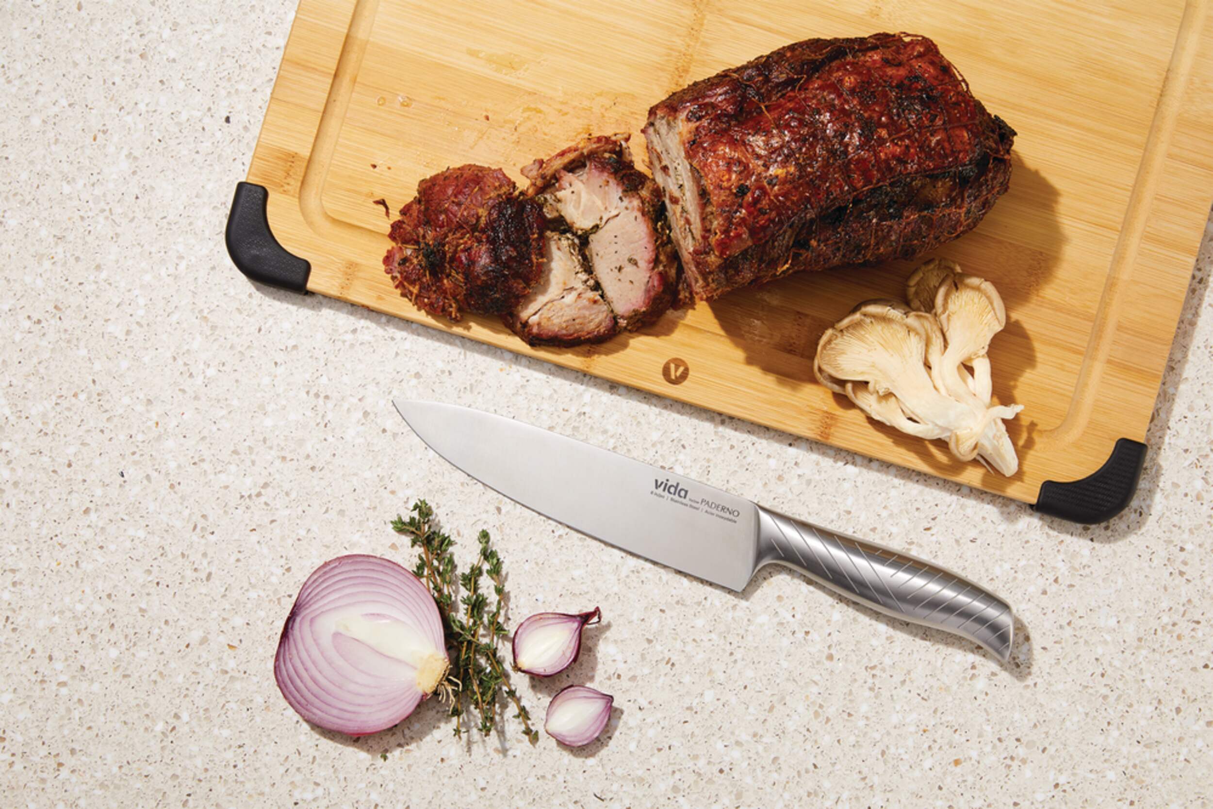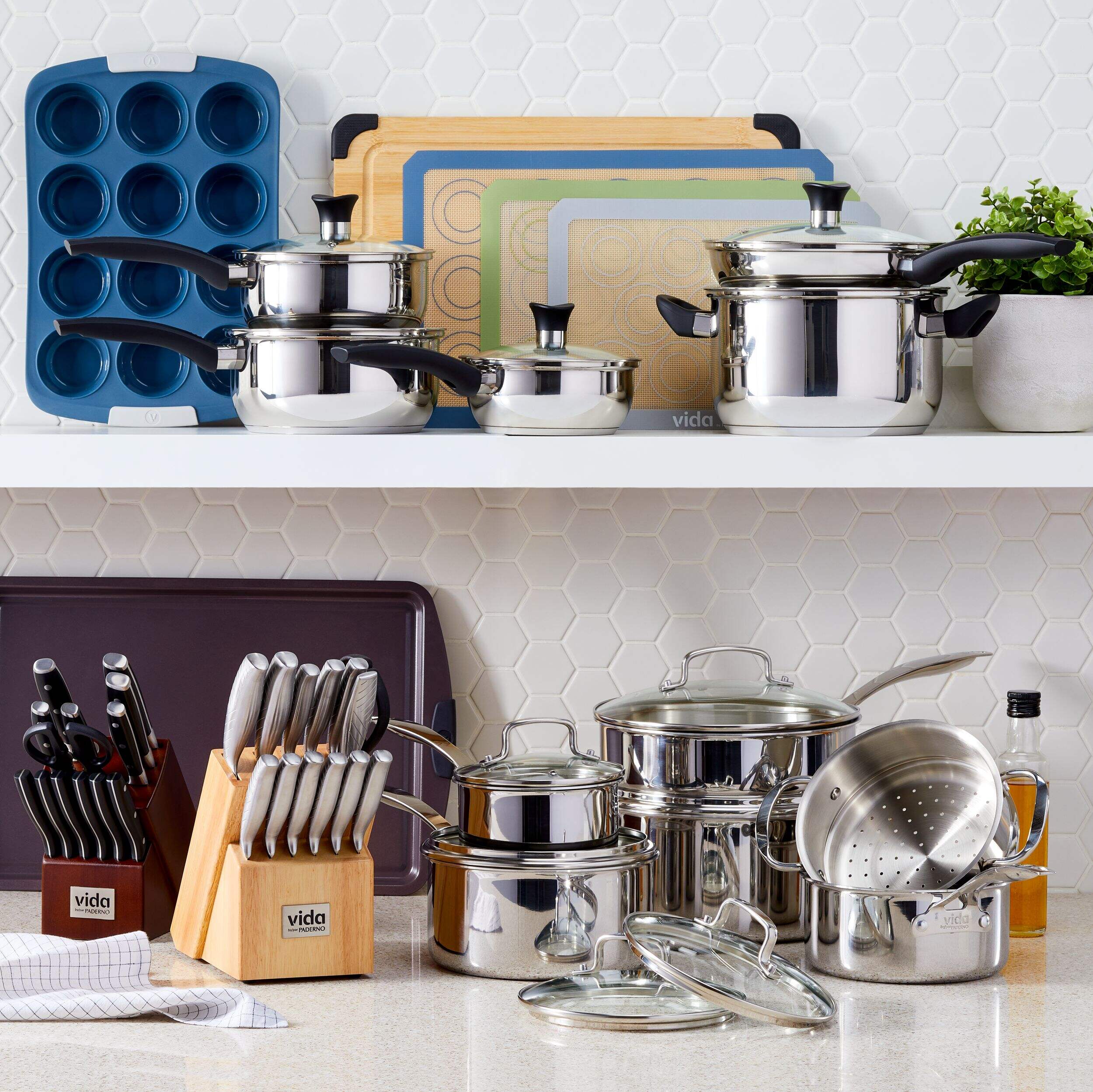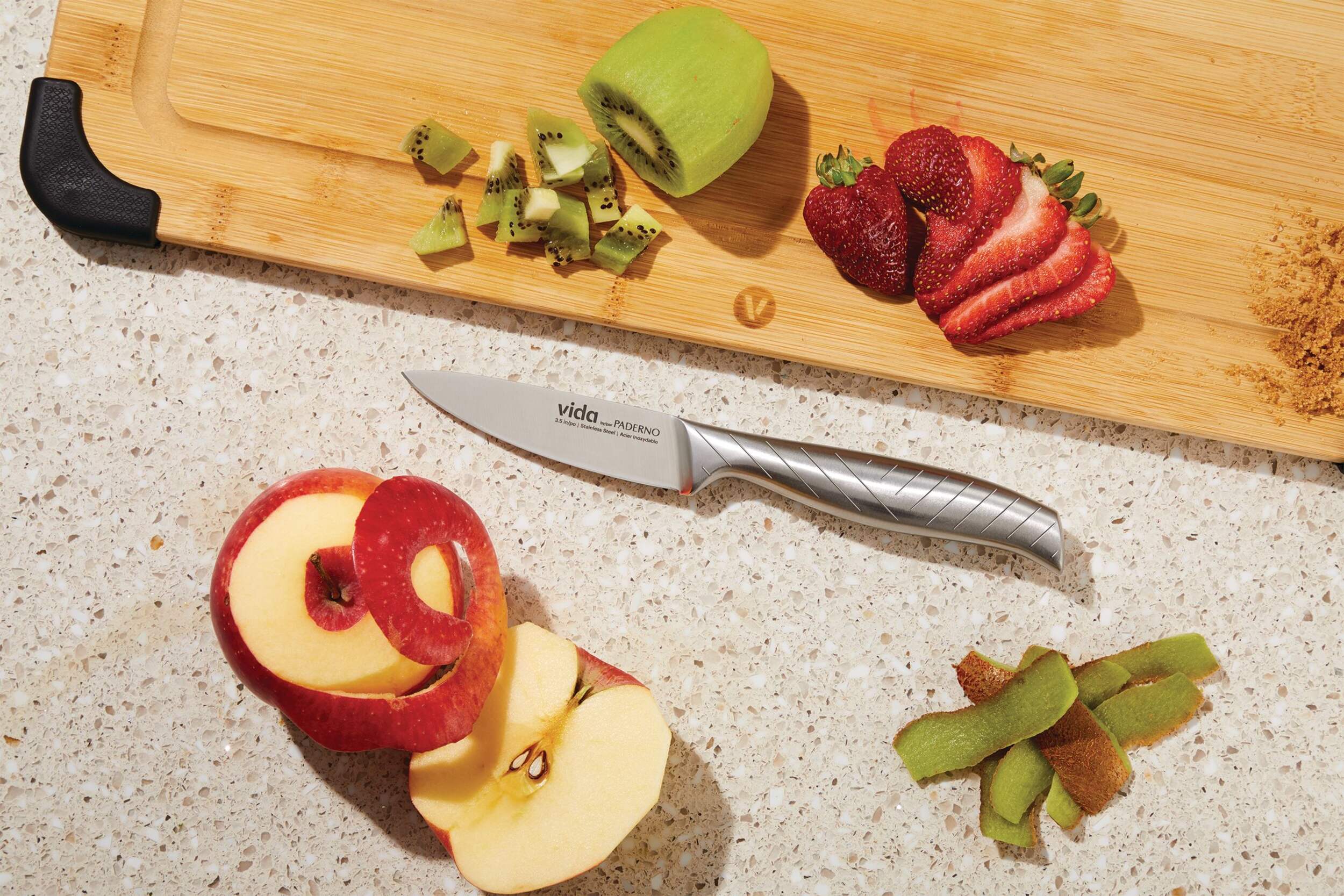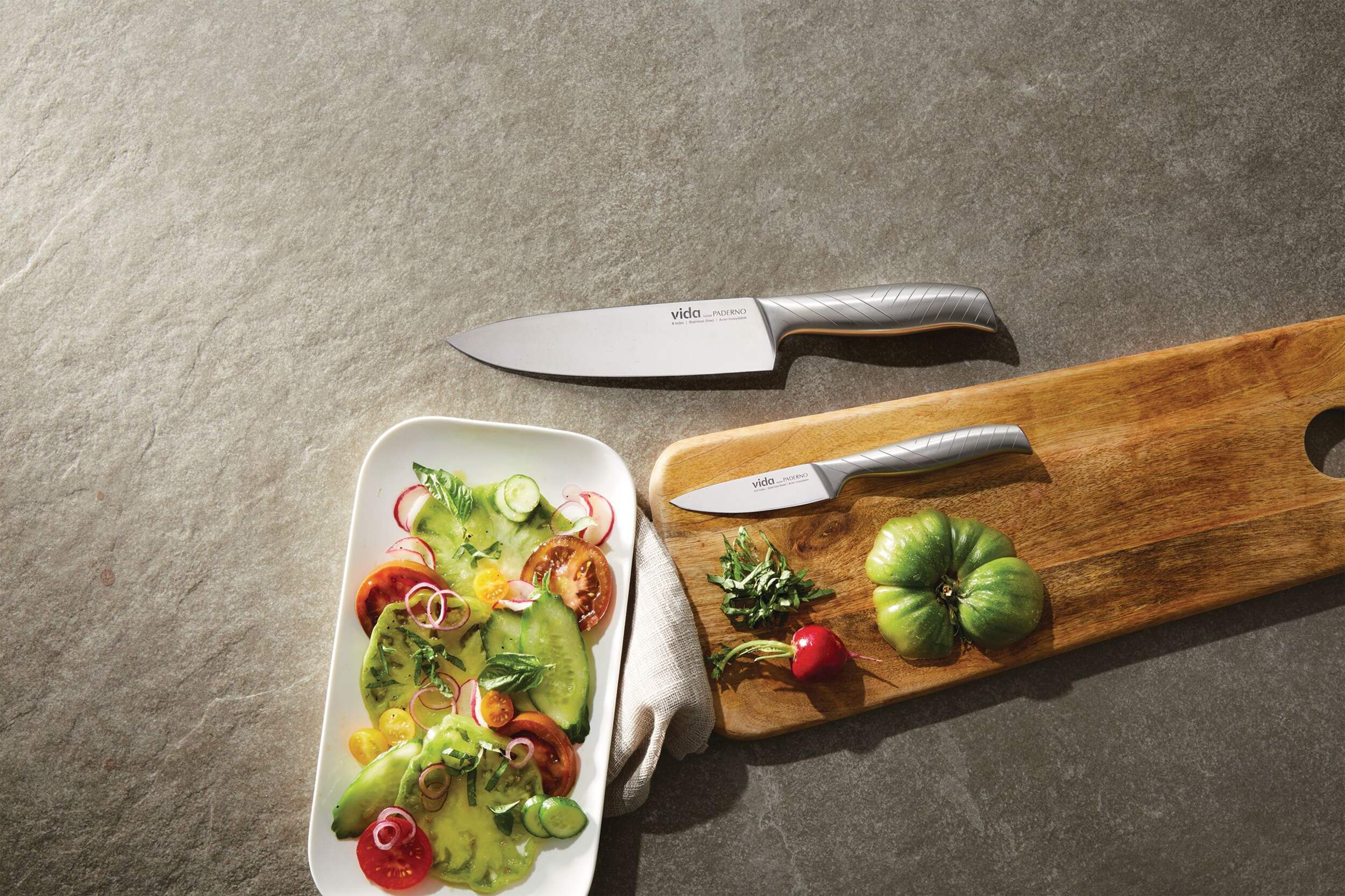 Chopping, dicing and slicing is smooth and easy with the Vida by PADERNO Stainless Steel Knife Block Set. This 14-piece knife set features 11 knives, honing steel, all-purpose shears and a wood block to take care of all your cutting needs. Designed with high-carbon stainless steel, this durable knife set is built to last.