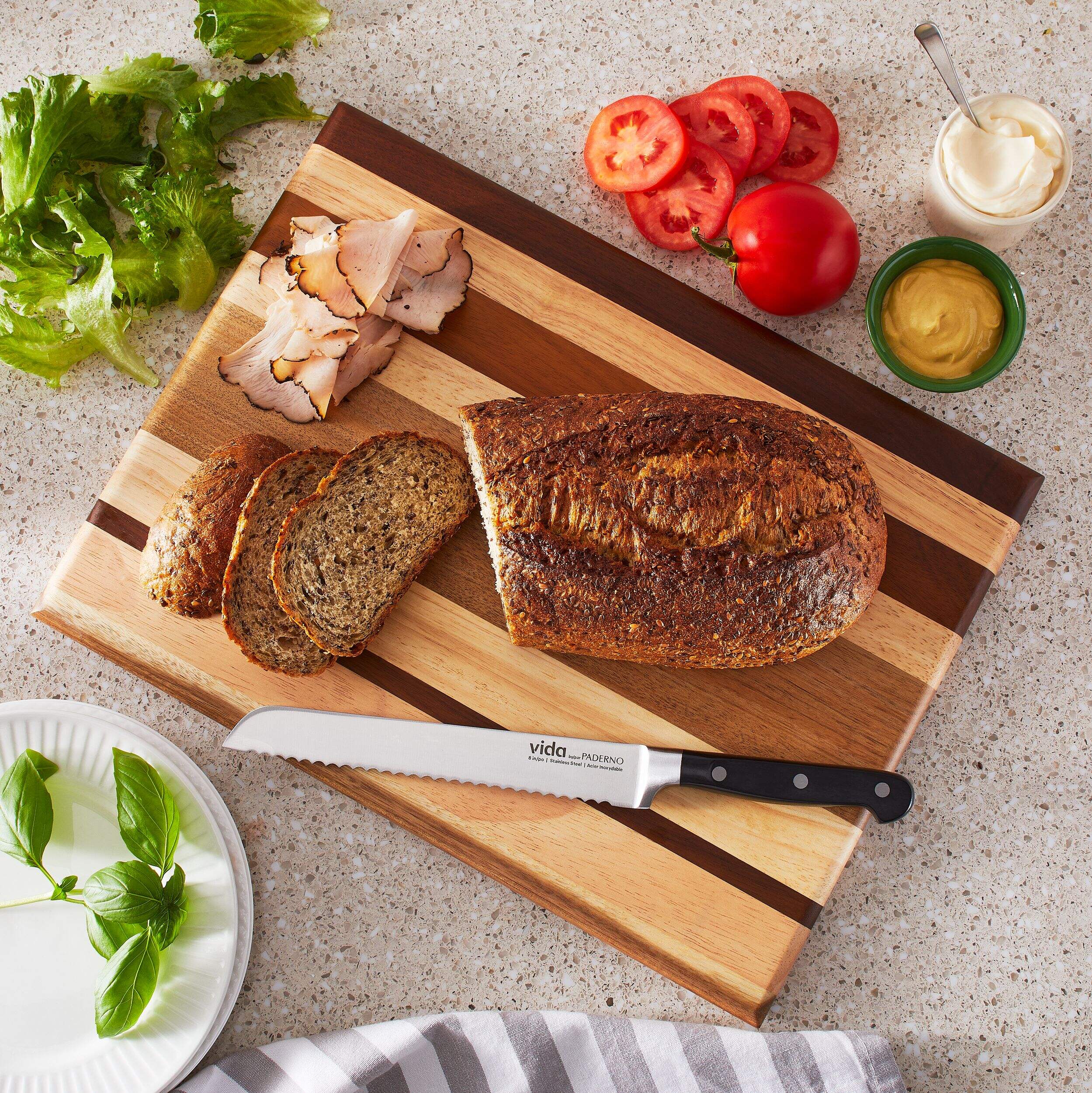 Take care of all your chopping and serving needs with the handy Vida by PADERNO Striped Multi Wood Large Cutting Board. This durable cutting board is lightweight and easy to handle, so you can always serve your appetizers in style. Designed to be easy on knives, this gentle cutting board will help keep knife blades from dulling. Its compact build makes it easy to store when not in use. Hand wash for easy maintenance.