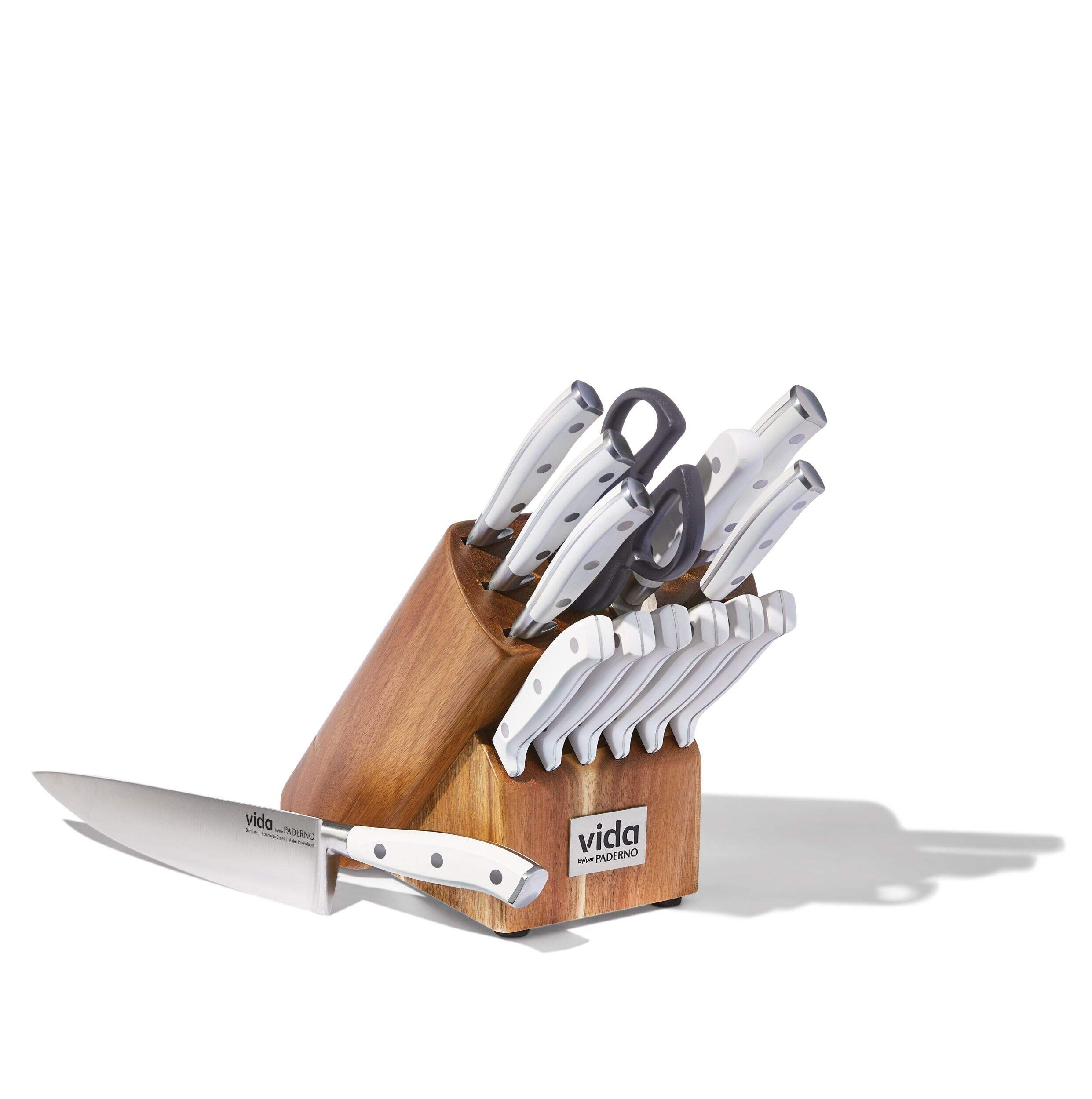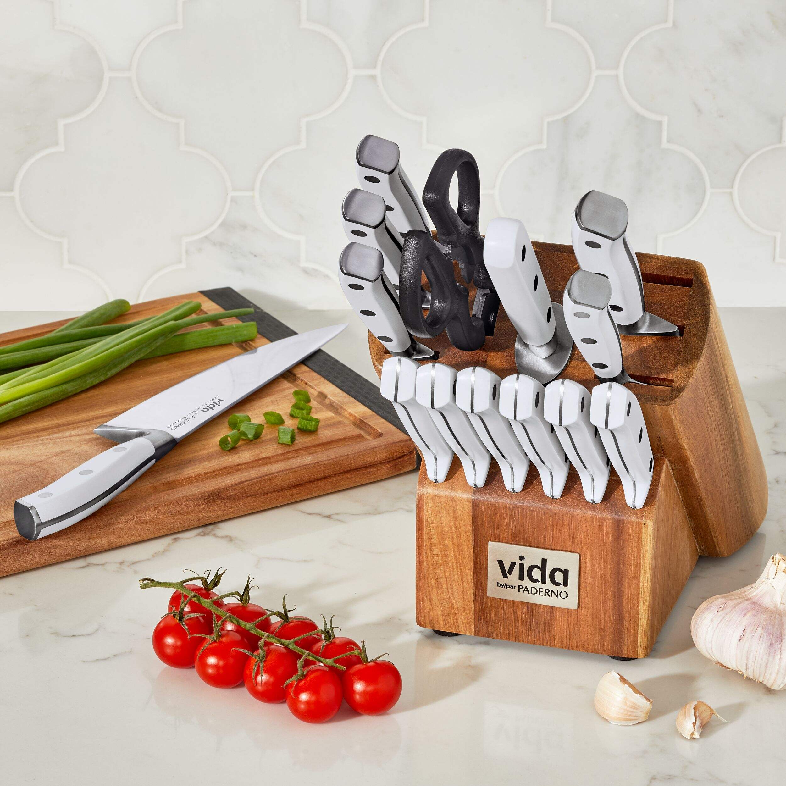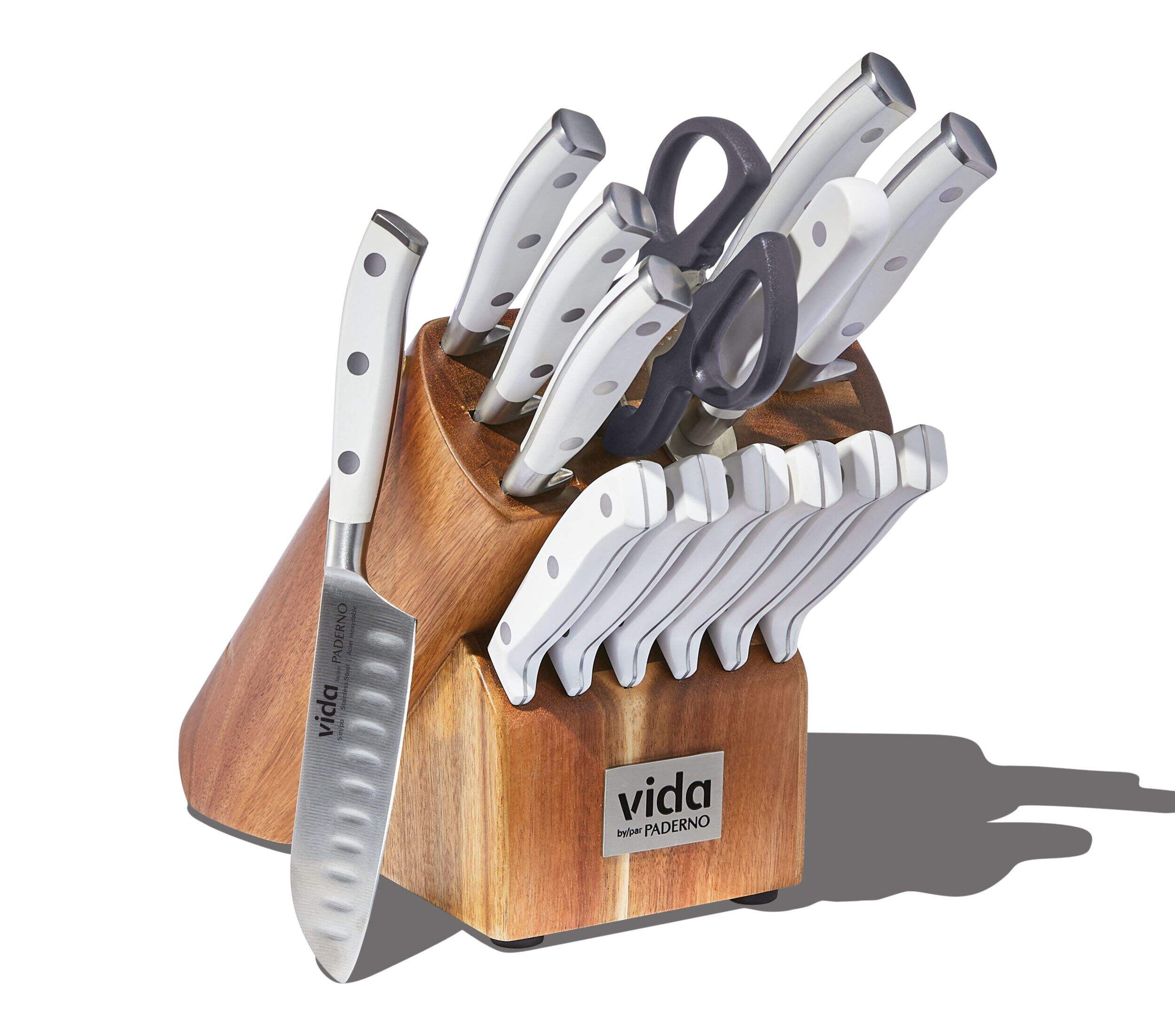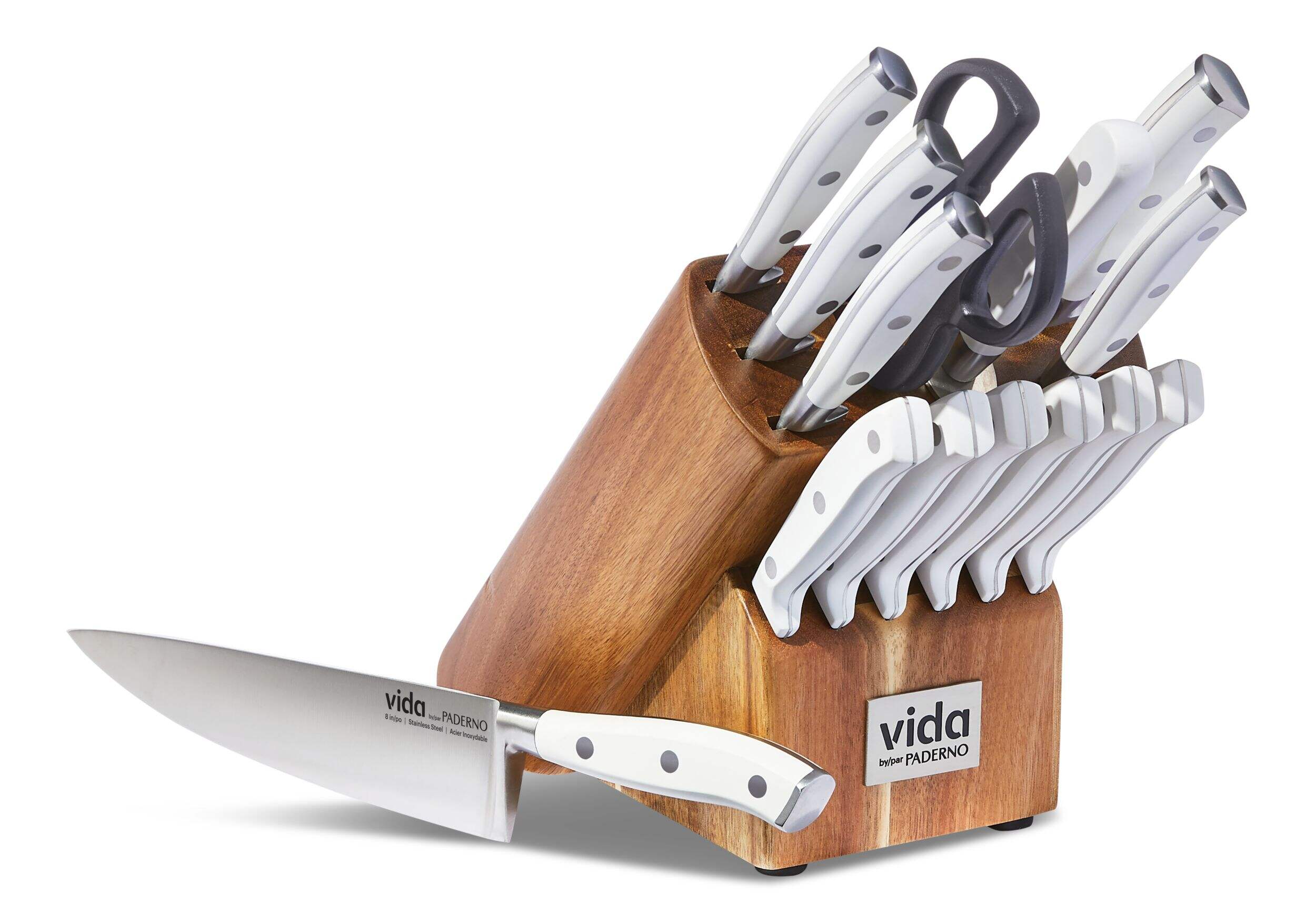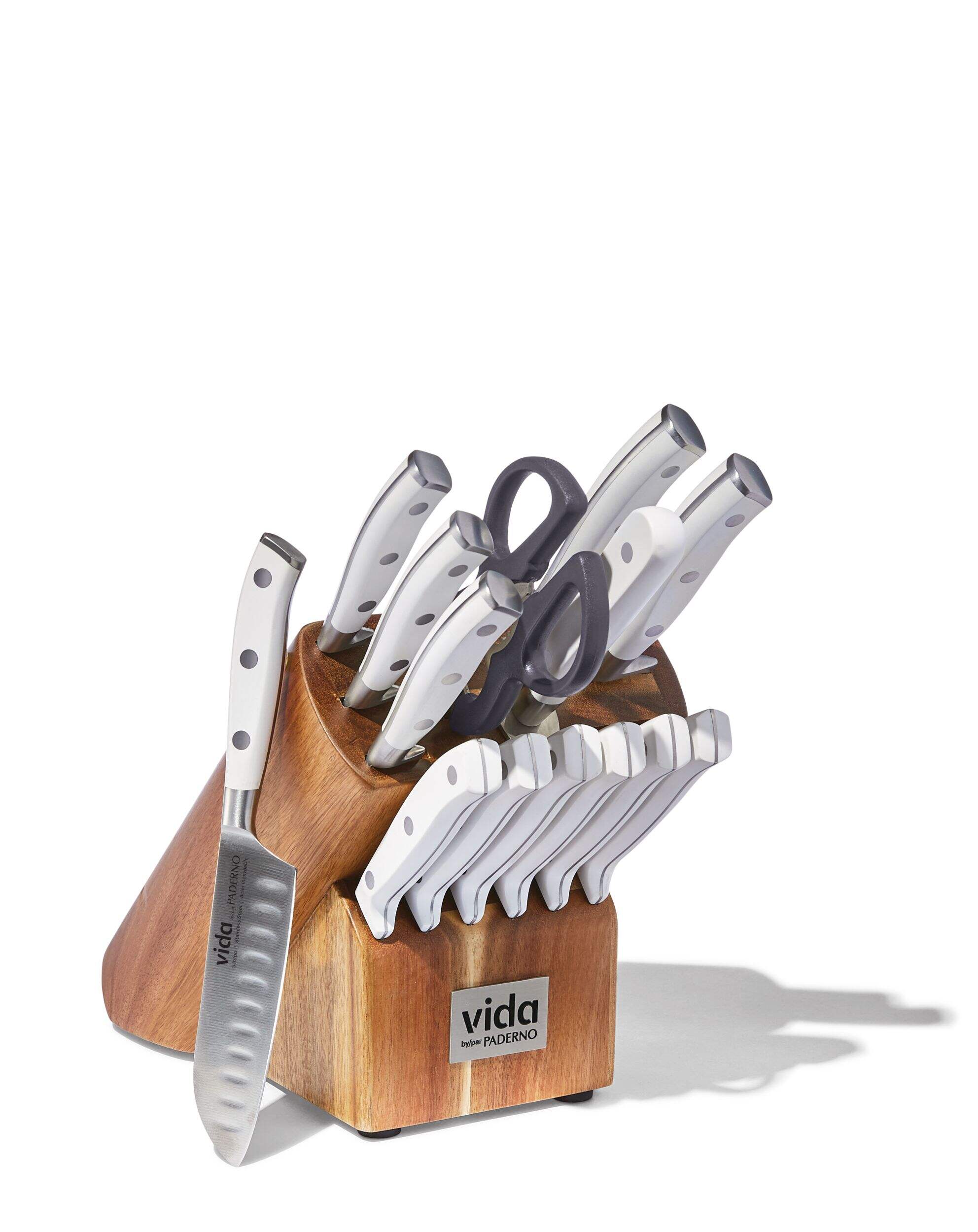 Modern design meets quality craftsmanship in the Vida by PADERNO Knife Set. This 15-piece set is crafted from premium steel with a durable stone finish, offering both sharpness and strength for all your culinary needs. The ergonomic full-tang handles, finished in elegant white, provide a comfortable grip and a striking contrast against the stone finish. Stored conveniently in a sleek slotted block, this knife set combines sophistication and functionality, making it an eye-catching addition to any countertop.