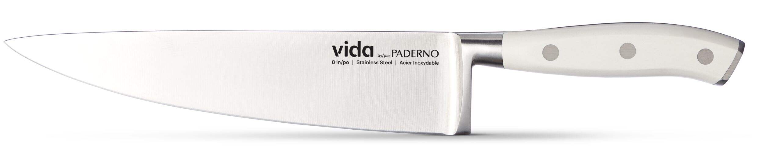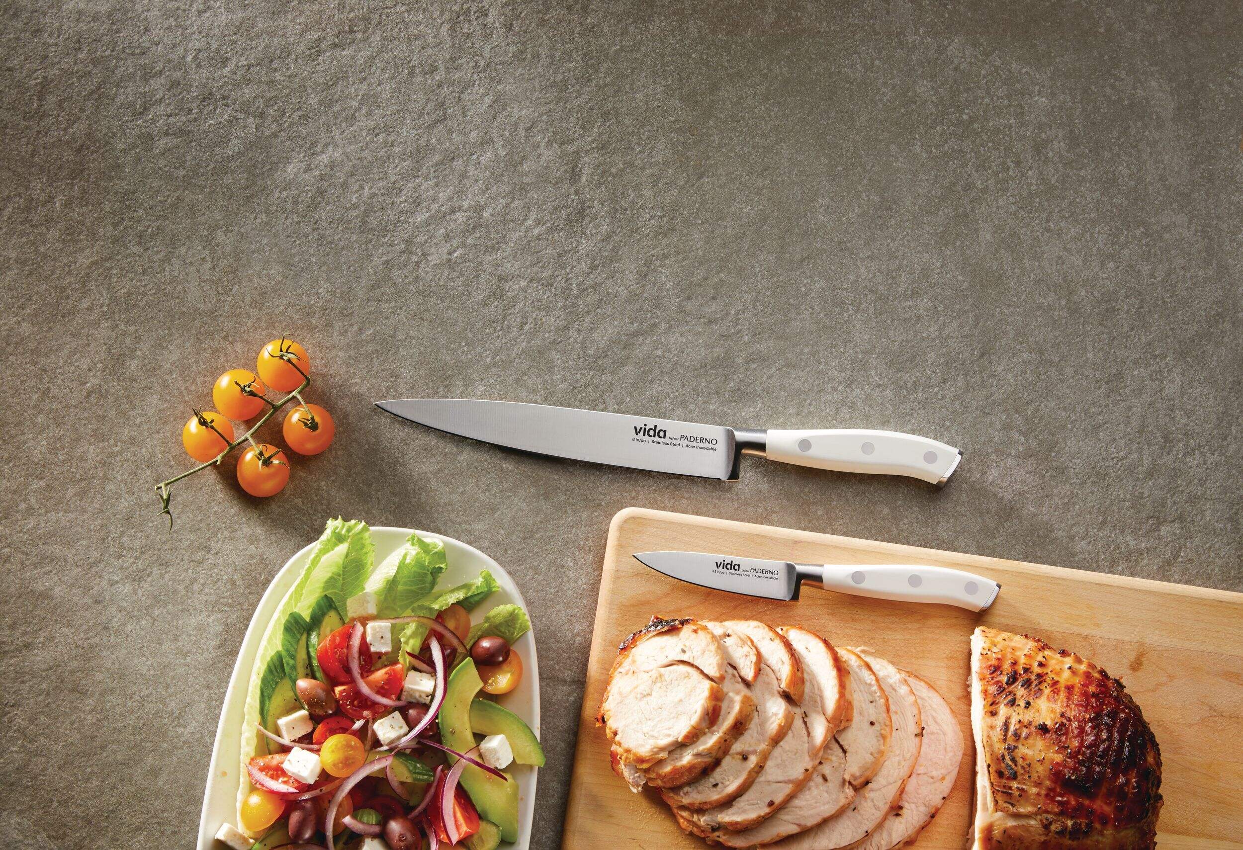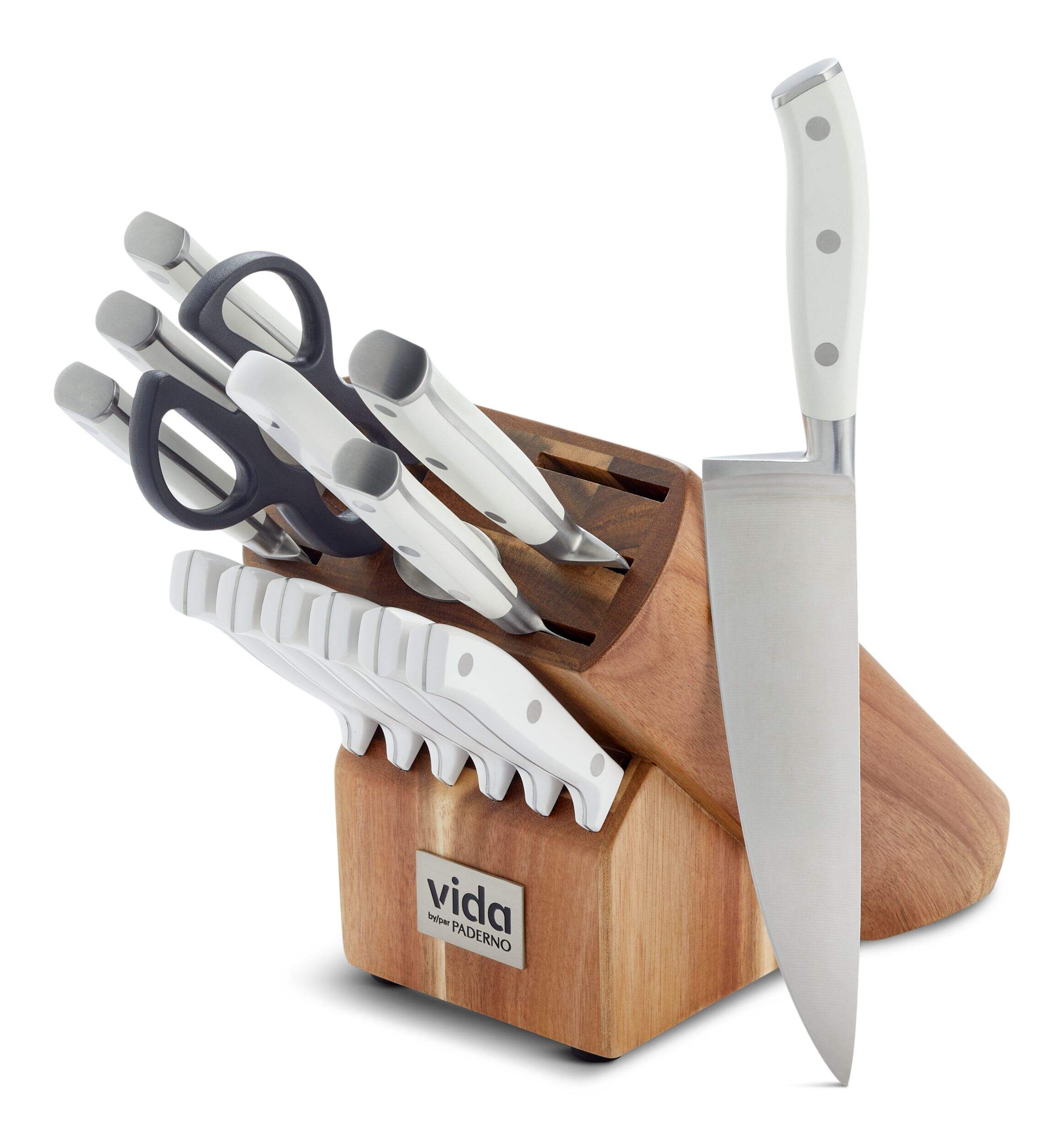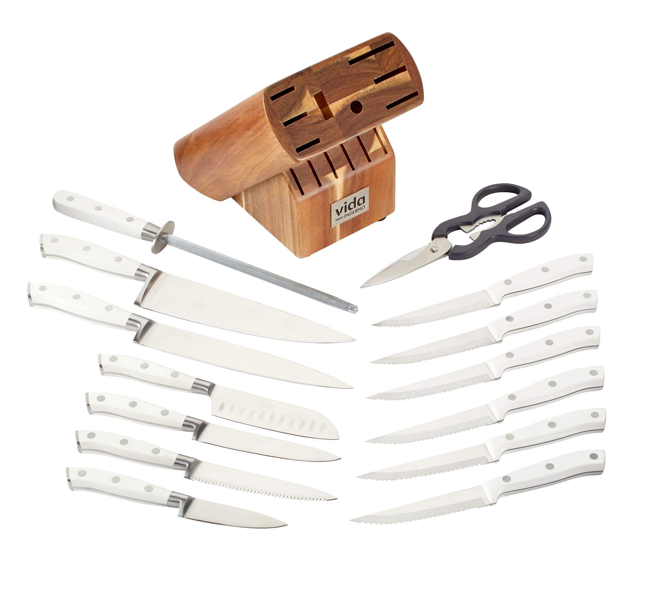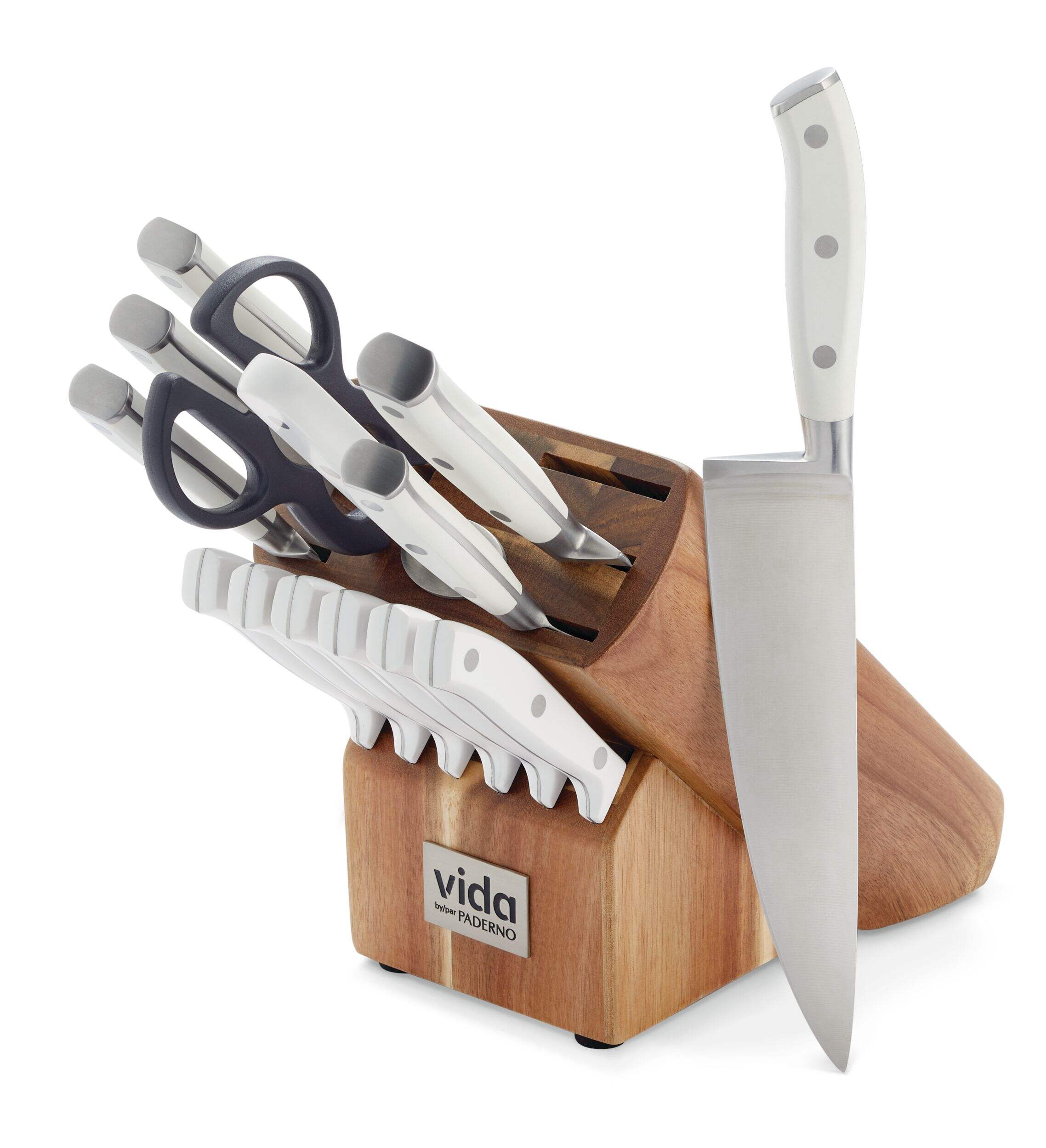 Modern design meets quality craftsmanship in the Vida by PADERNO Knife Set. This 15-piece set is crafted from premium steel with a durable stone finish, offering both sharpness and strength for all your culinary needs. The ergonomic full-tang handles, finished in elegant white, provide a comfortable grip and a striking contrast against the stone finish. Stored conveniently in a sleek slotted block, this knife set combines sophistication and functionality, making it an eye-catching addition to any countertop.