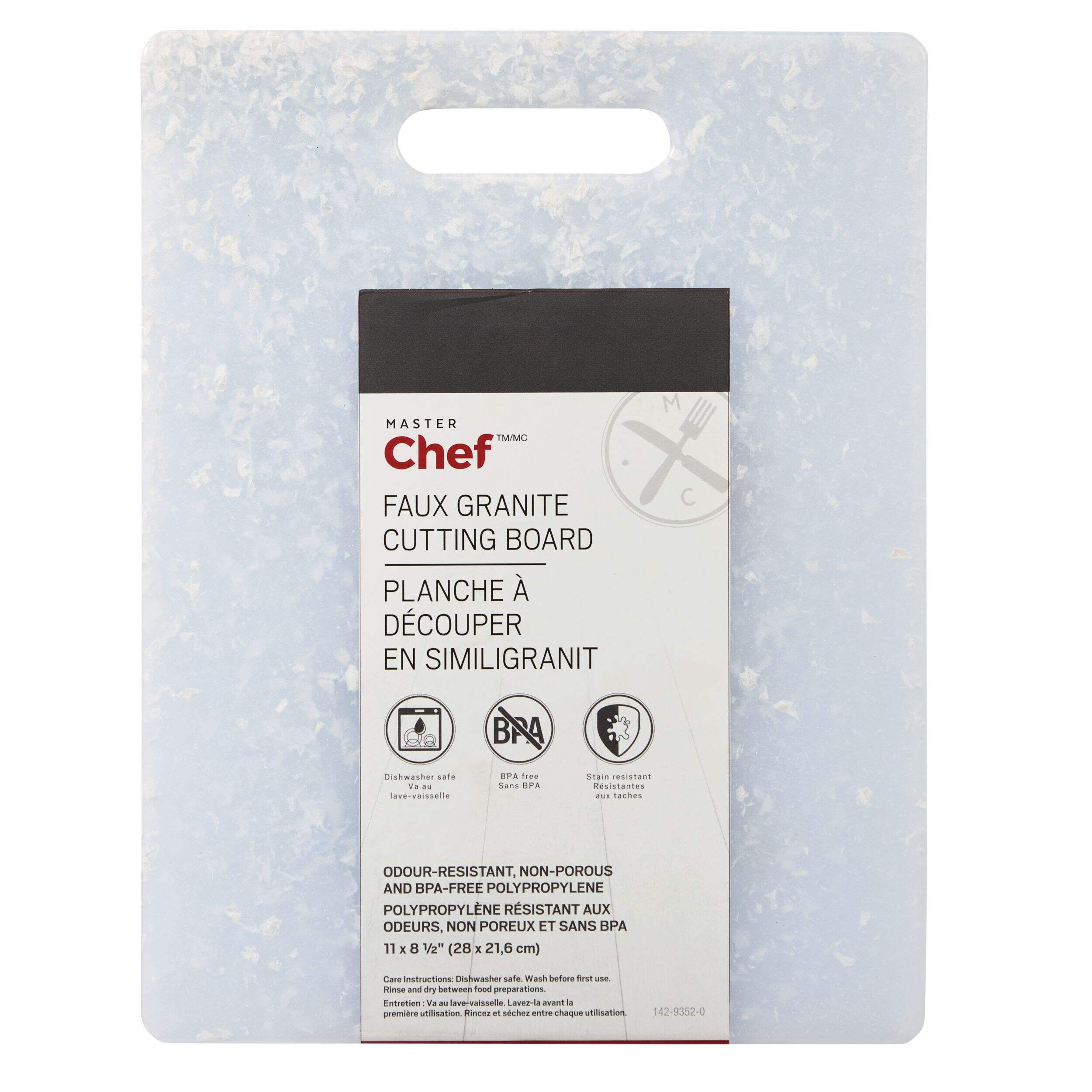 Chop veggies while protecting your counter tops with this MASTER Chef Faux Granite Cutting Board. It features a realistic granite finish that will not warp, crack, or split for lasting functionality. This cutting board is made for durability and is suitable for use with any knife. It's also fully dishwasher safe and won't hold on to odours – even from foods like onion or garlic – so it's fresh and ready to use when you need it.