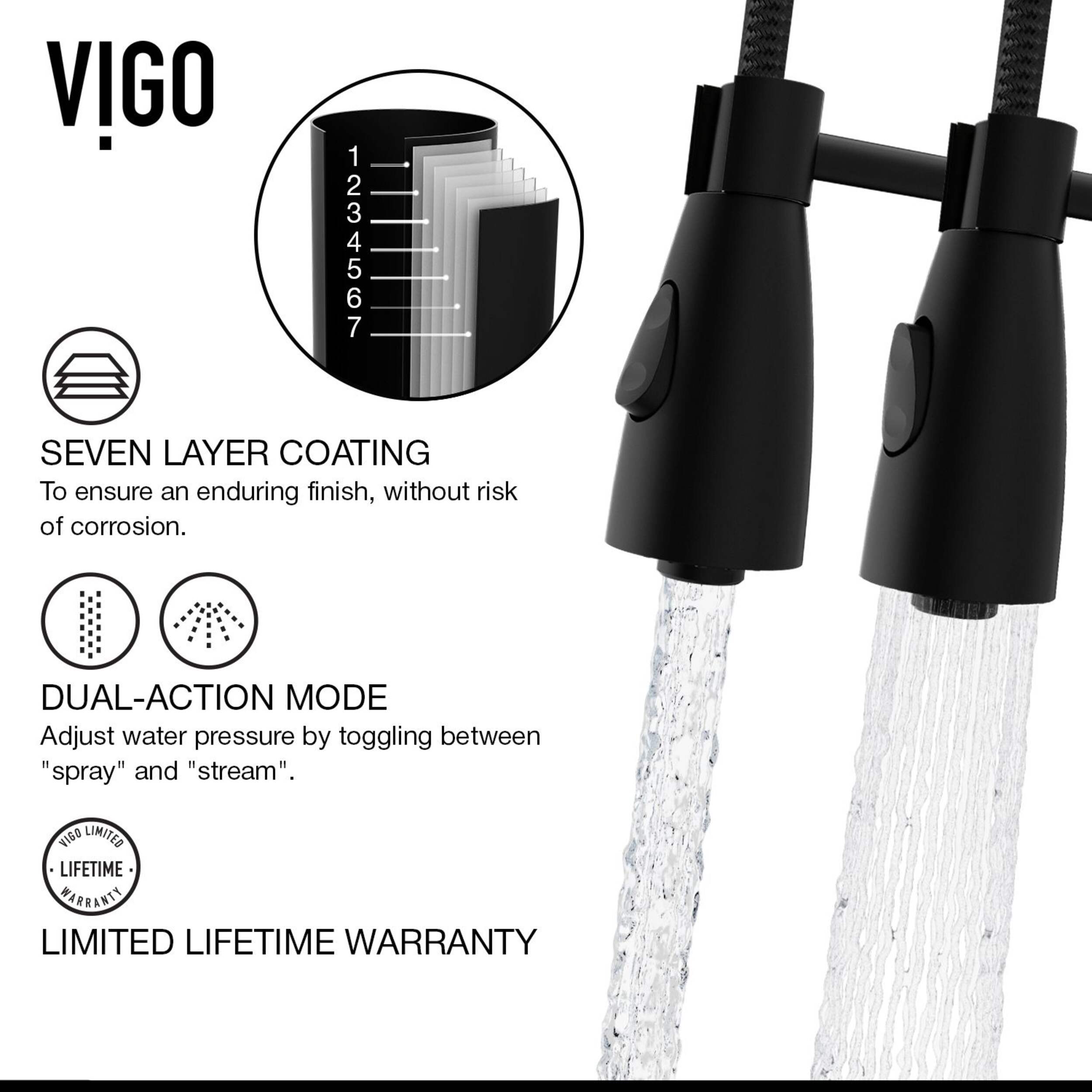 Engineering excellence meets creative hardware in the VIGO Brant Pull-Down Spray Kitchen Faucet. The dual-functioning, pull-down spray head allows for either a powerful or aerated flow and extends up to 30" with 360° swivel capabilities.