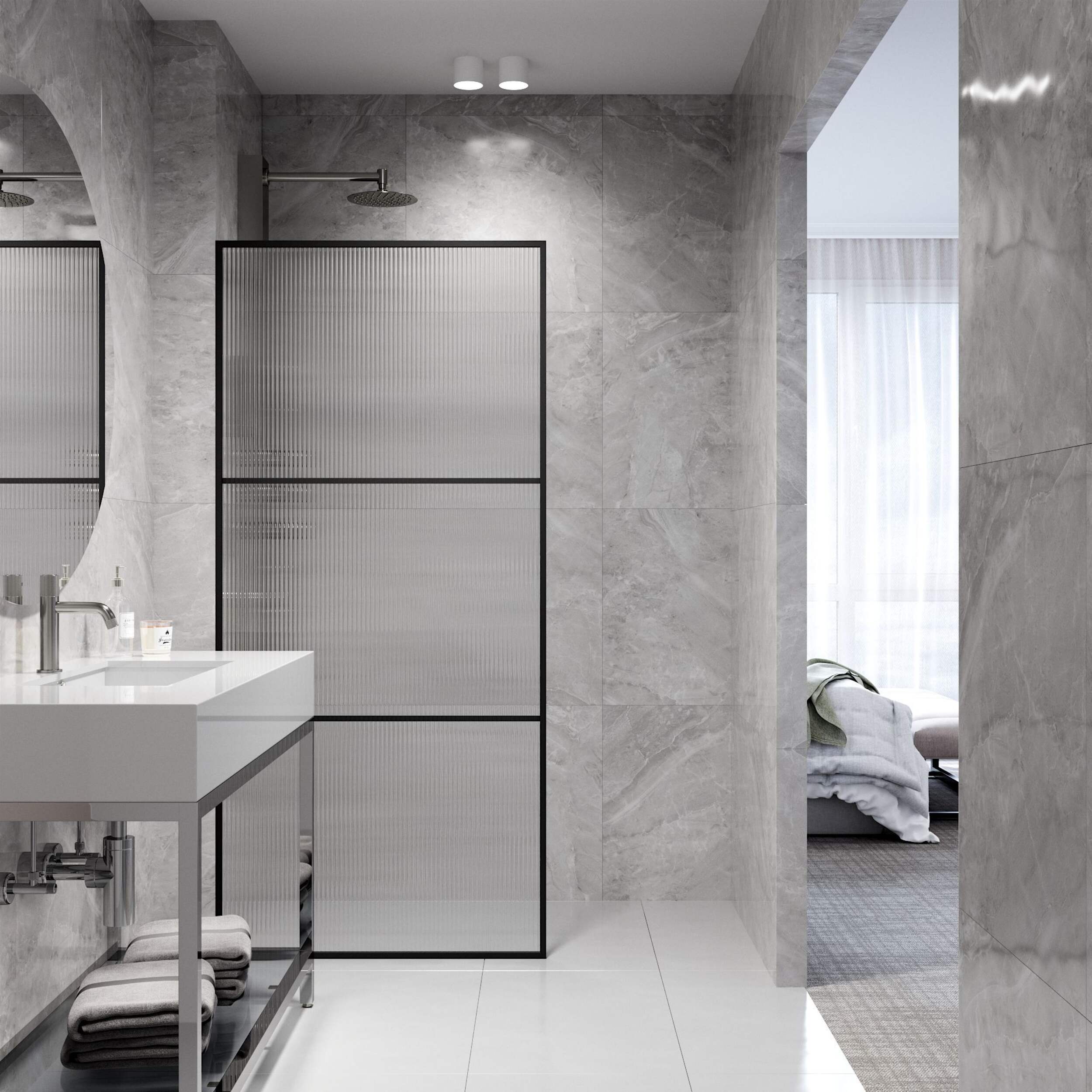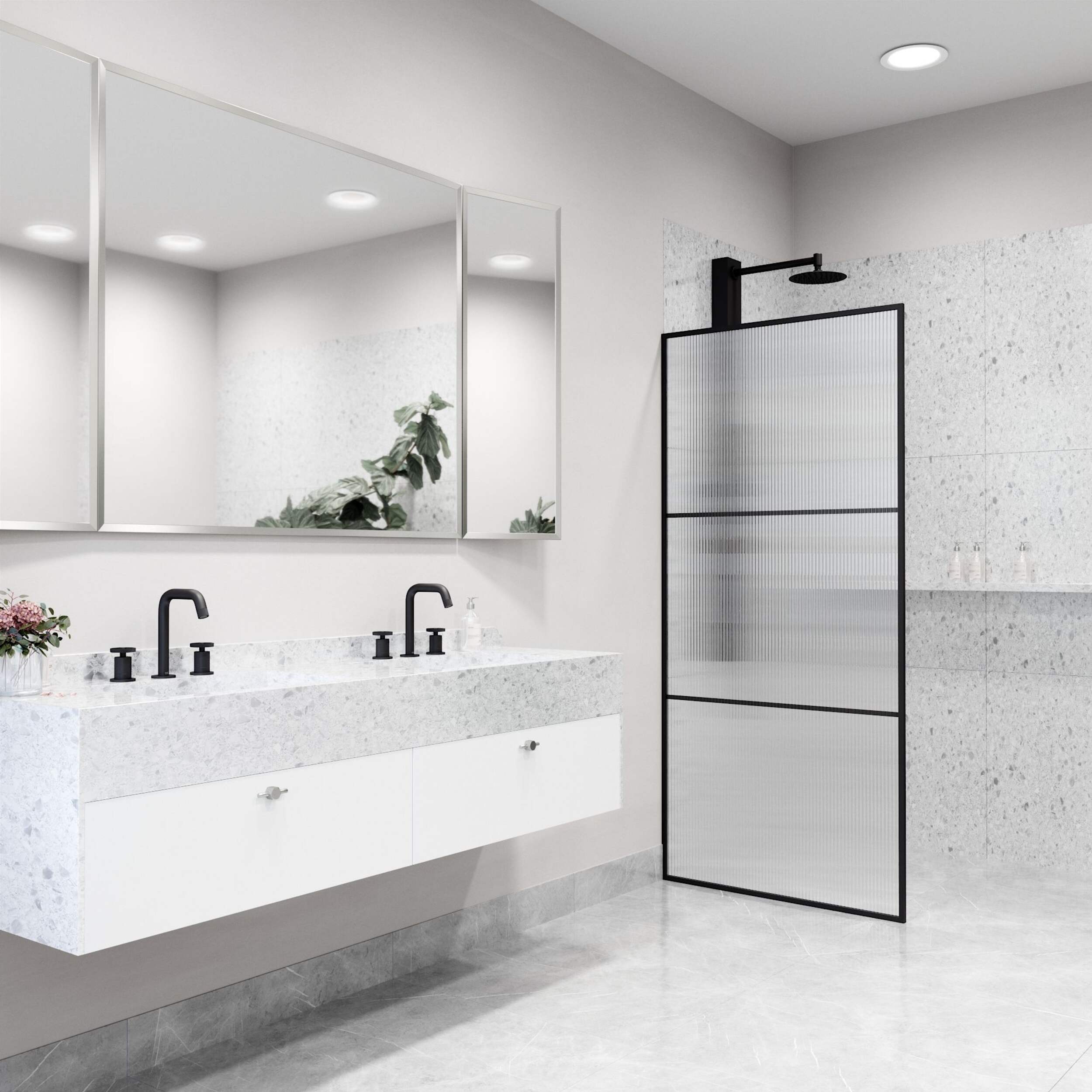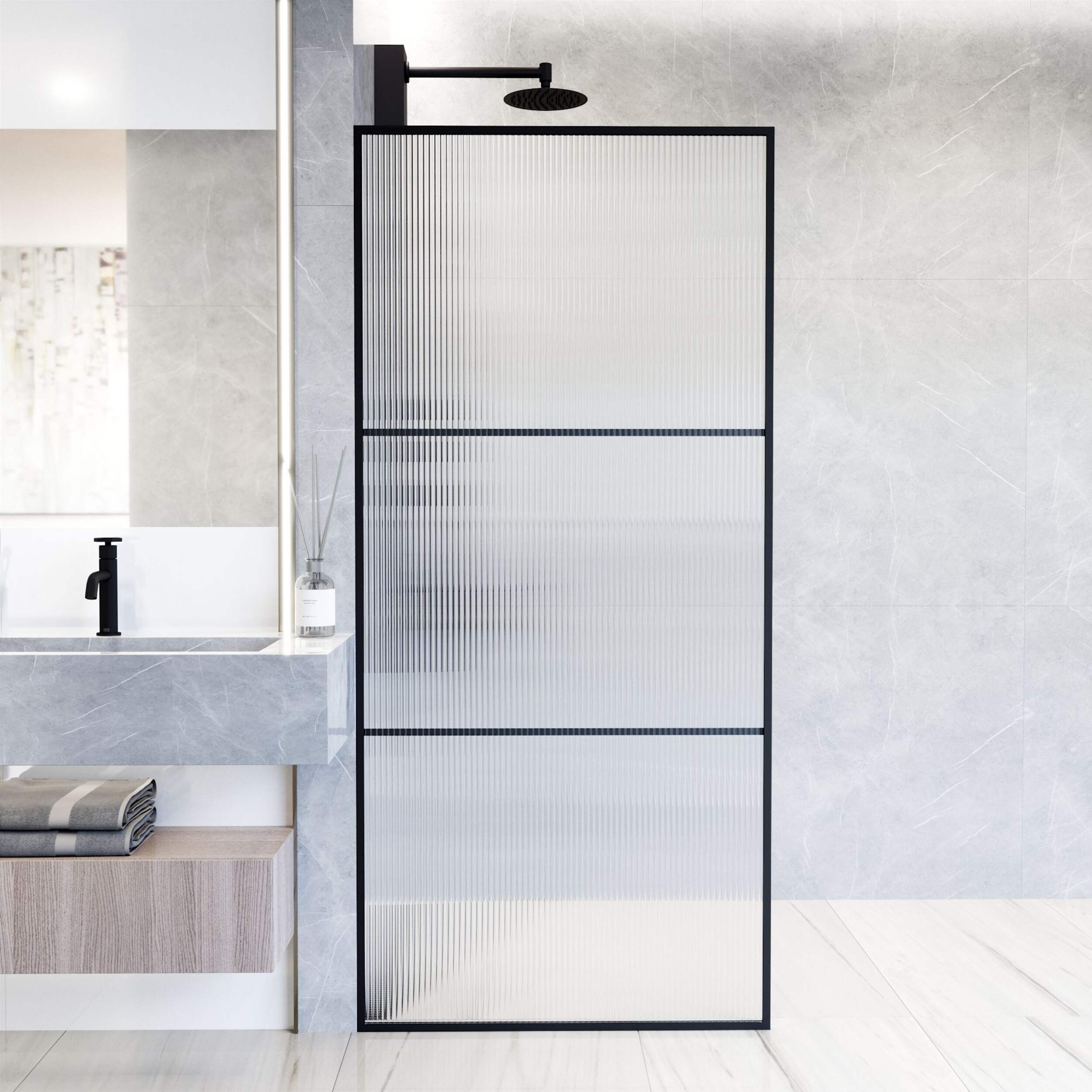 FIXED SHOWER DOOR: This 34" W x 74" H framed fluted glass shower screen features a sleek, minimalistic appearance with a doorless walk-through design for a modern, open feel
